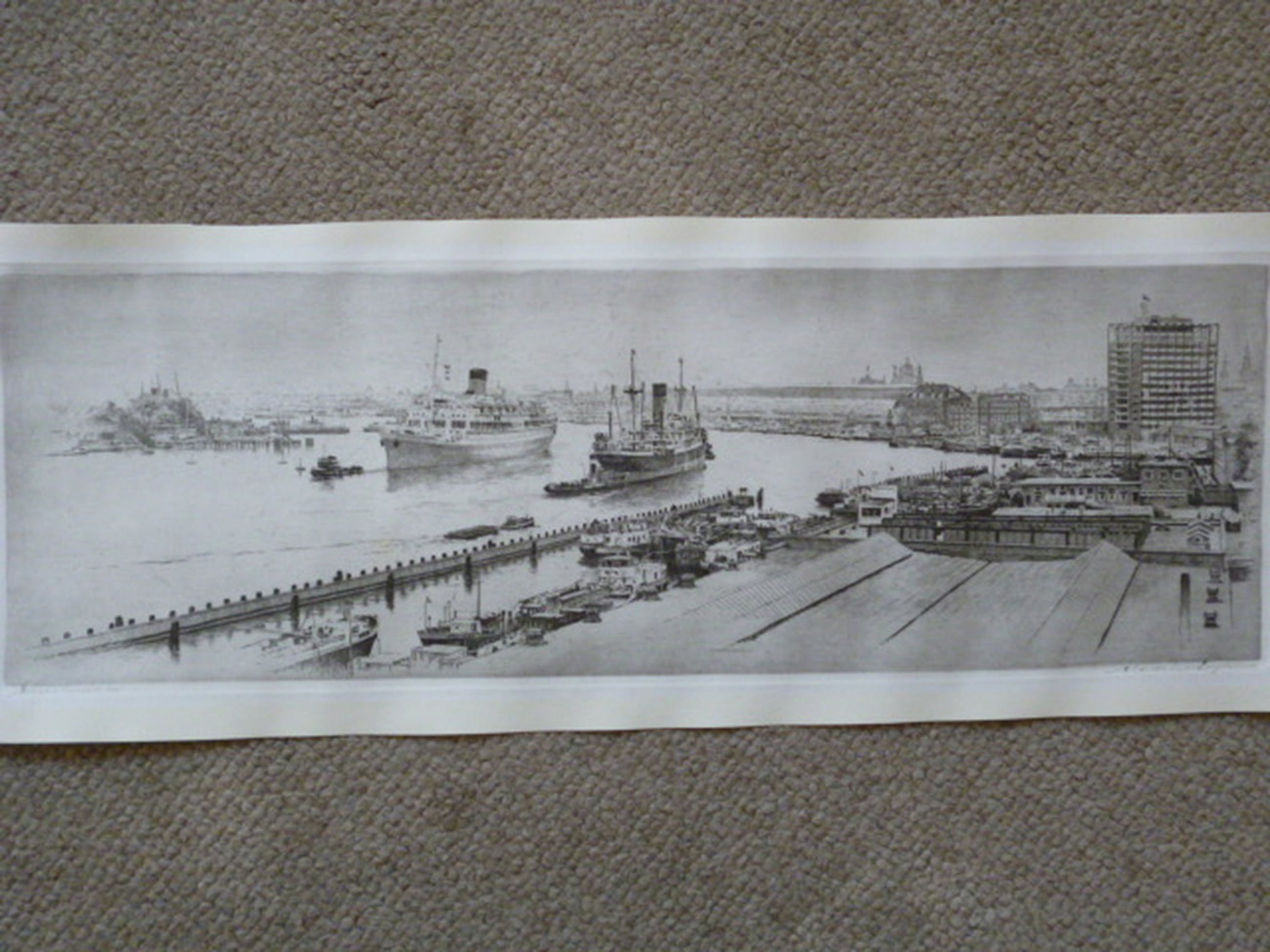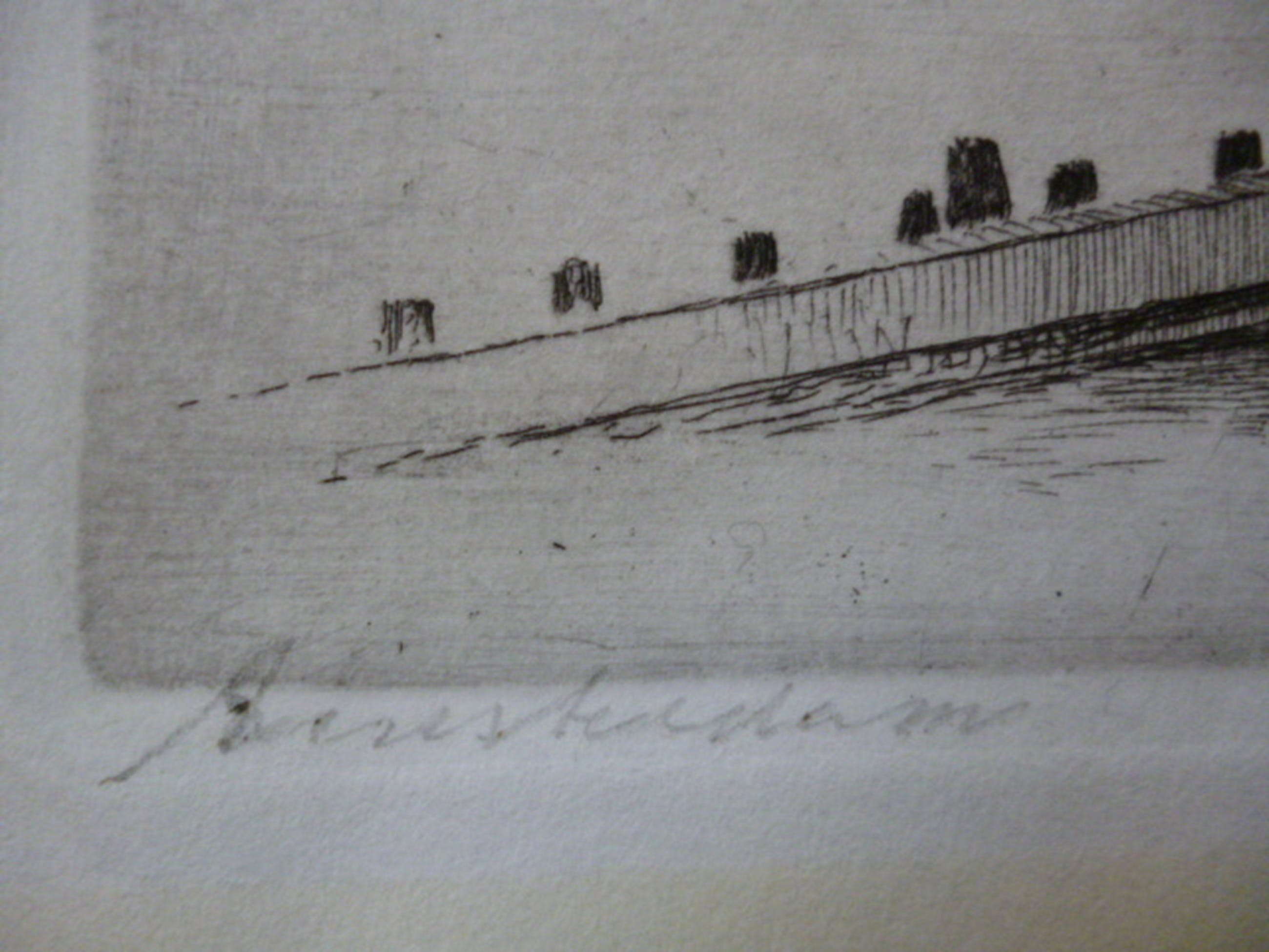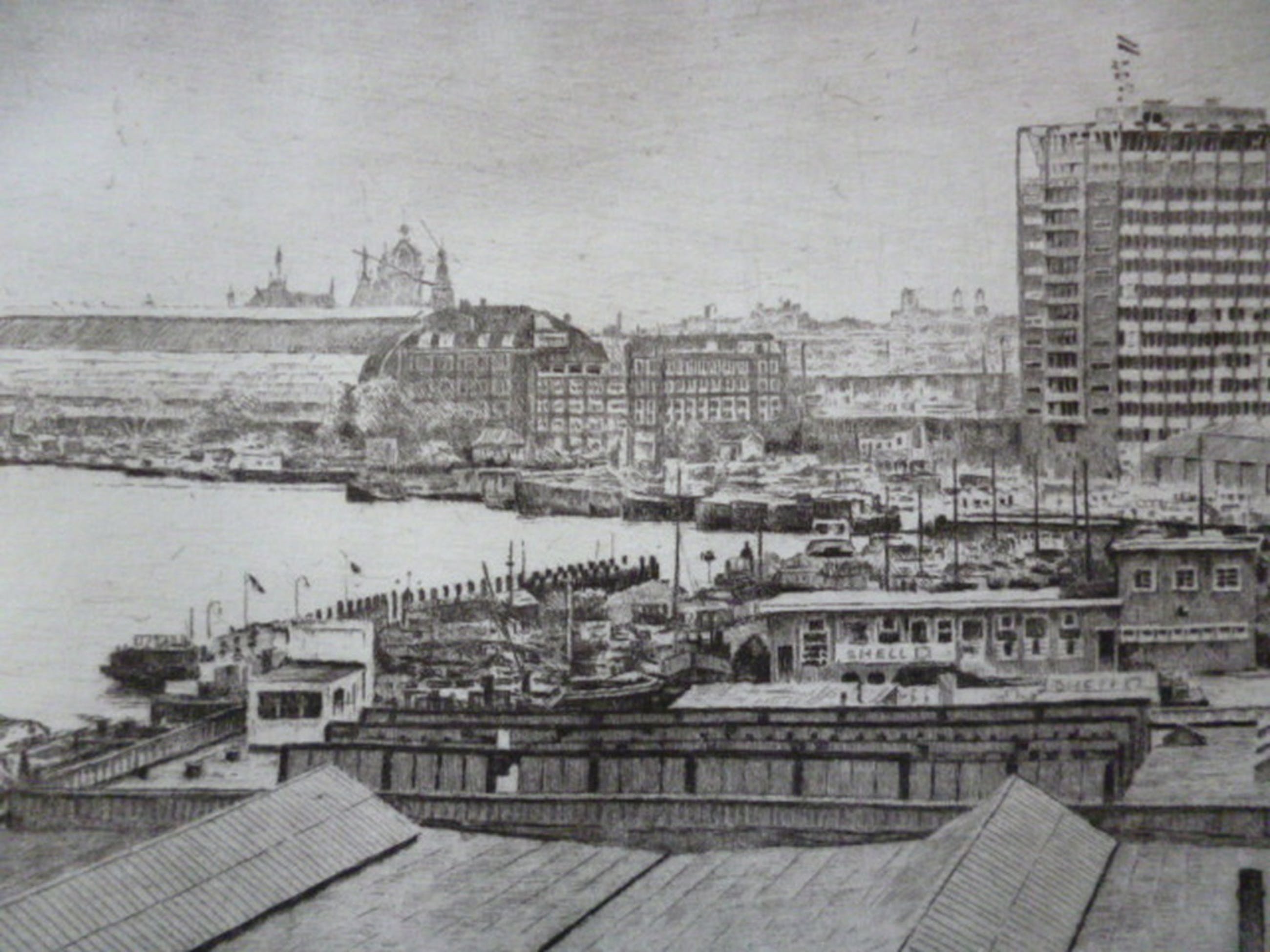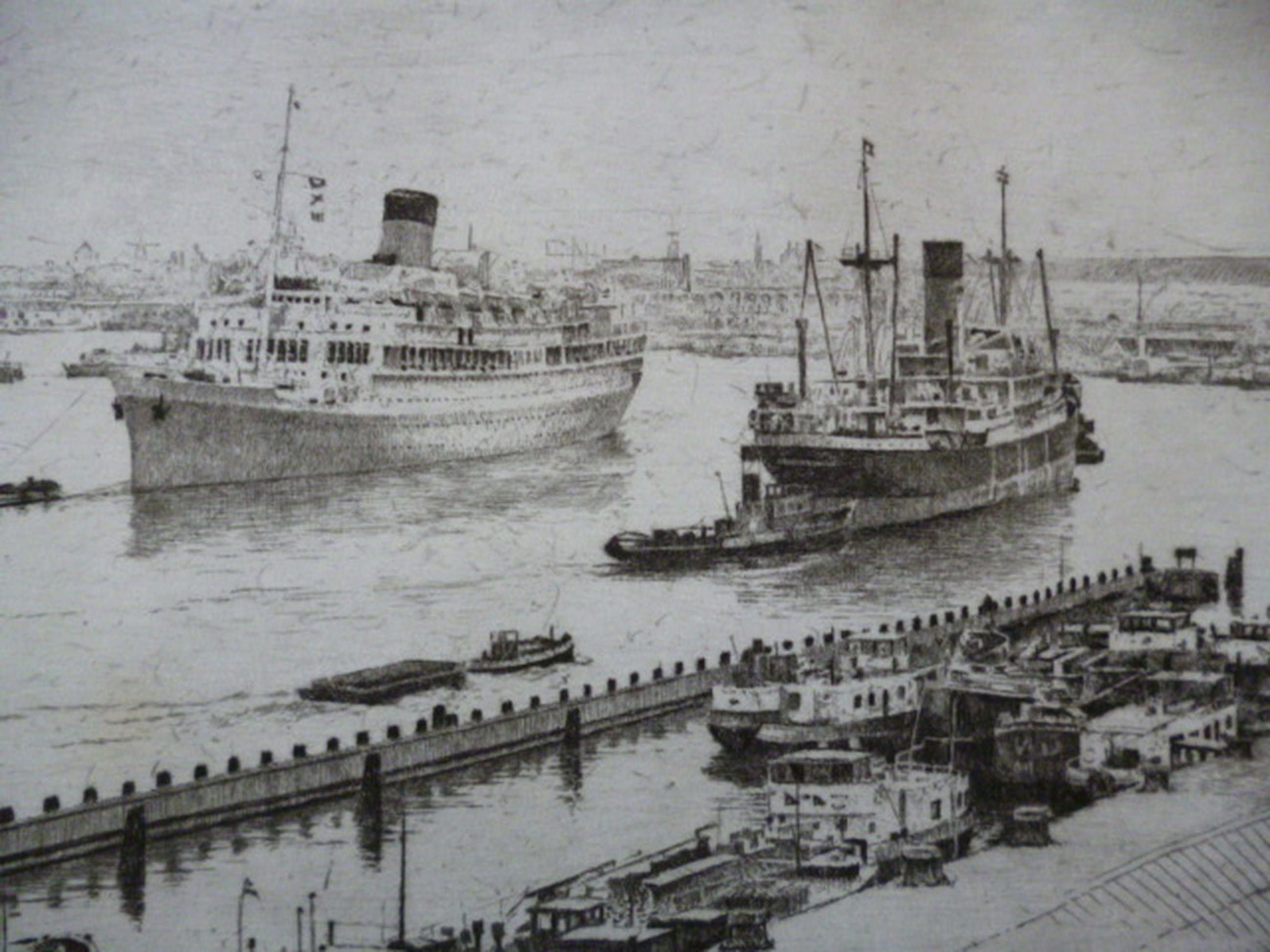 Ets met een gezicht op het IJ met o.a. passagiersschip de "Oranje" en het Centraal Station. Potlood gesigneerd rechtsonder.