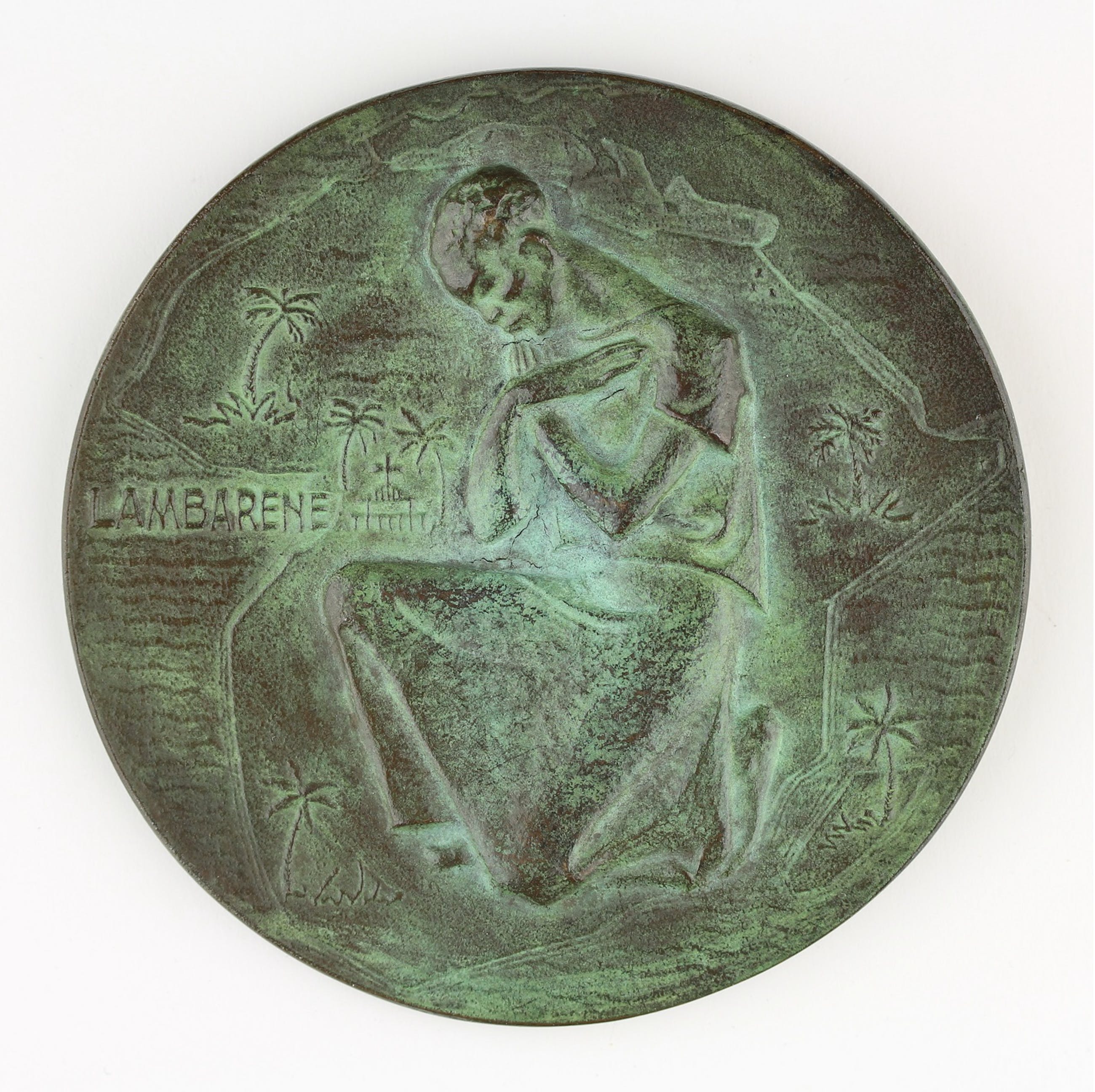 Onderstaande tekst komt uit overzicht van penningen van Maarten Pauw uit een oude Beeldenaar: Dr. Albert Schweitzer. Vz. Kop naar rechts en randschrift (= titel). Kz. Negervrouw in devote houding naar links geknield bij een palmboompje en een lazaret, met de kaart van Afrika en tekst (Lambarene).