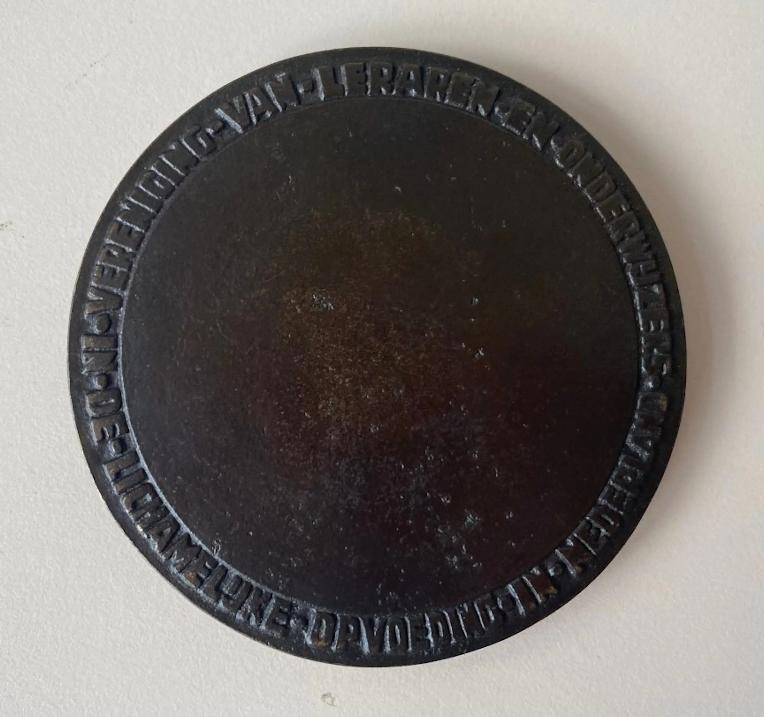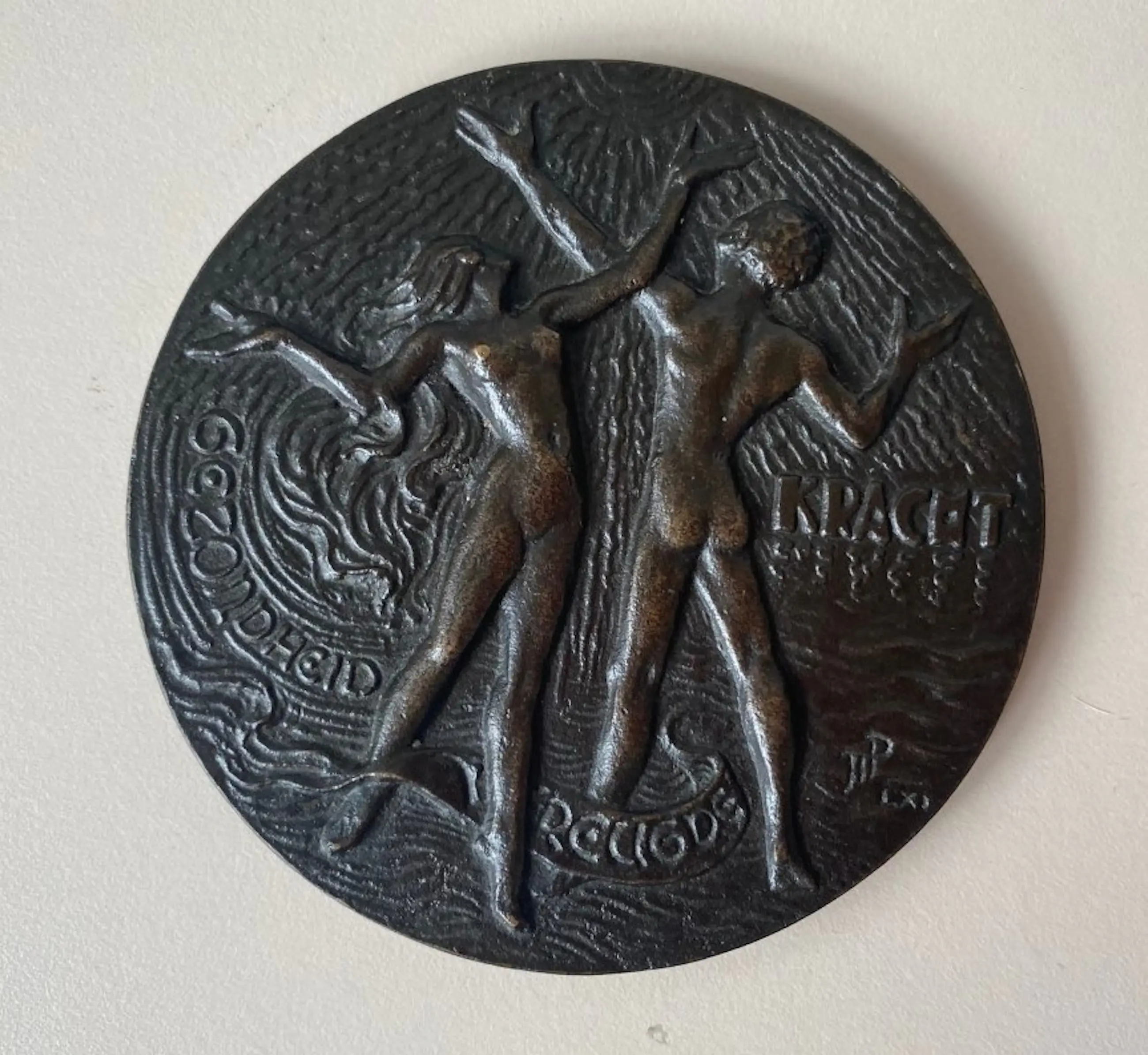 Brons gegoten prijspenning Koninklijke vereniging van leraren en onderwijzers in de lichamelijke opvoeding. Aan de voorzijde staan een naakte vrouw en man de zon aanbiddend. Aan de keerzijde staat de volgende tekst; "Vereniging van leraren en onderwijzers in de lichamelijke oefening in Nederland".