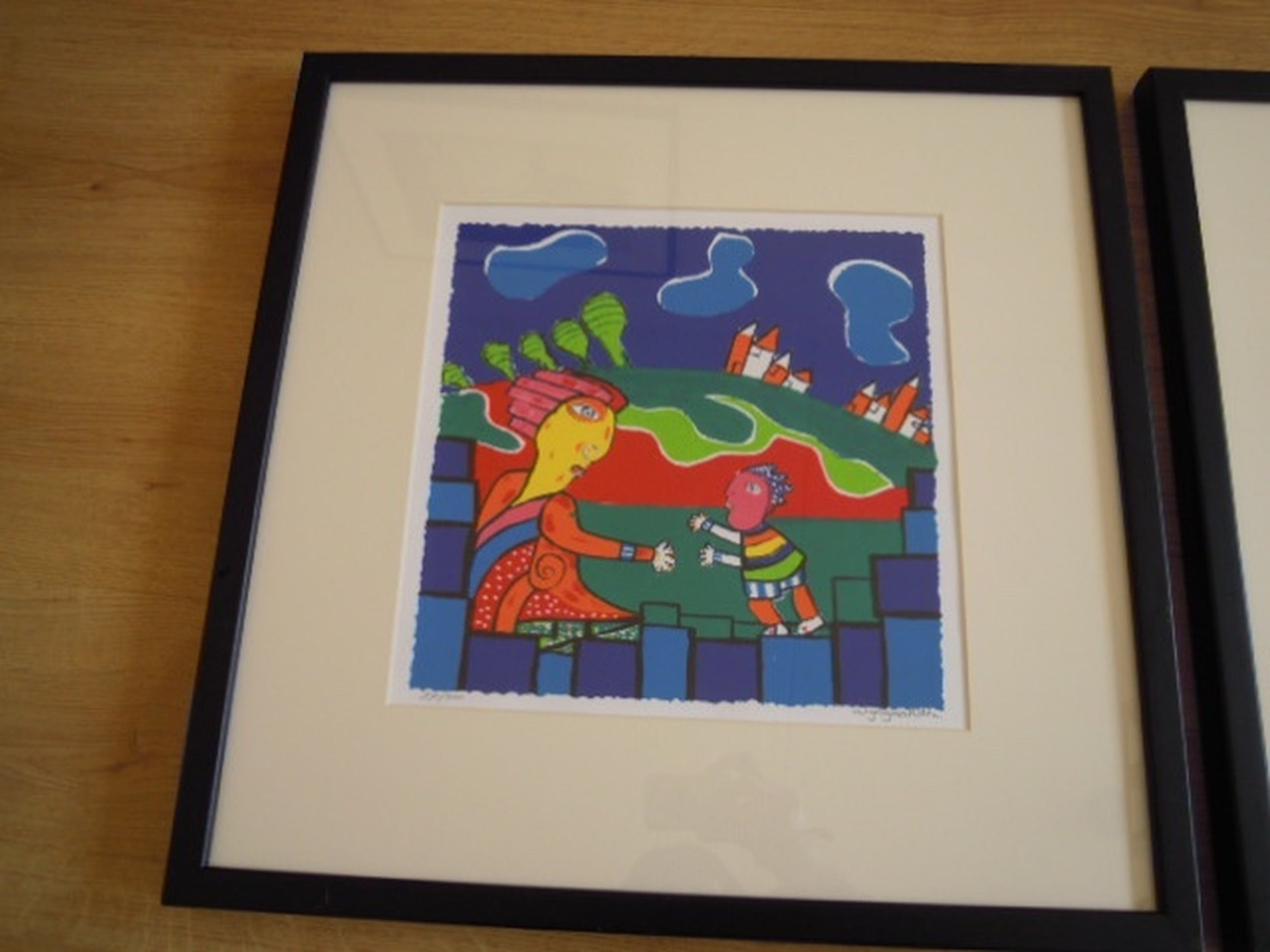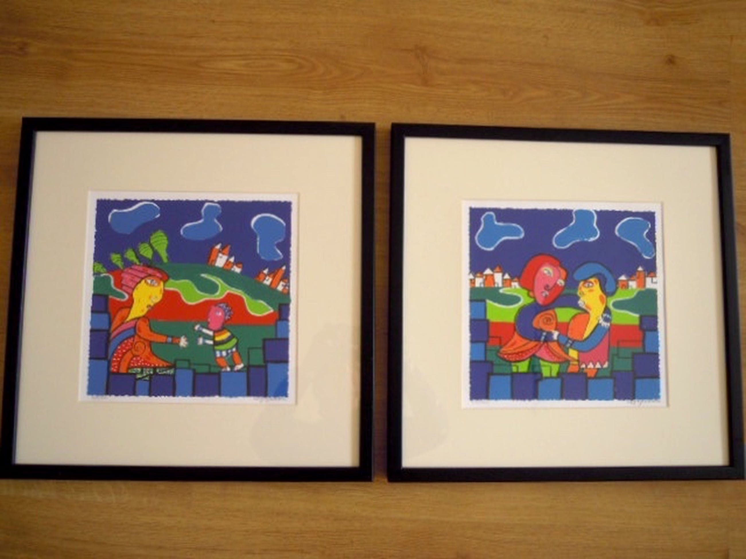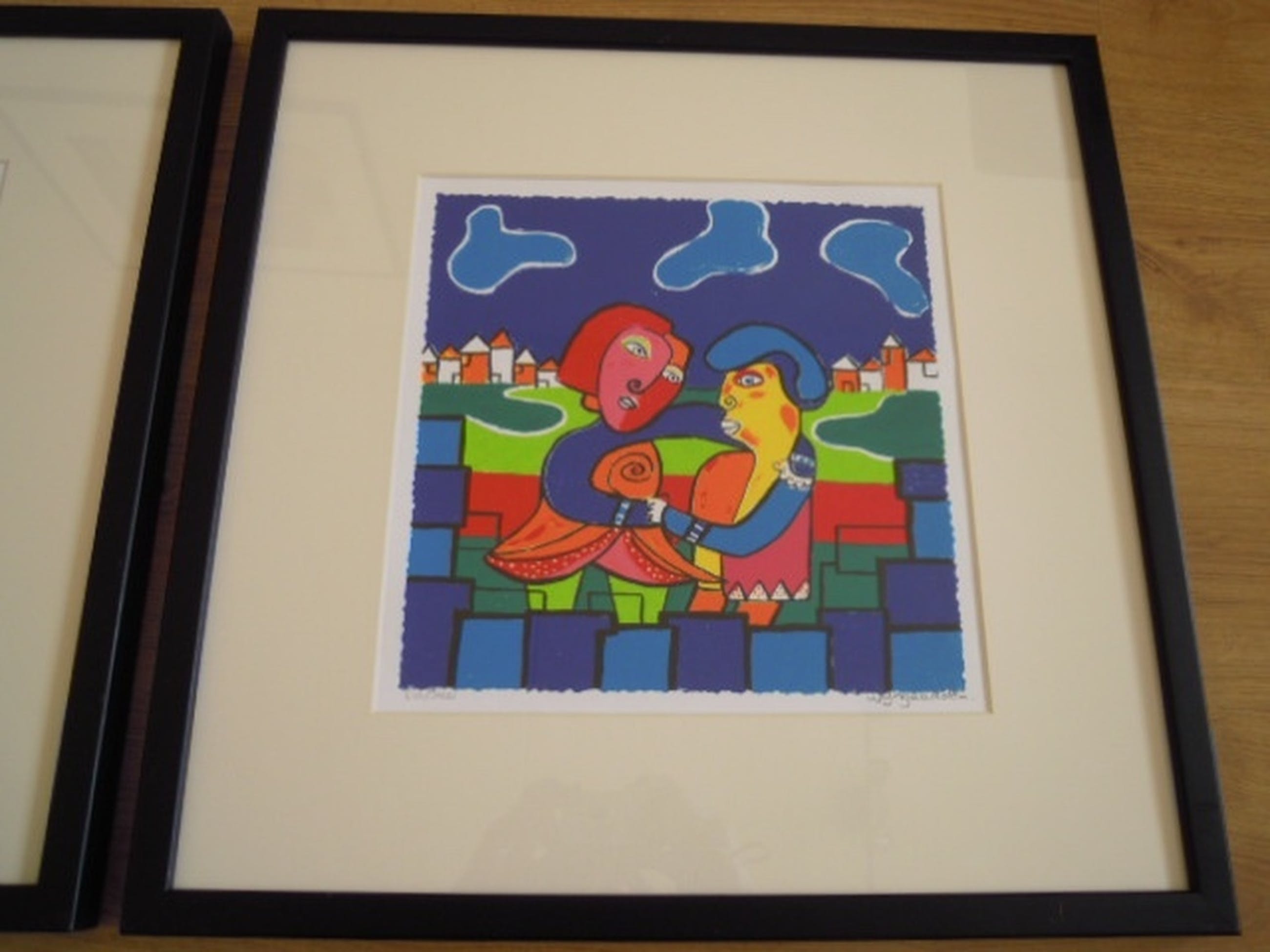 Het betreft 2 fleurige werkjes die zijn hand gesigneerd en genummerd in prachtige strakke zwarte lijsten.