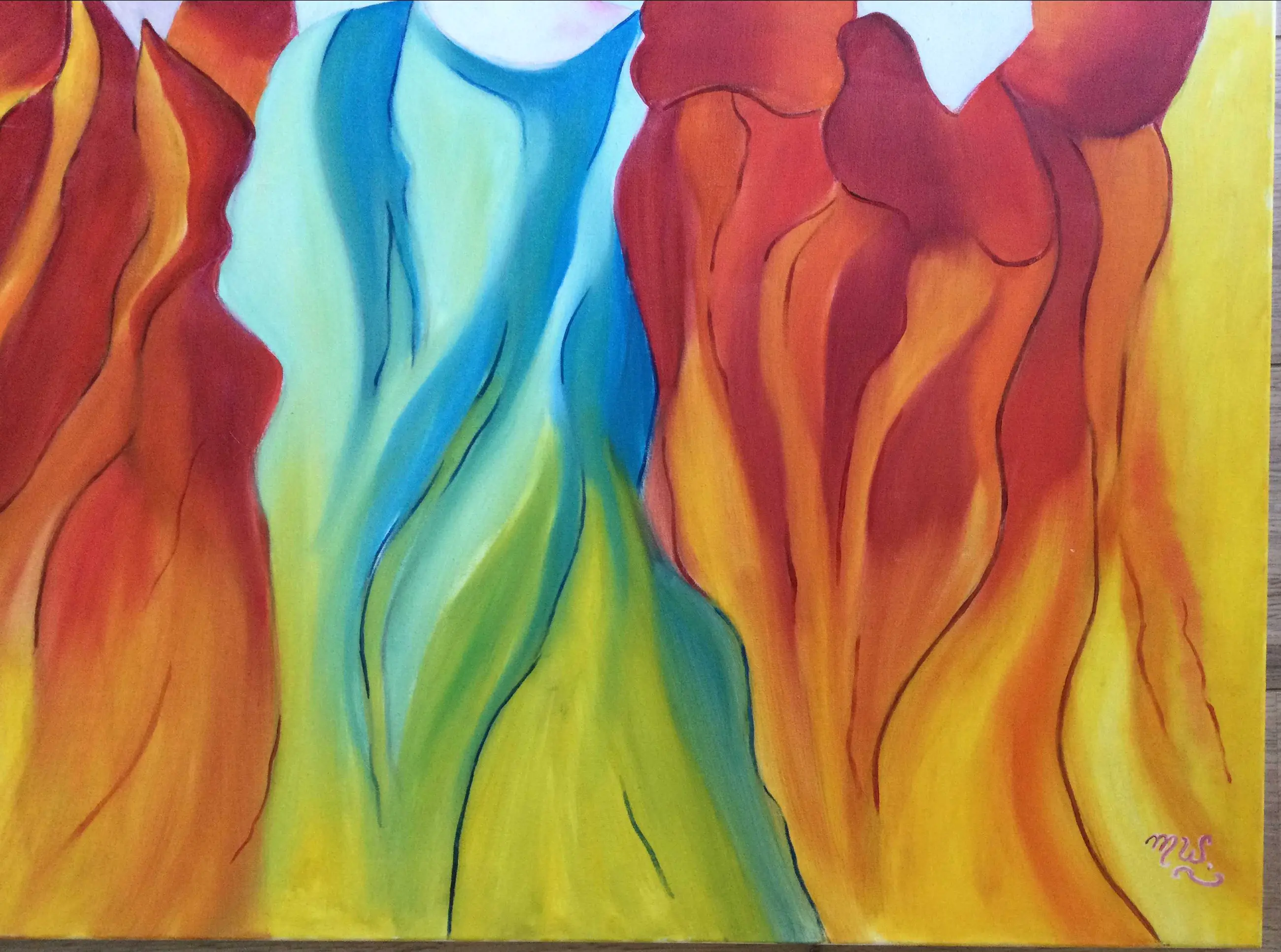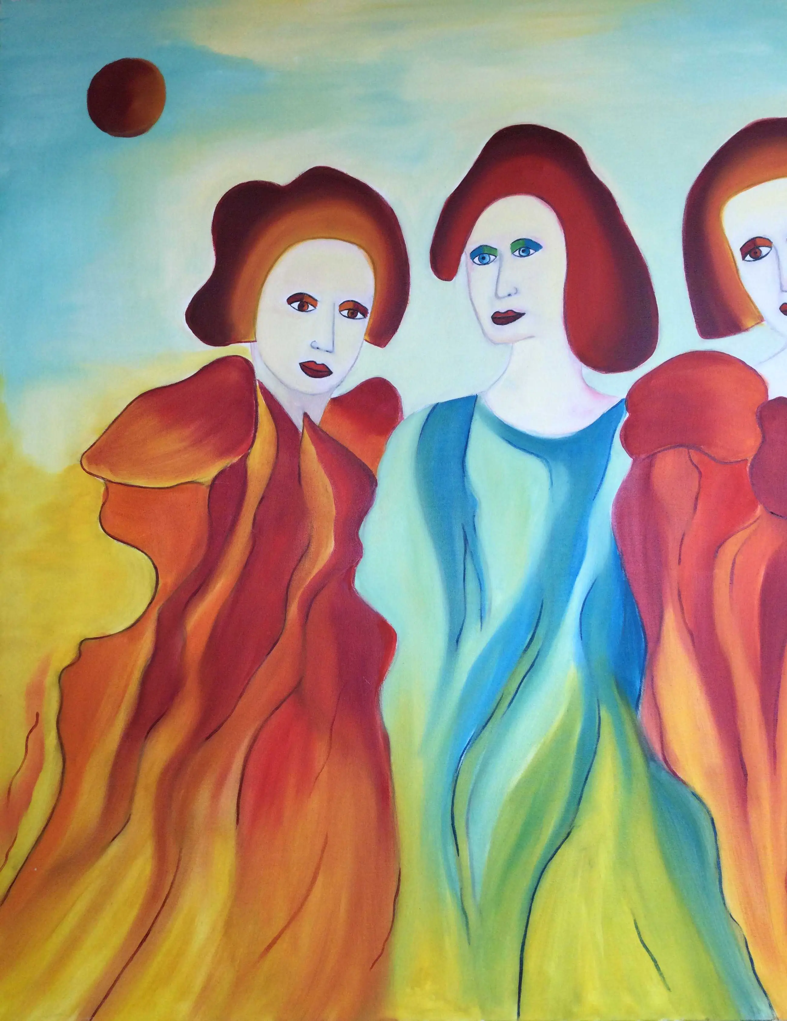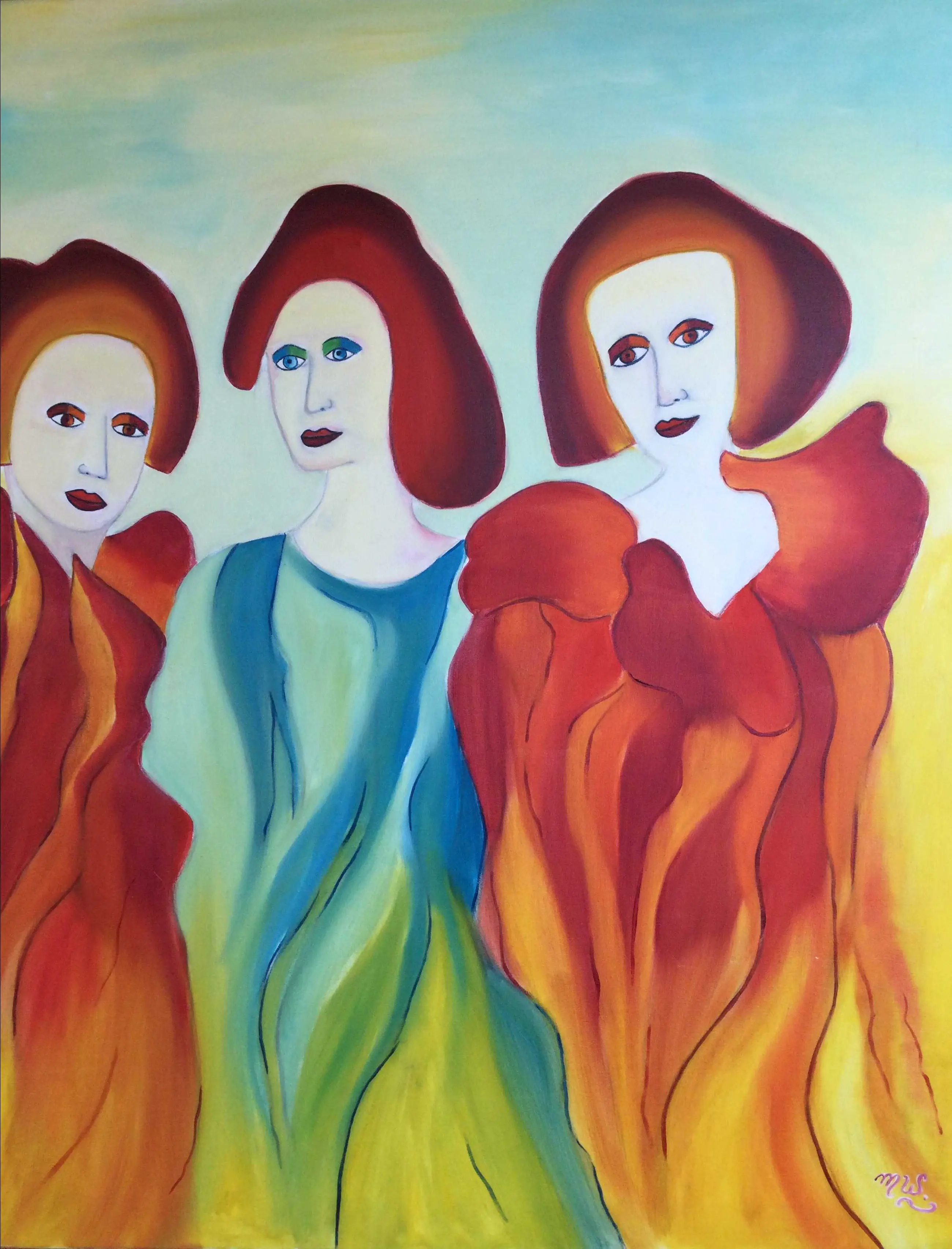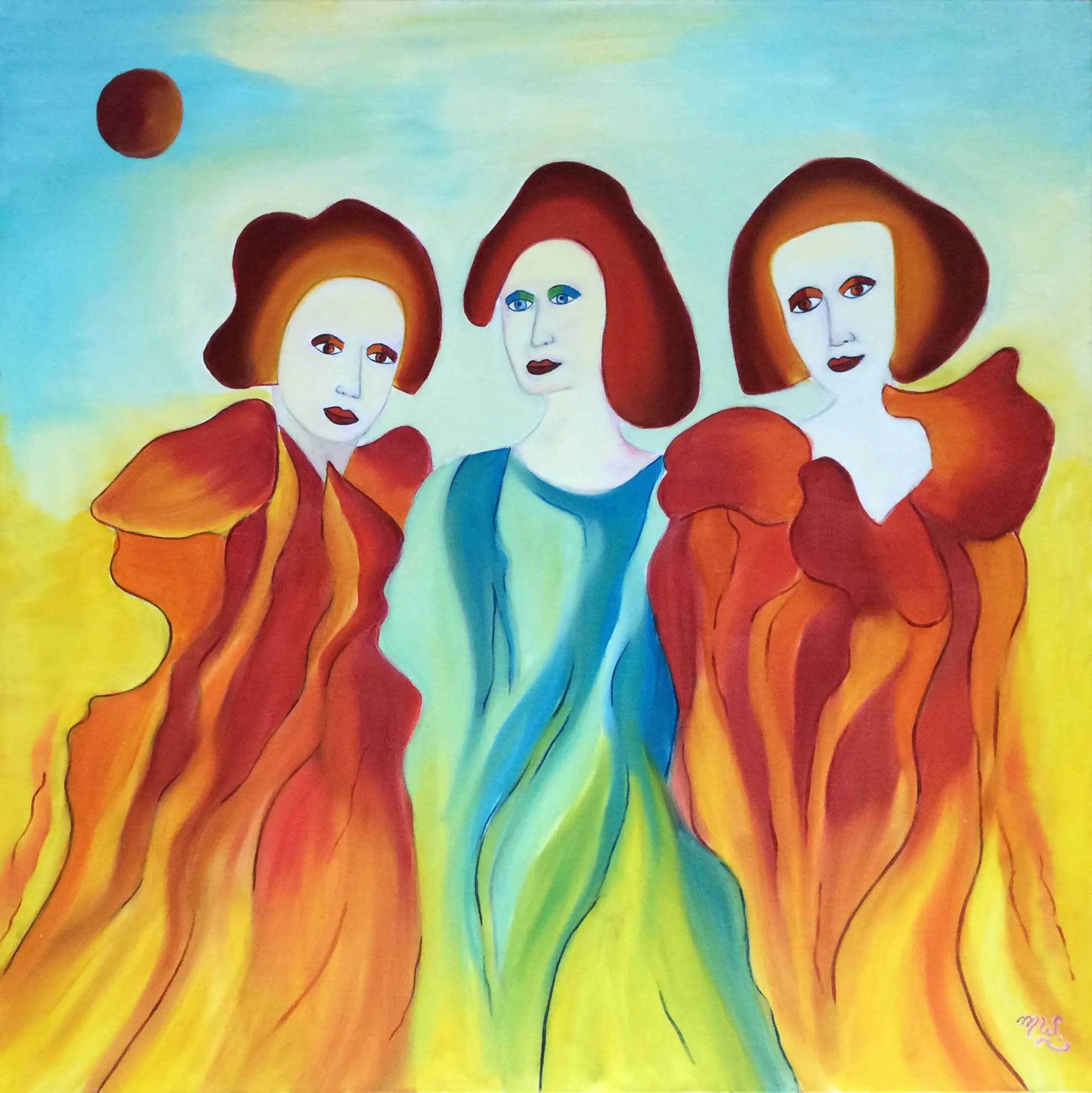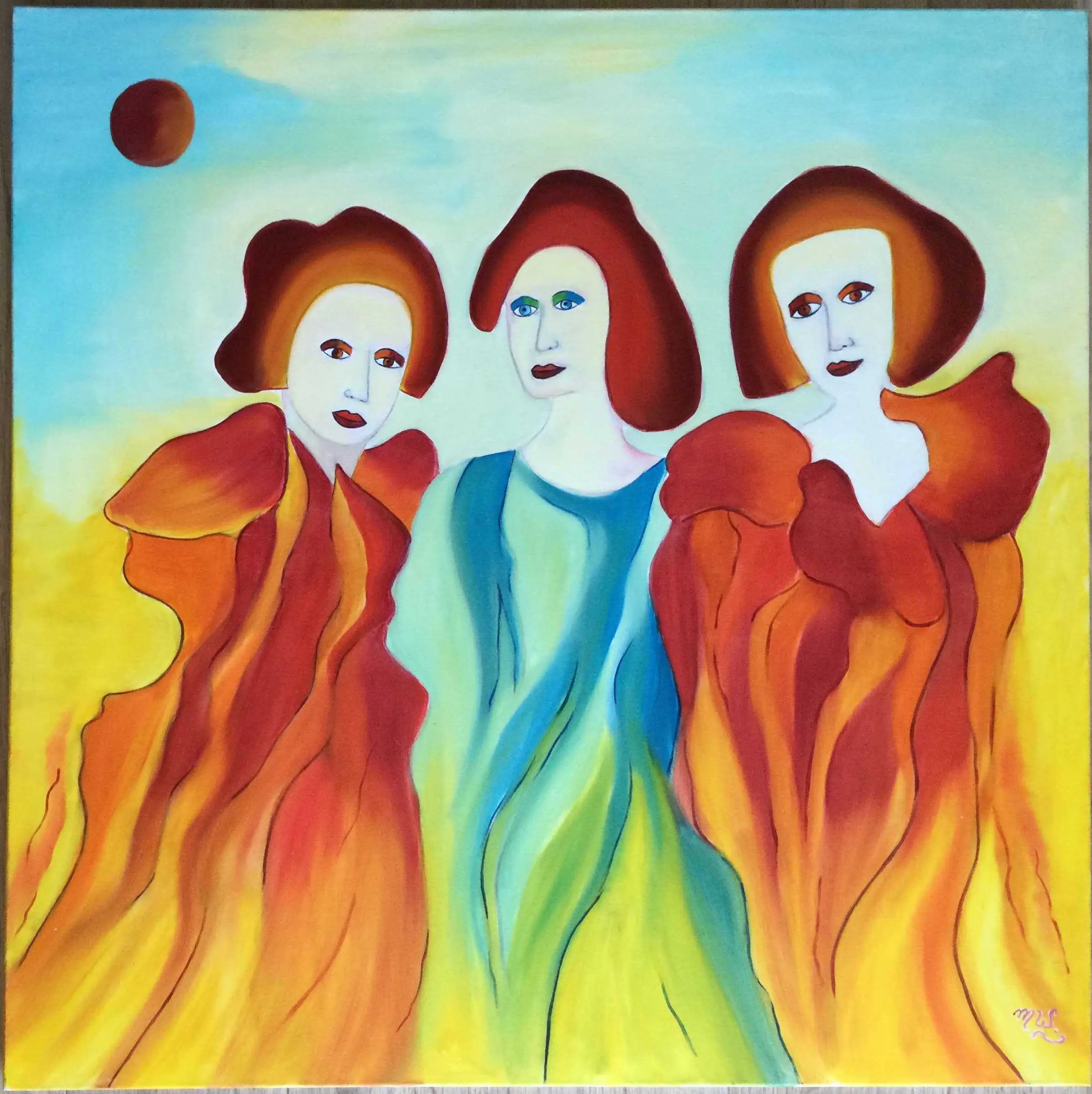 Kleurrijk groot schilderij in surrealistische stijl van Maartje Wijngaarden (1947). Voorstelling: 3 vrouwen; moeder met 2 dochters? Het kleurgebruik is warm en intens. Maartje is op latere leeftijd begonnen als professioneel kunstenaar. Geschilderd op doek en gemonteerd op een houten spieraam. Het werk is gesigneerd met haar monogram 'MW', rechtsonder. Het verkeert in (zeer) goede staat. Langs de randen enige slijtage met minimaal verfverlies . Zijkanten zijn niet meegeschilderd. Foto's maken deel uit van de beschrijving.