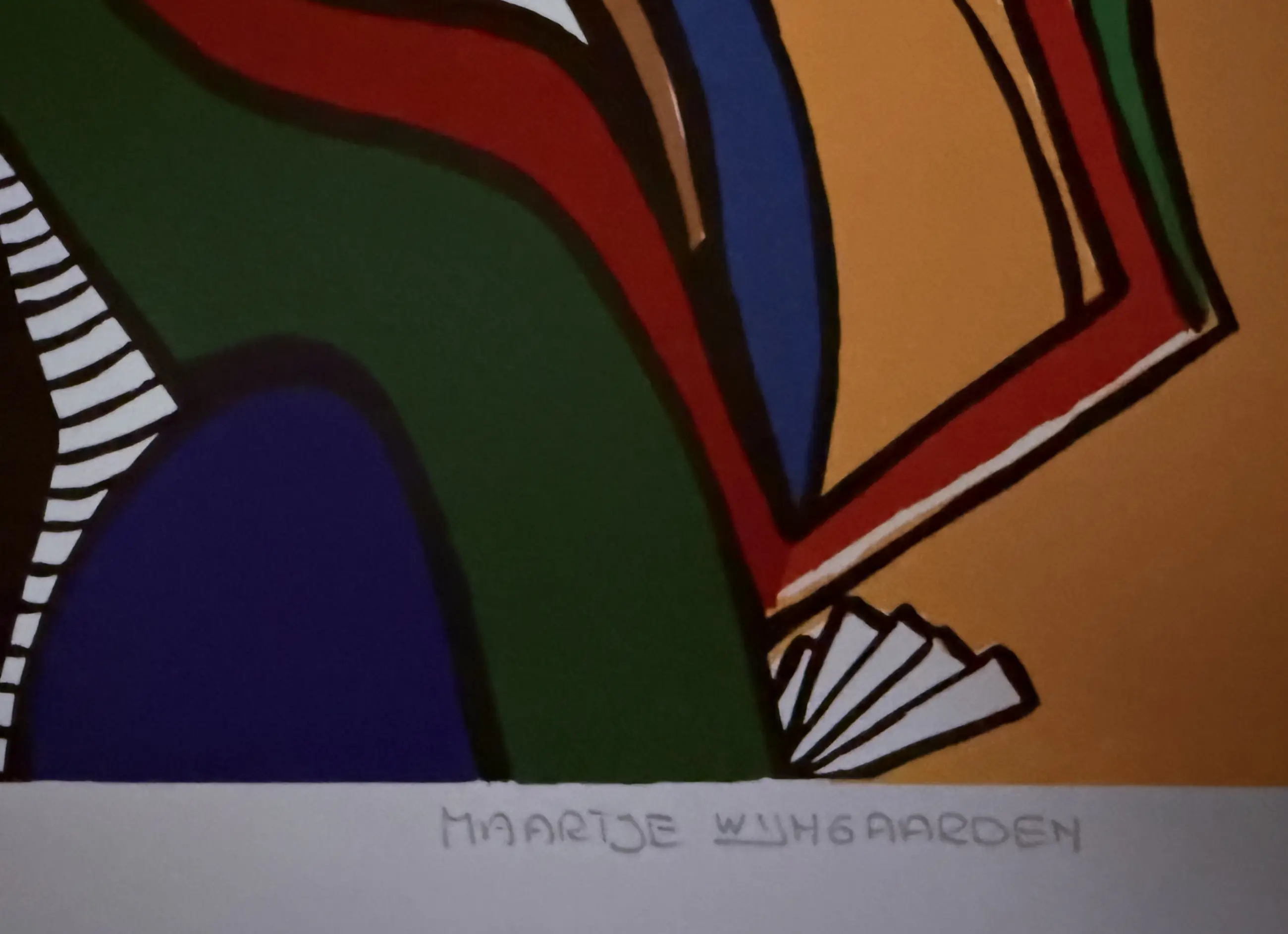 Maartje Wijngaarden: “Faces”. Handgesigneerde en genummerde zeefdruk. Oplage: 50 ex. (nummer op foto's kan afwijken). Deze kleuren zeefdruk is nooit ingelijst geweest en is bewaard in een donker archiefopslag tussen beschermend zuurvrij papier. De getoonde foto's zijn onderdeel van de beschrijving. Dit kunstwerk wordt zorgvuldig stevig verpakt en in beschermend zuurvrij papier verzonden.