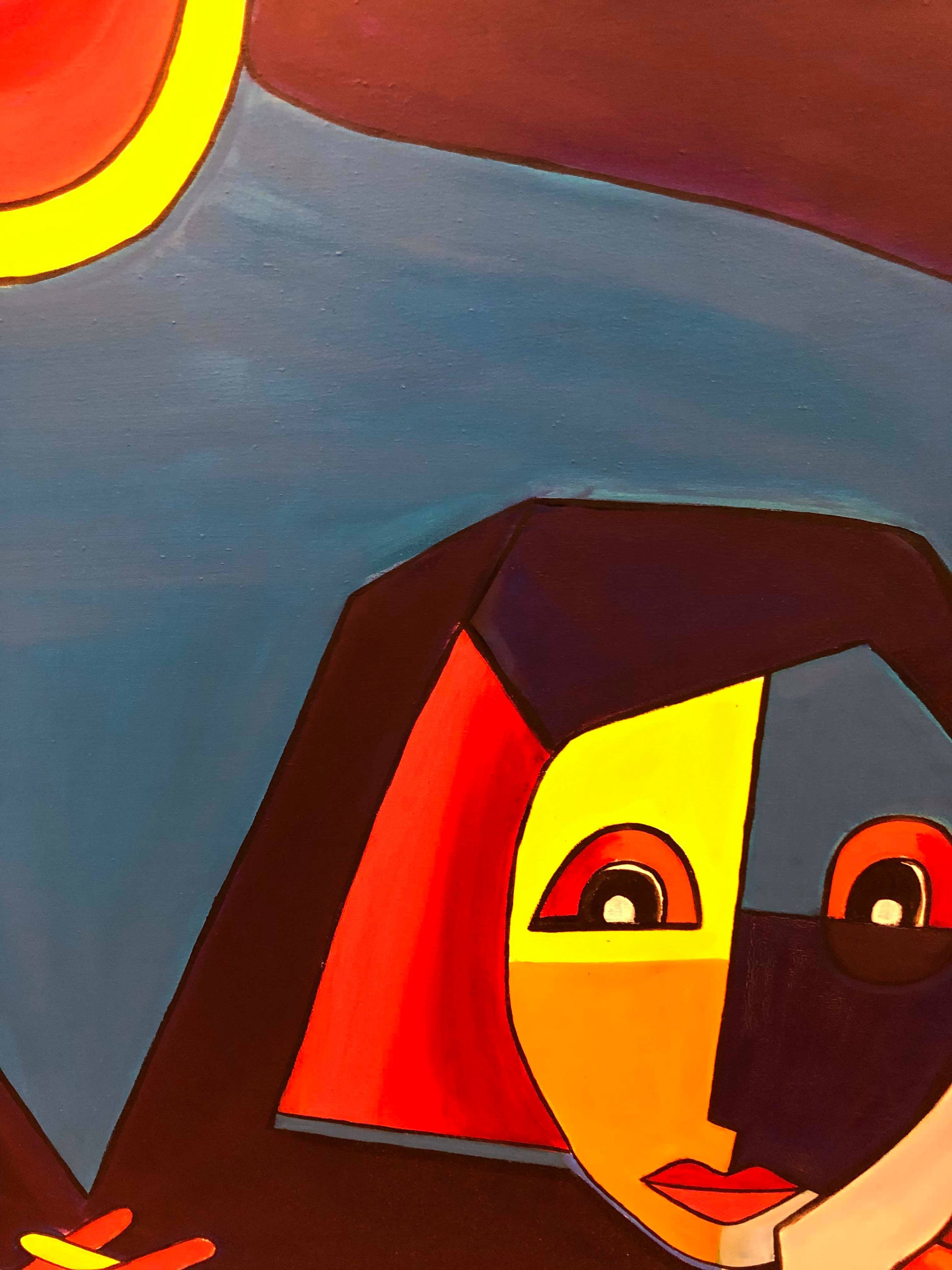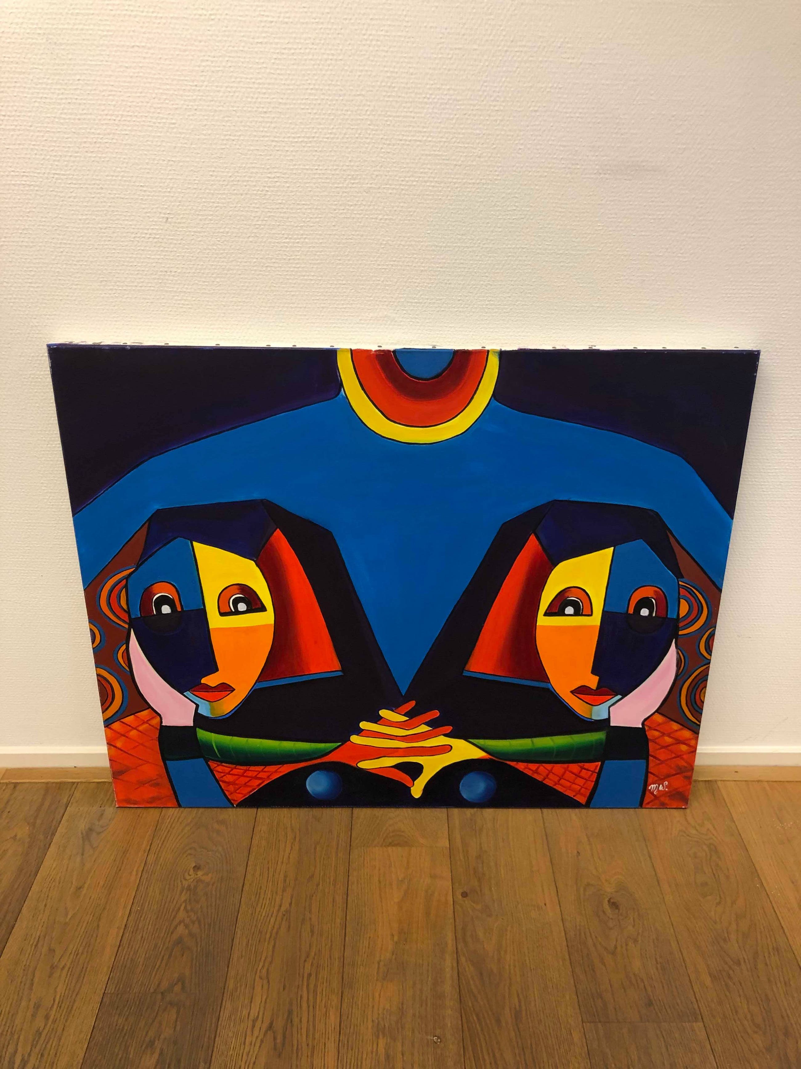 Fris, modern schilderij met uitgebeeld, 2 gezichten.