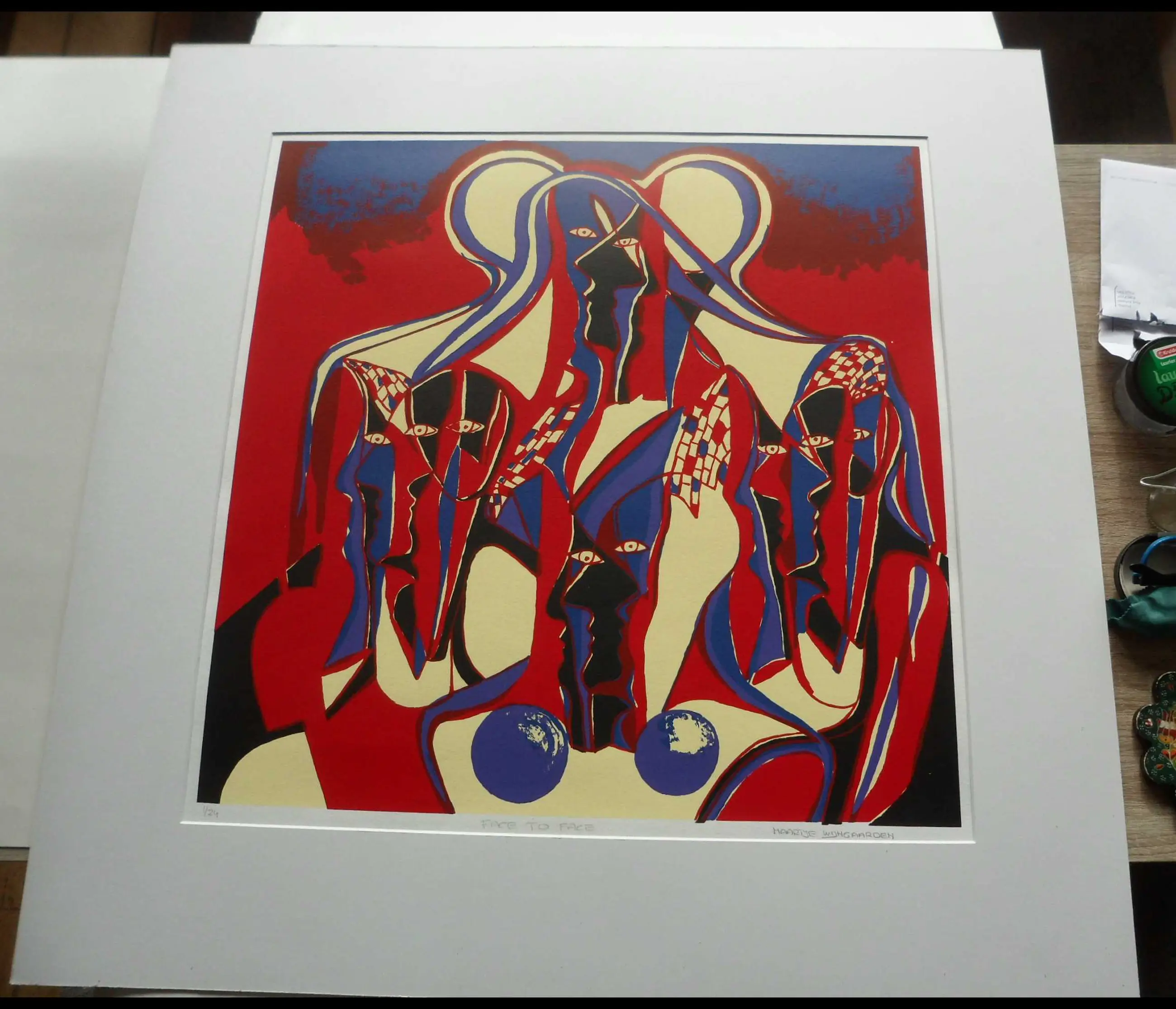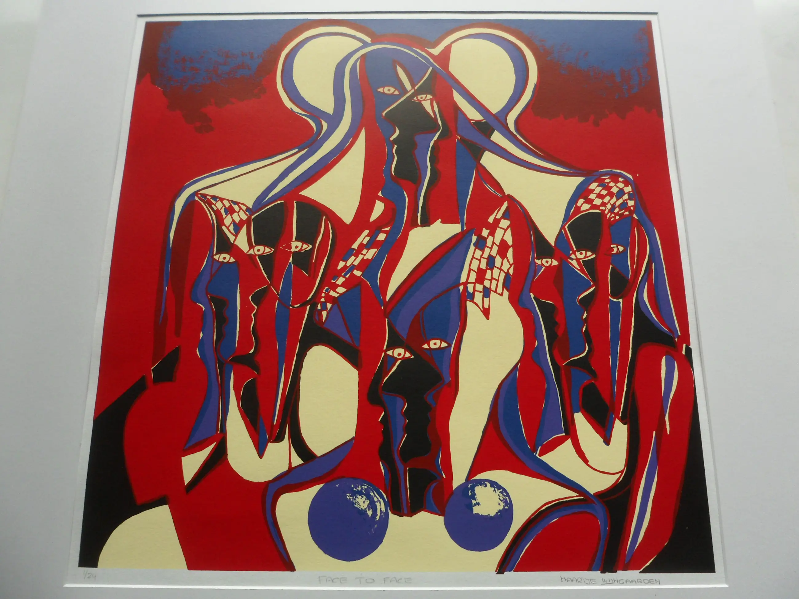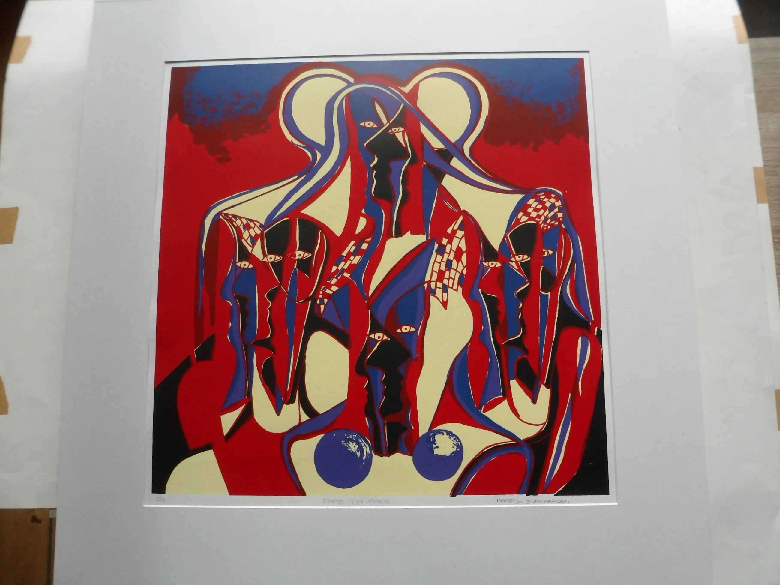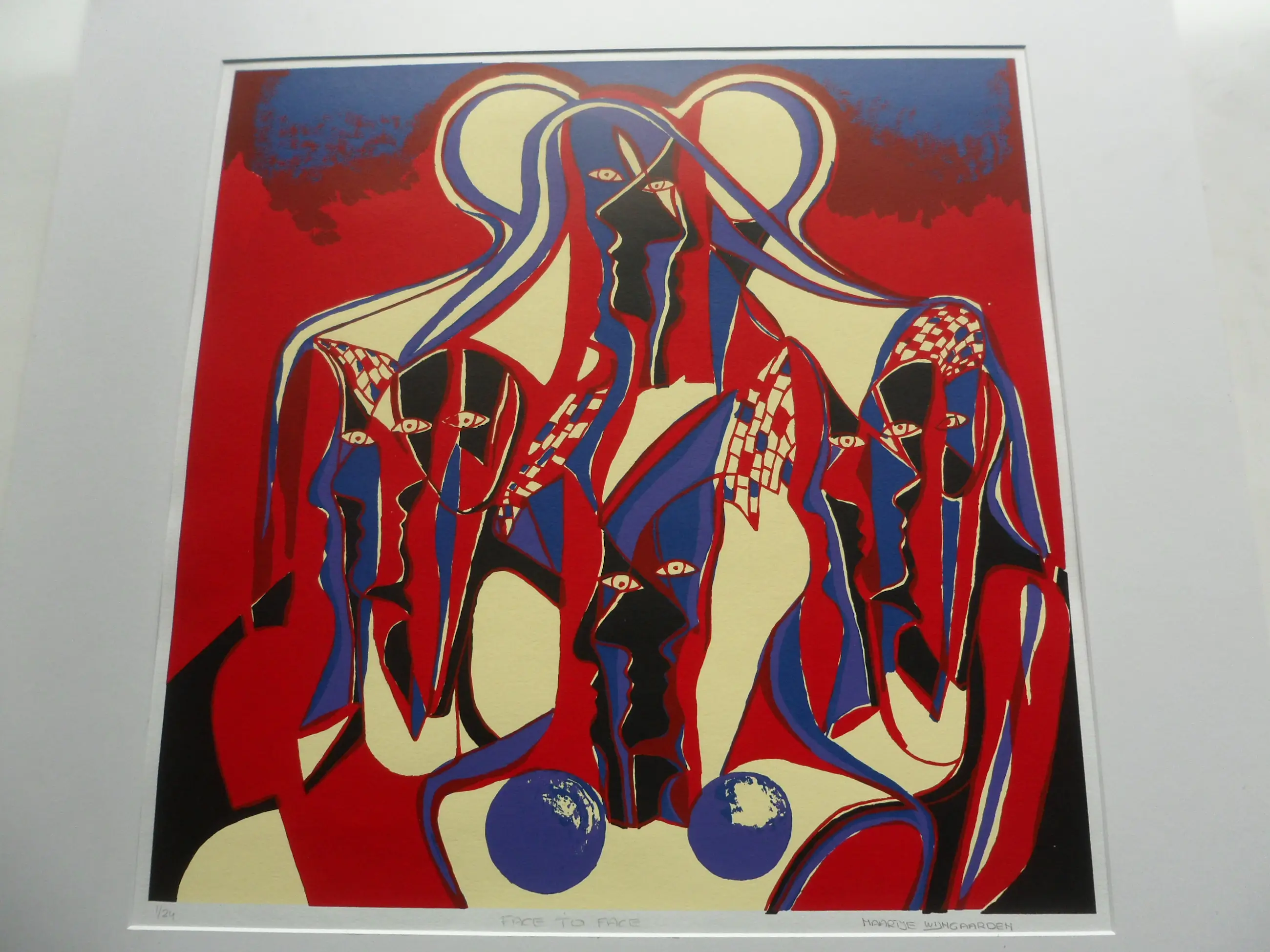 Grote zeefdruk vervaardigd door van Wijngaarden in een gesigneerde en genummerde oplage van 24 exemplaren! Gesigneerd en genummerd in potlood links en rechts onder de afbeelding. Deze heeft nummer 1/24. De afmetingen van de druk; 58 x 59 cm. Het complete blad is 80 x 80 cm!