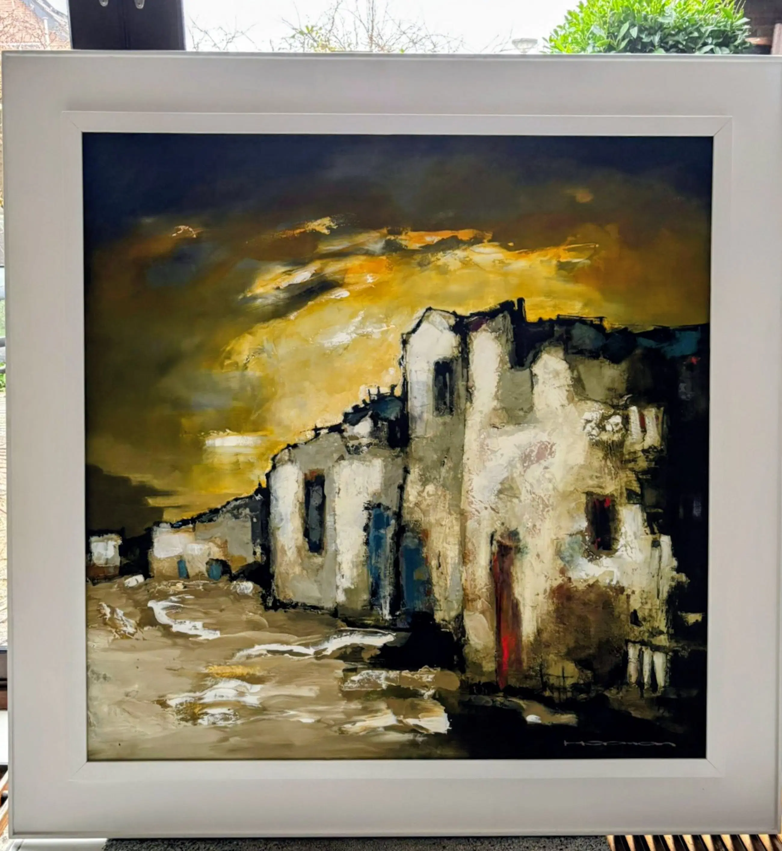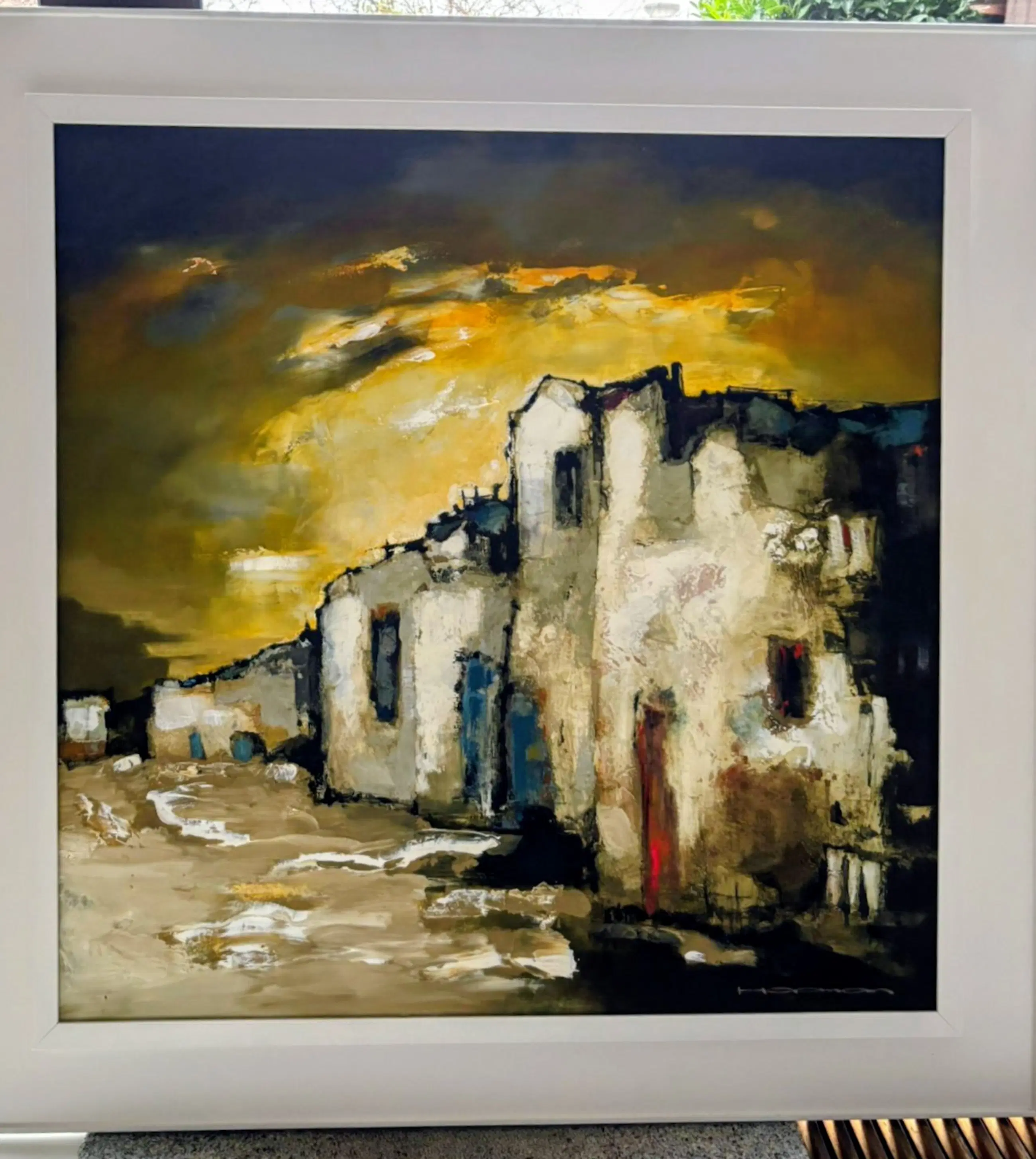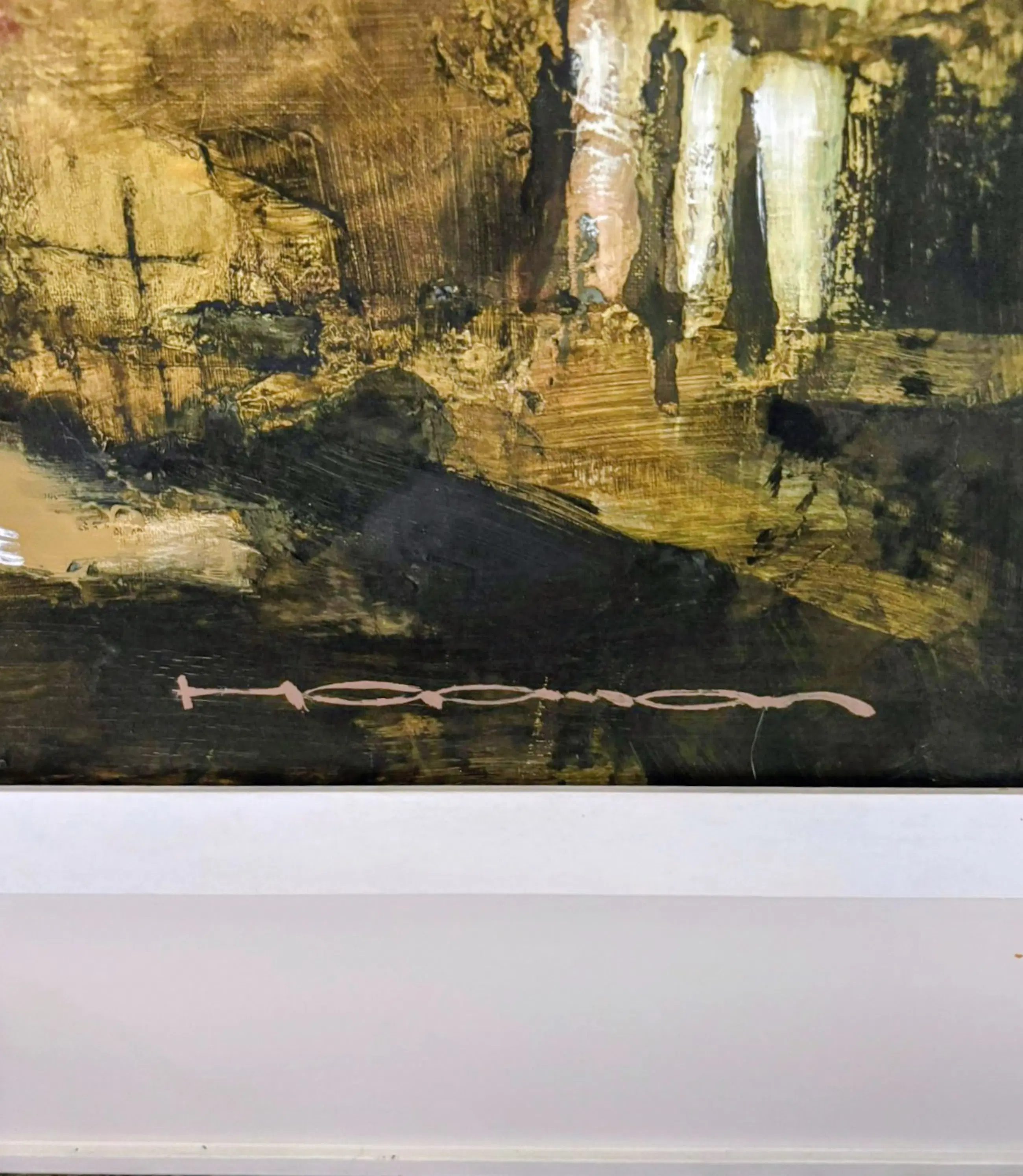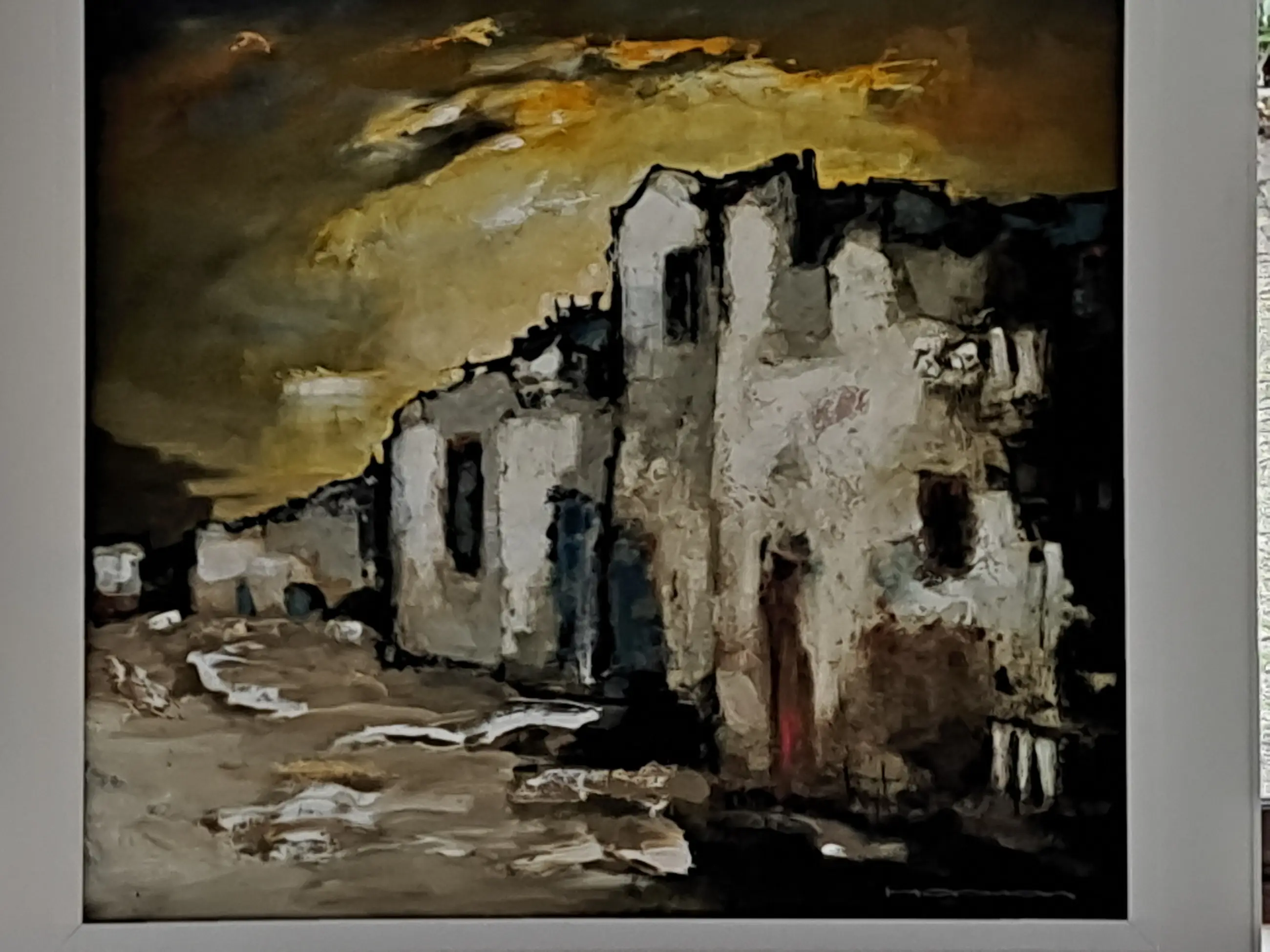 Schilderij is los van lijst. Doek en lijst onbeschadigd. Het werk straalt licht uit, dit krijg ik niet goed gevangen op de foto. Aankoopprijs op foto toegevoegd.