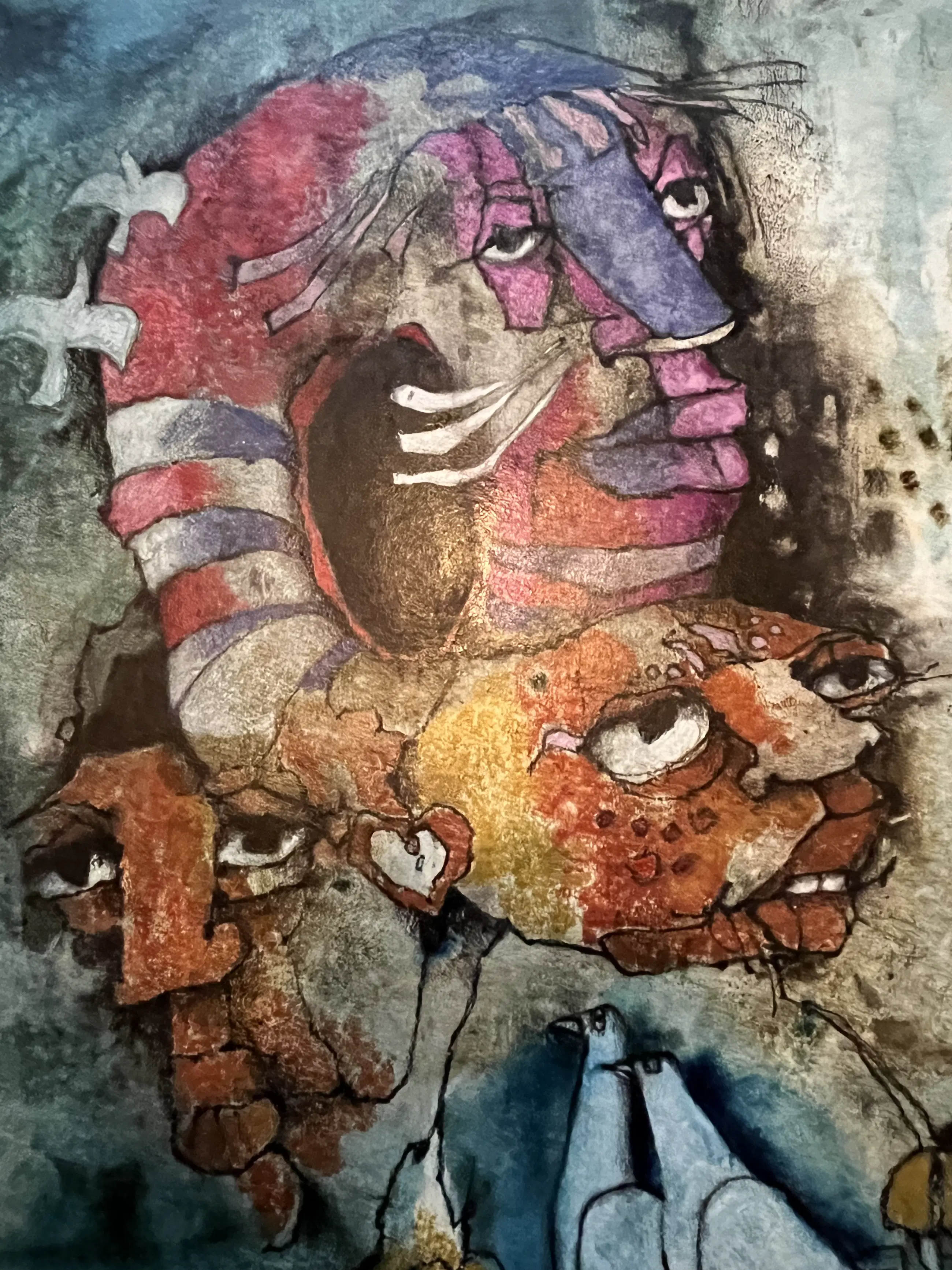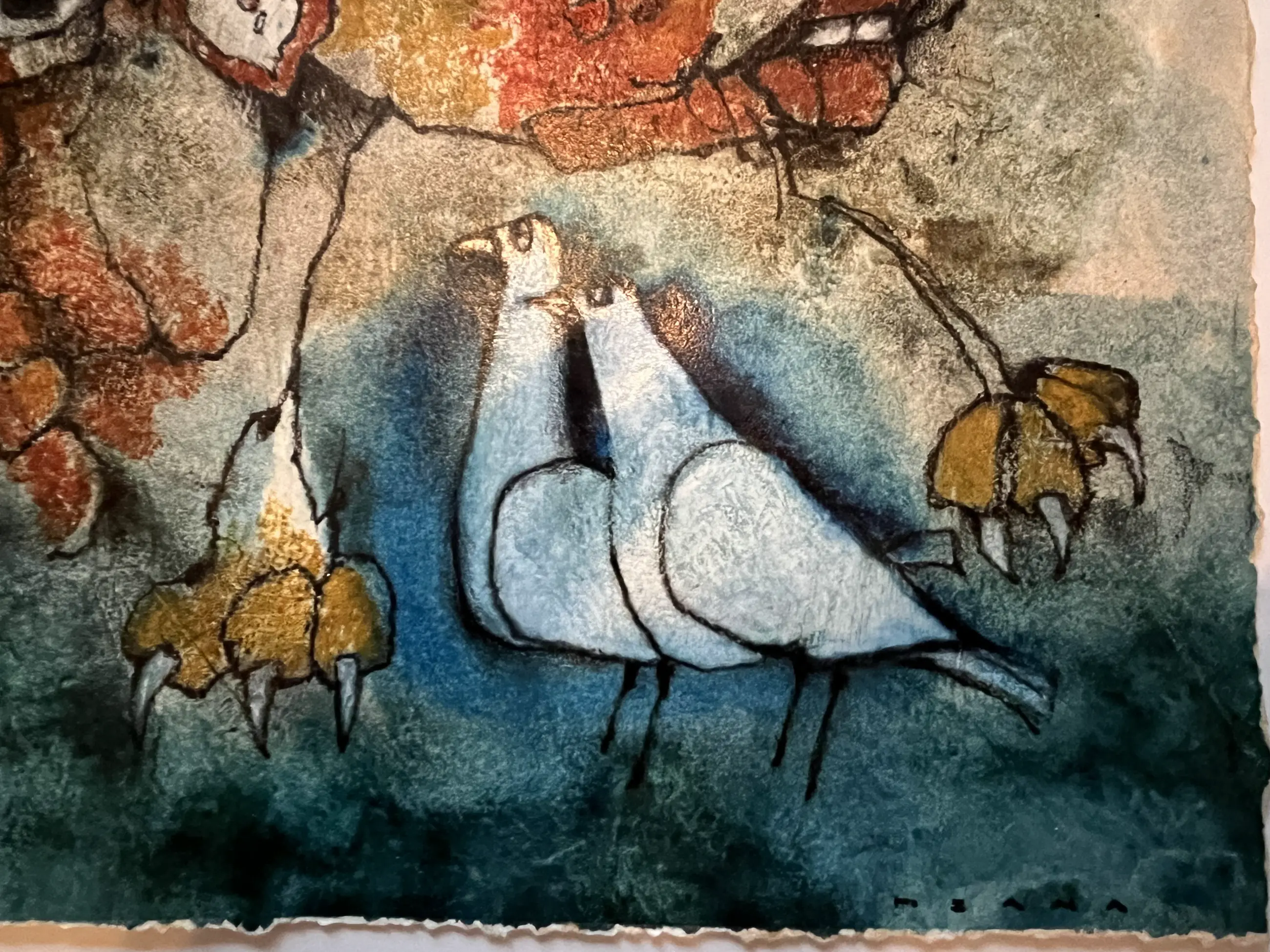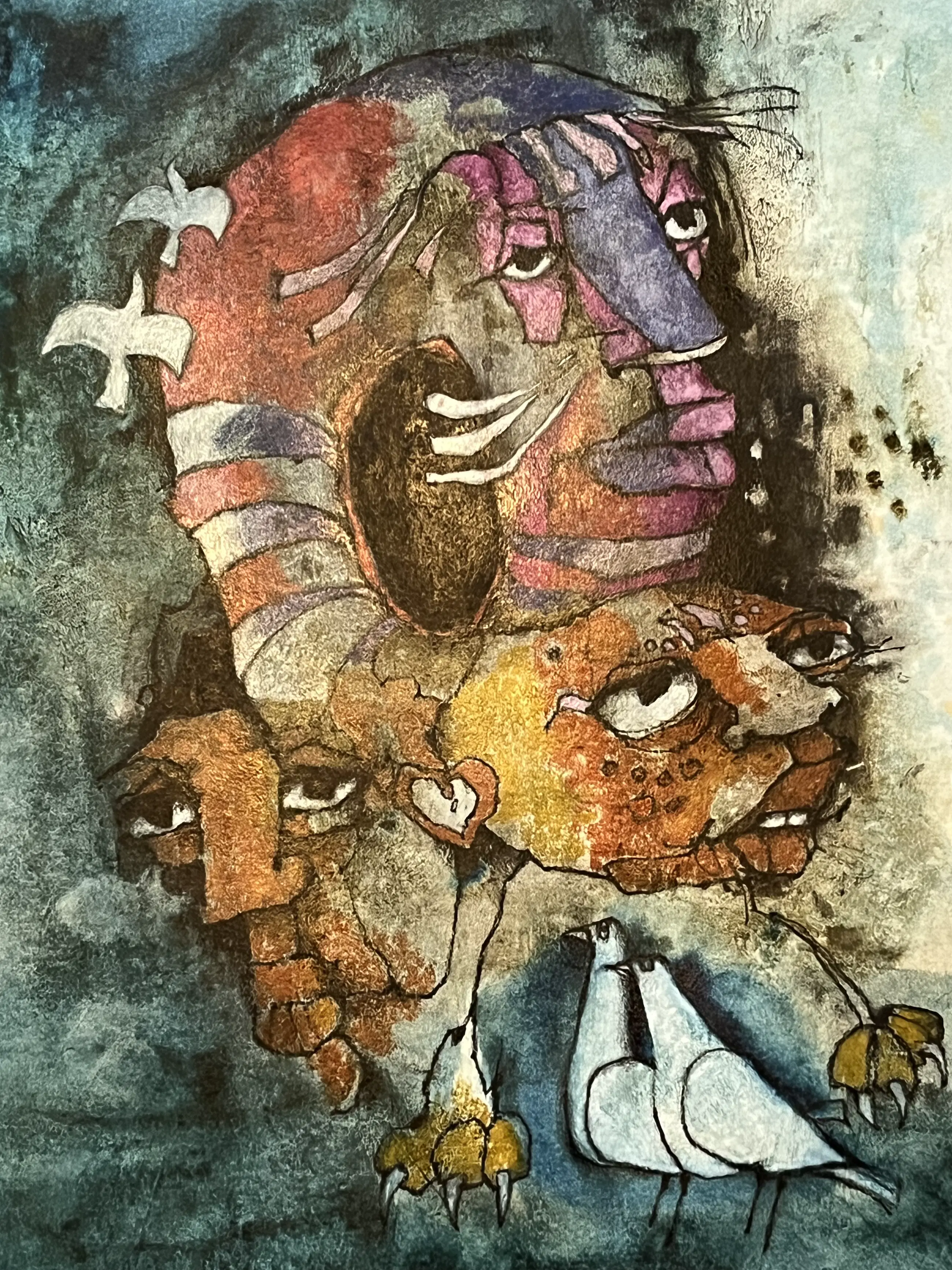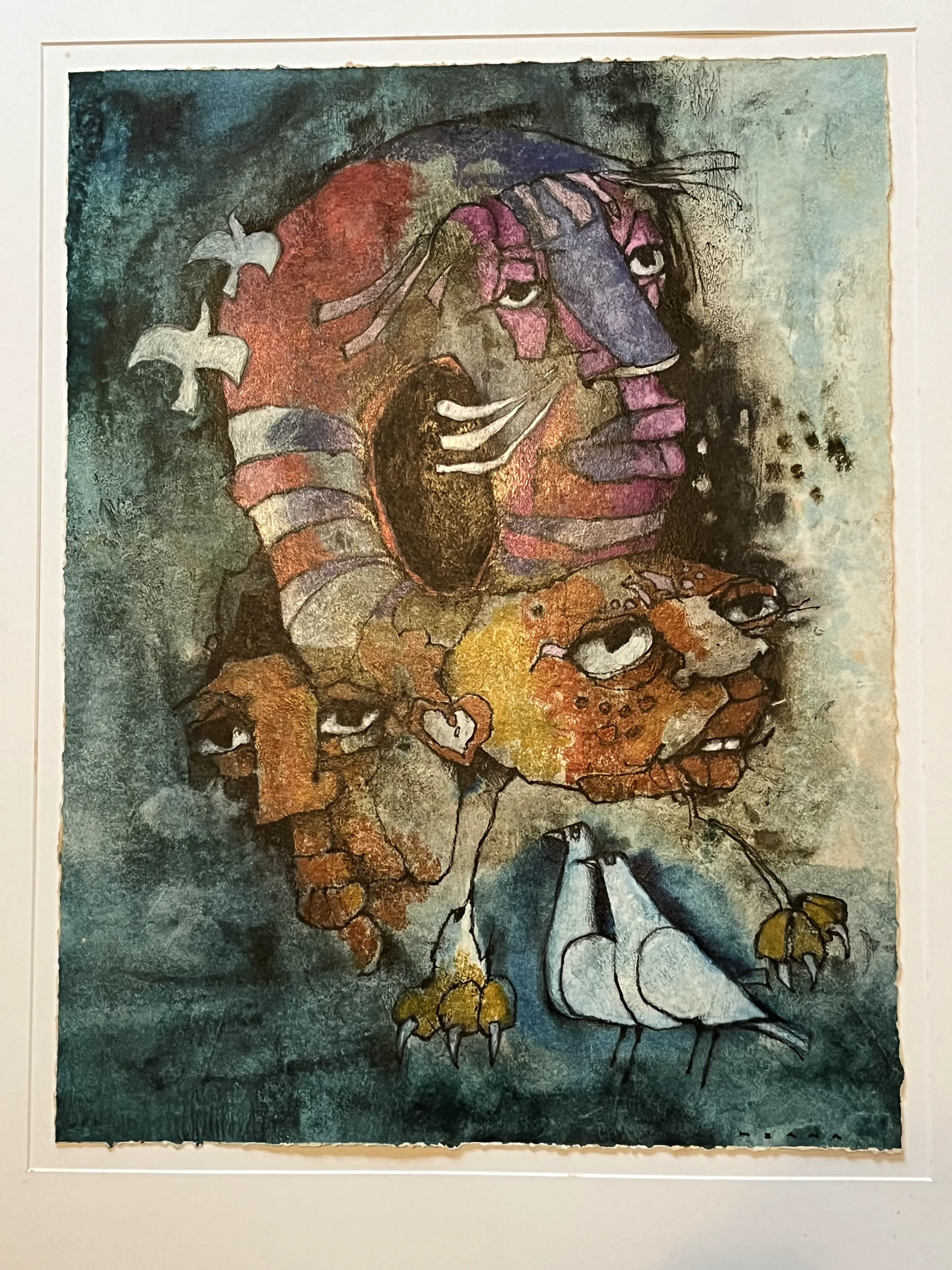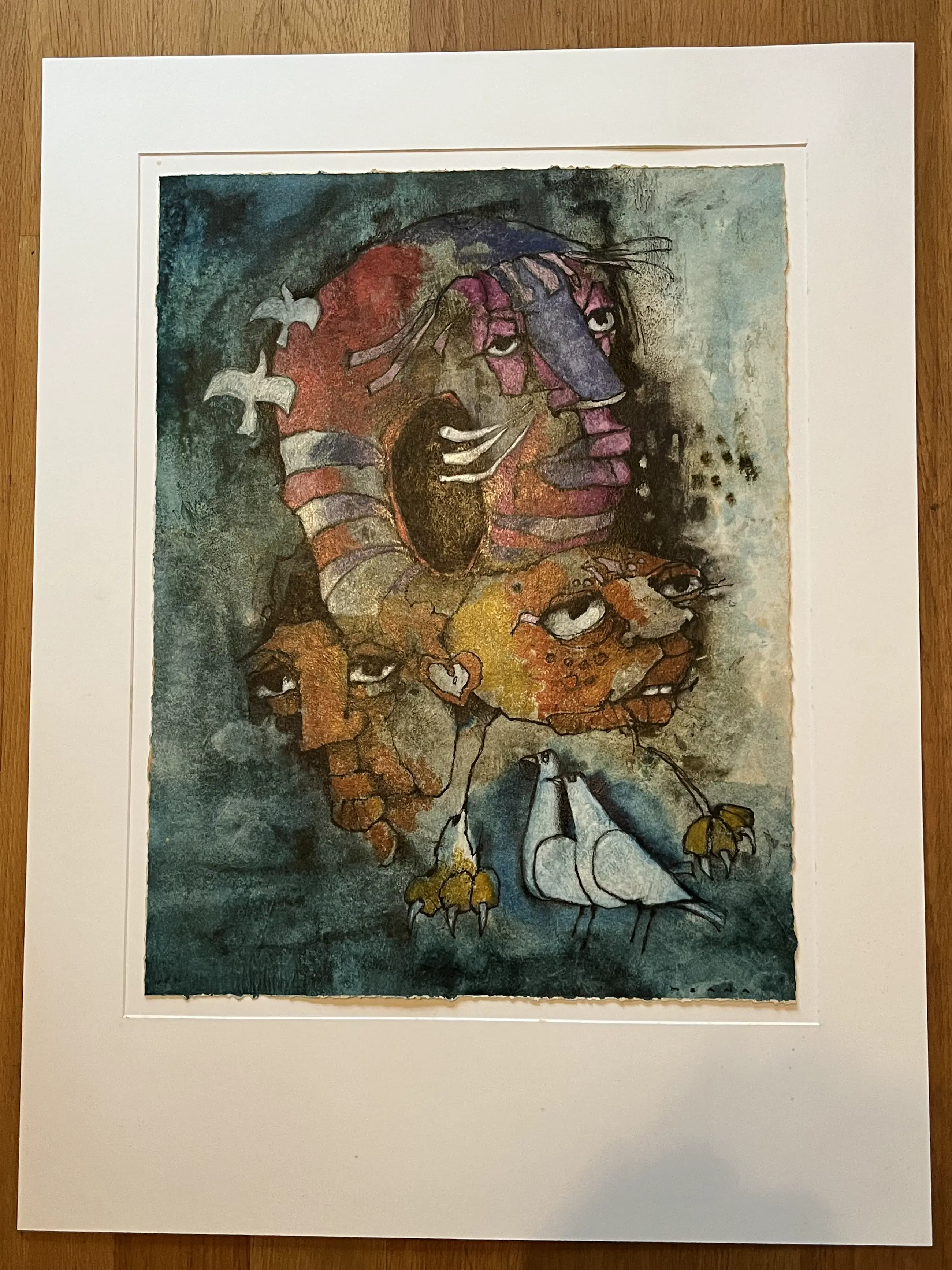 Fraai kleurrijke werk uit de periode dat de kunstenaar in Afrika woonde en werkte. Signeerde zijn werk toen met “NZAMA”. Het werk is in passe partoute geplakt. Afmeting werk 56 x 43 cm. Inclusief passe partoute 80 x 60 cm.