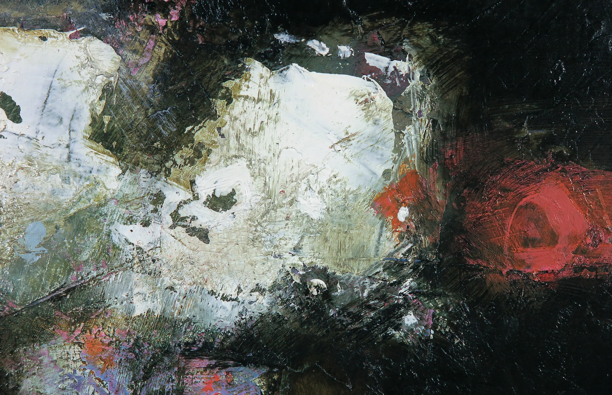| Rechtsboven twee kleine plekjes; een minieme beschadiging en een oud plekje met verfverlies, welke provisorisch/amateuristisch is geretoucheerd. | |