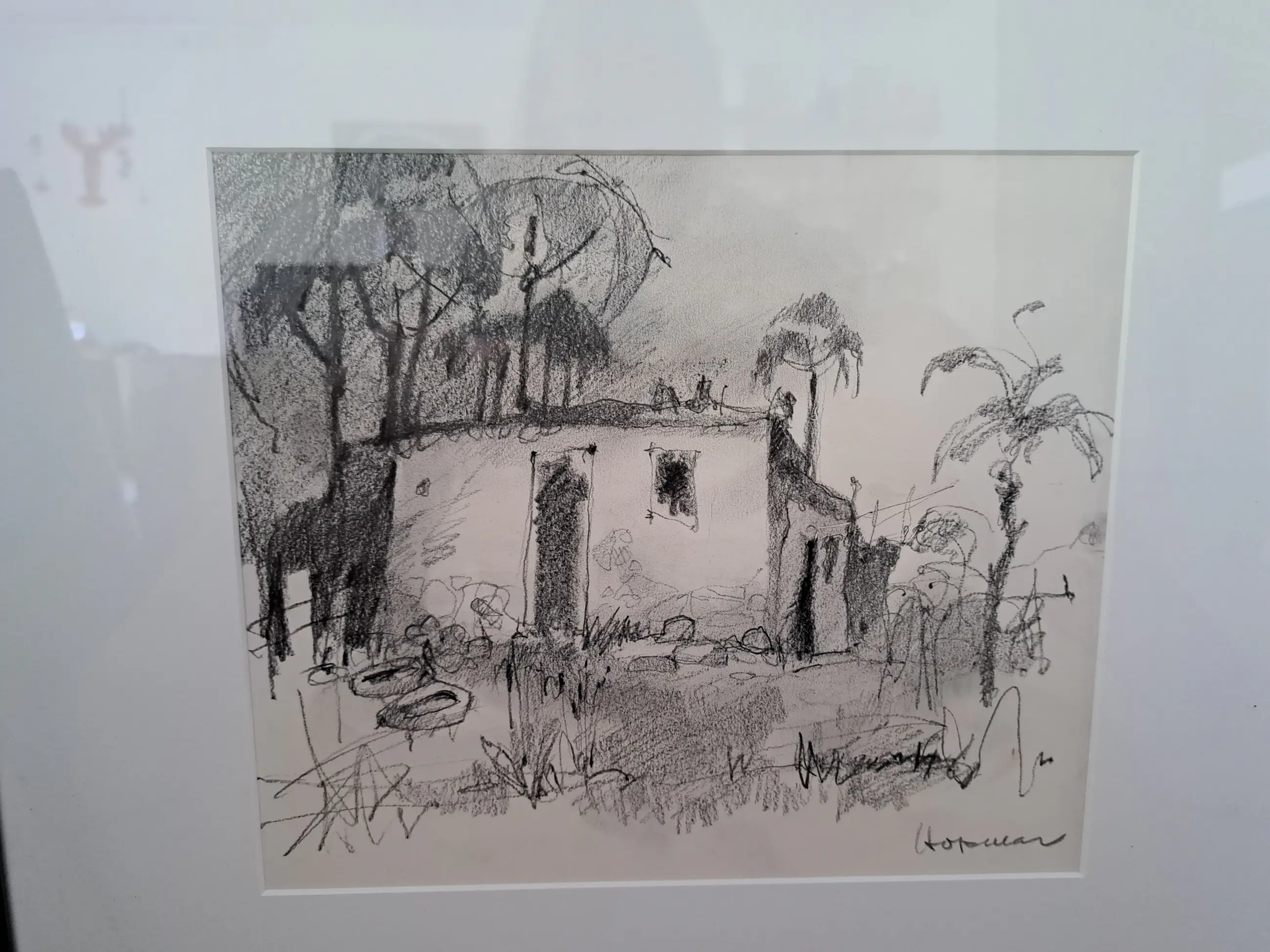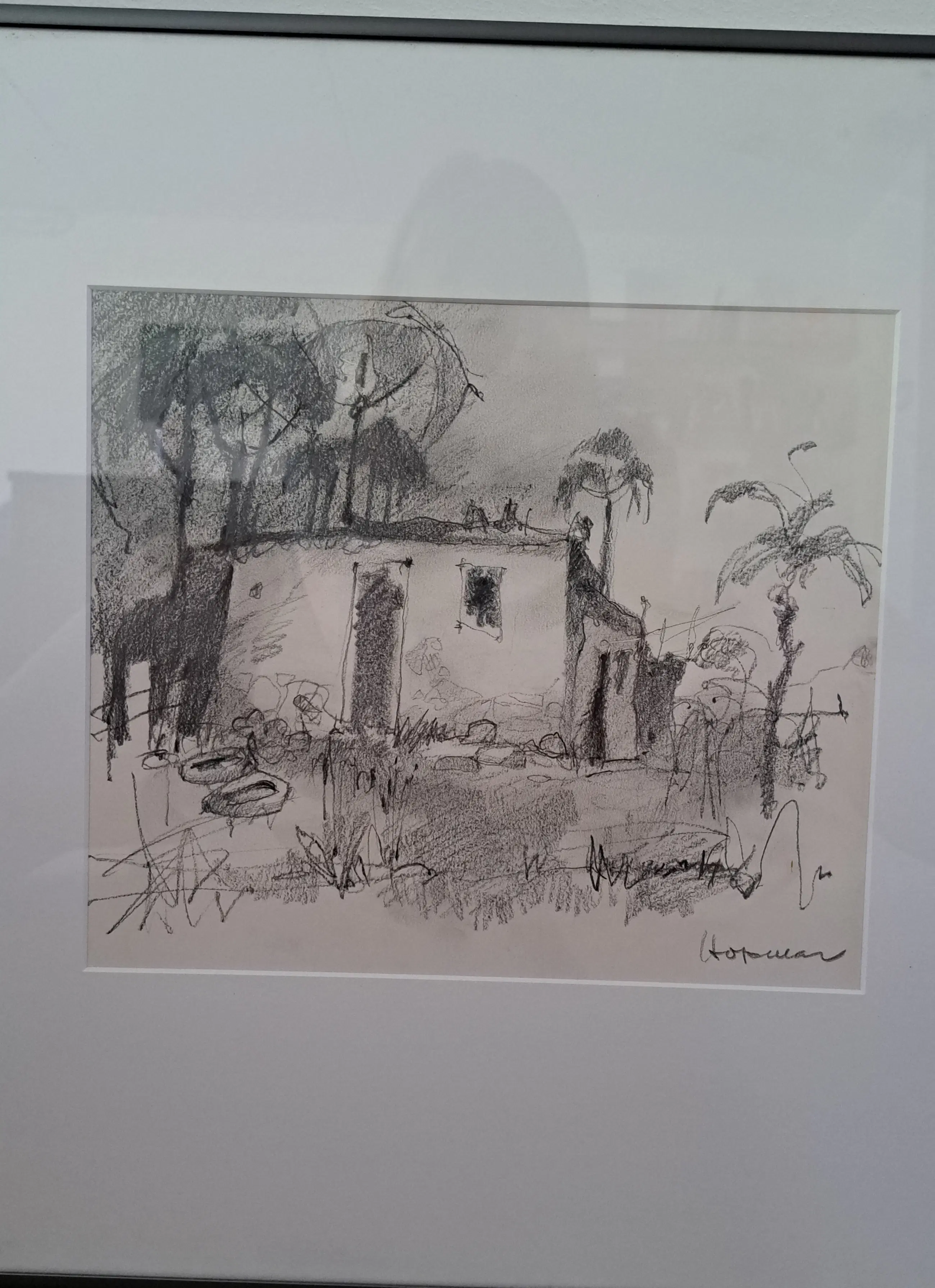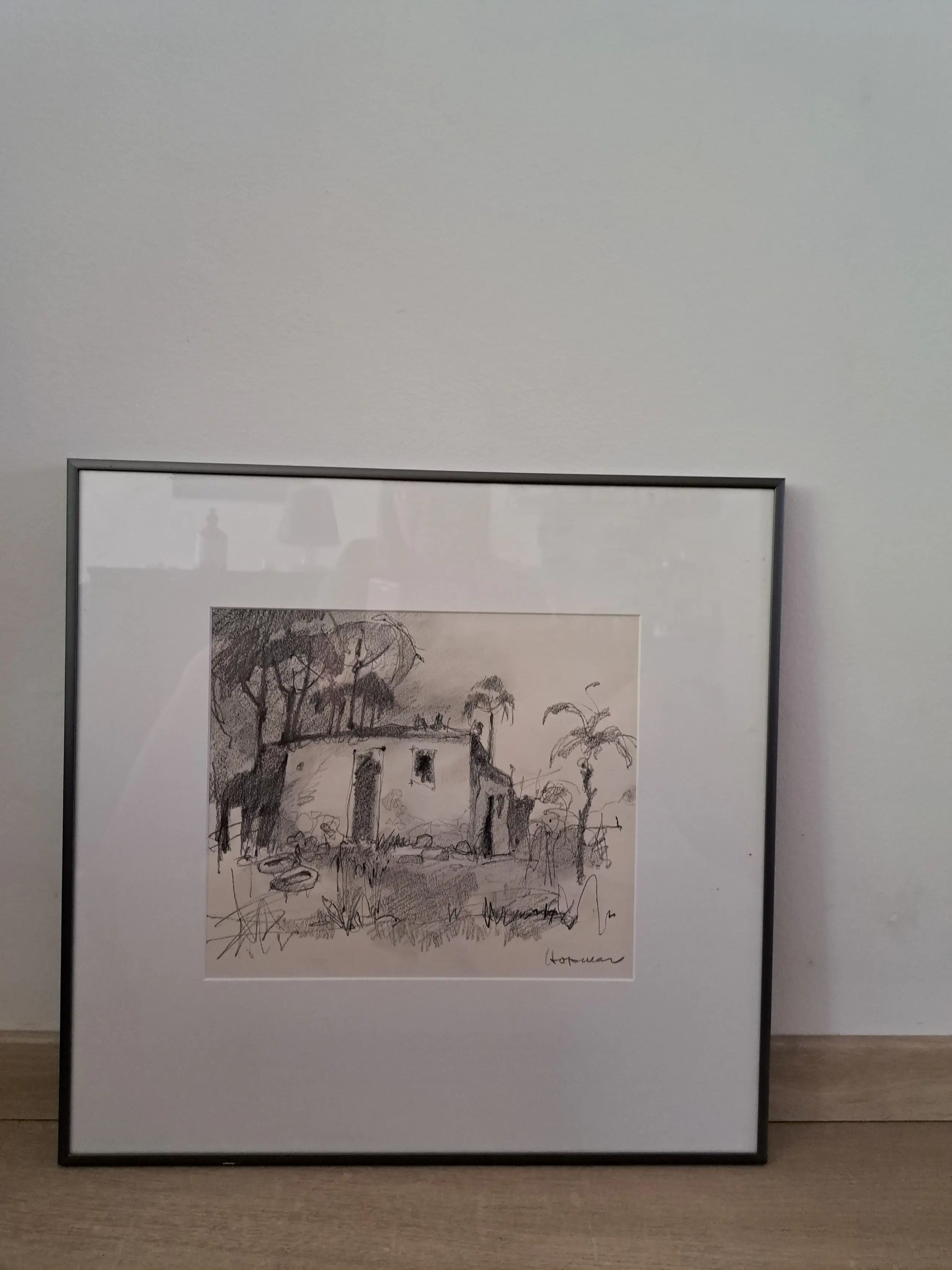 Werk zit in passe-partout in lijst. Combinatie potlood en houtskool.