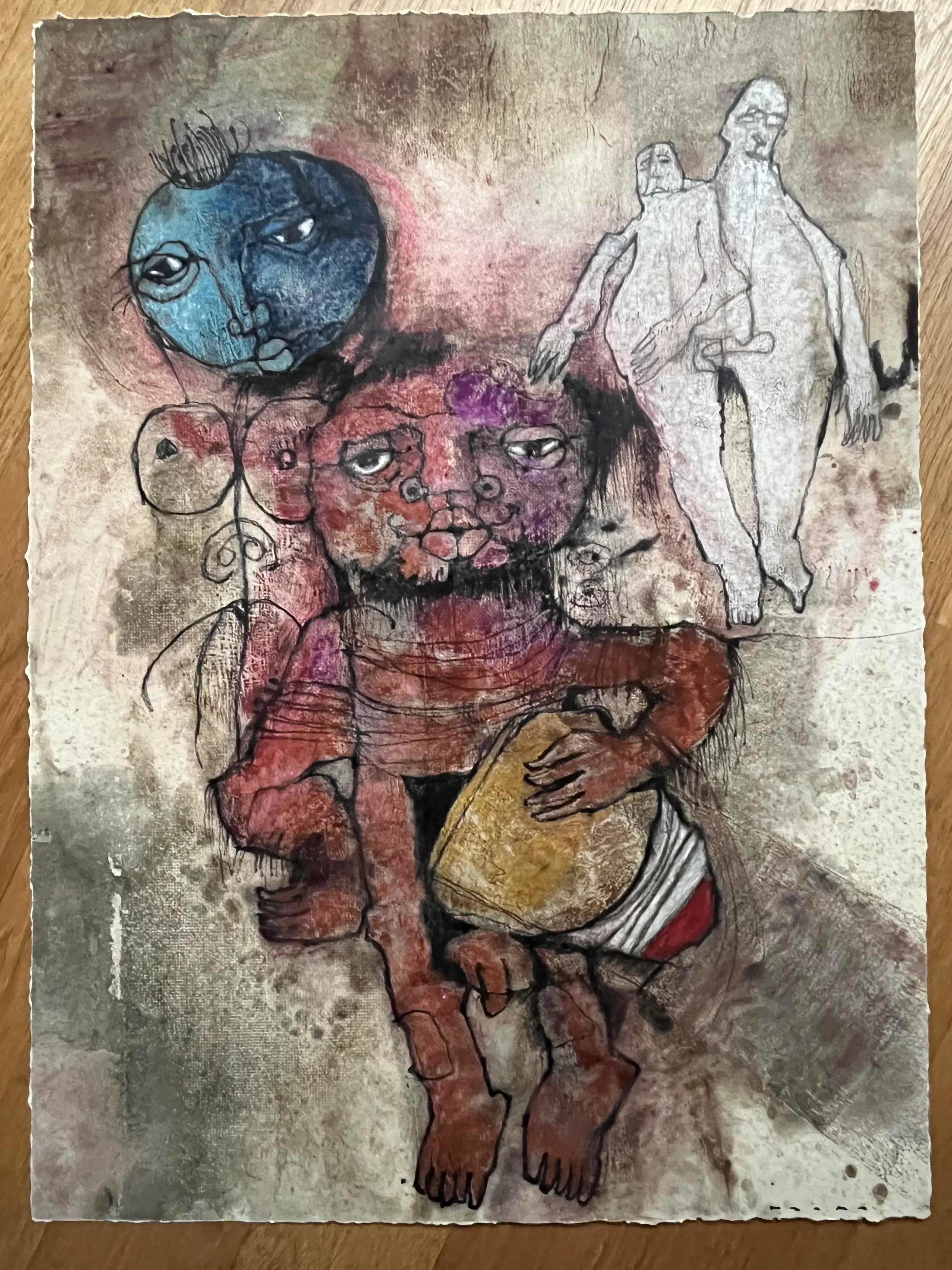 Fraaie gemengde techniek uit de tijd dat de kunstenaar in Zuid-Afrika woonde en werkte. Signeerde zijn werk toen met de naam “ “NZAMA”. Afmeting 60 x 44 cm.