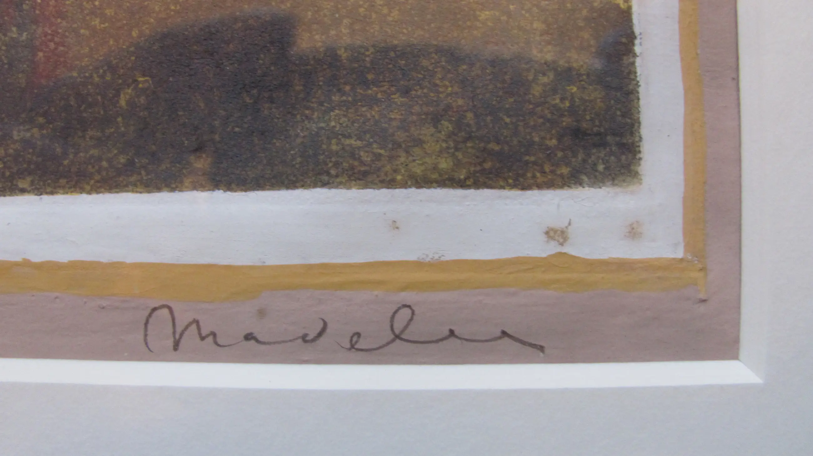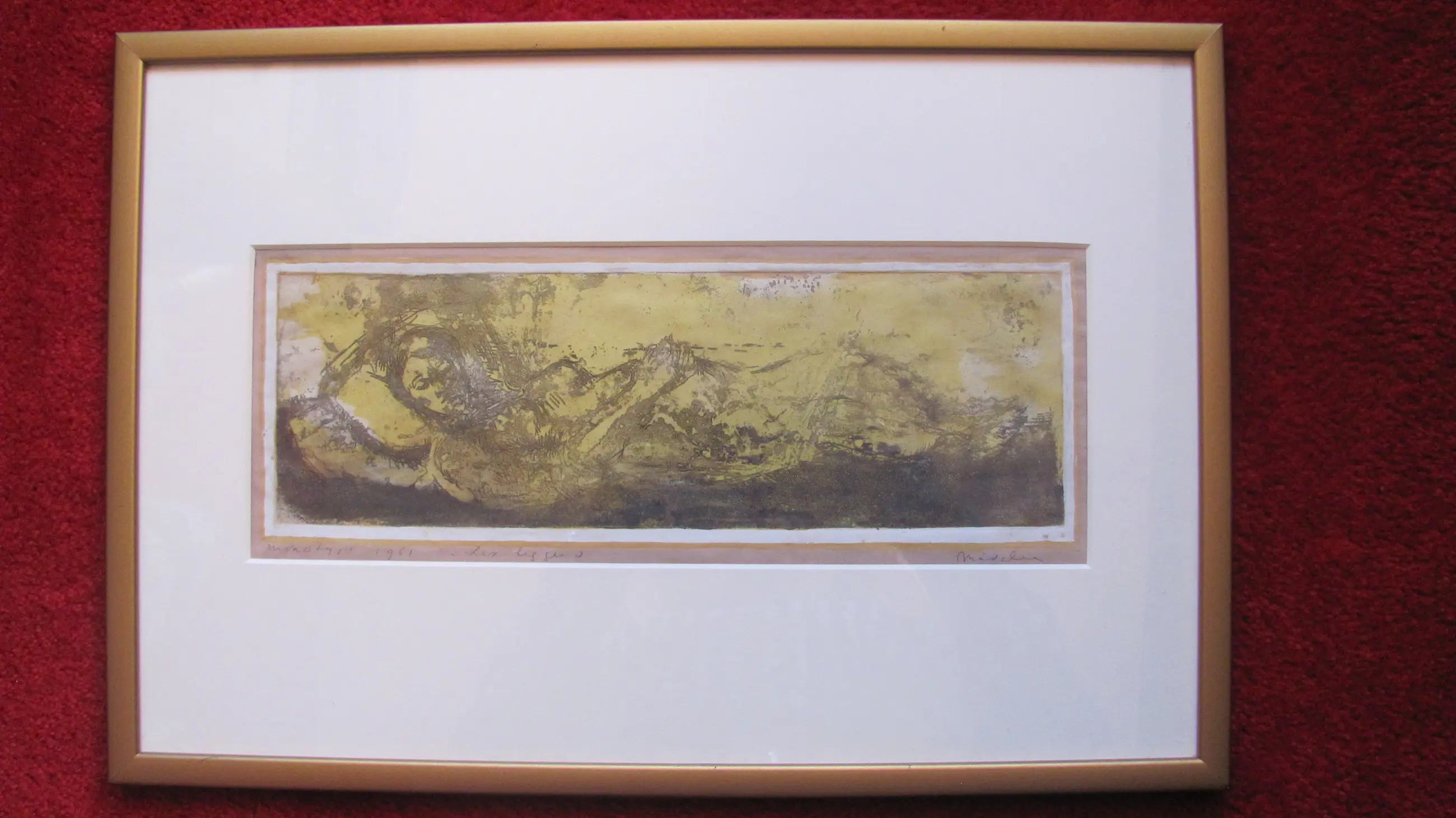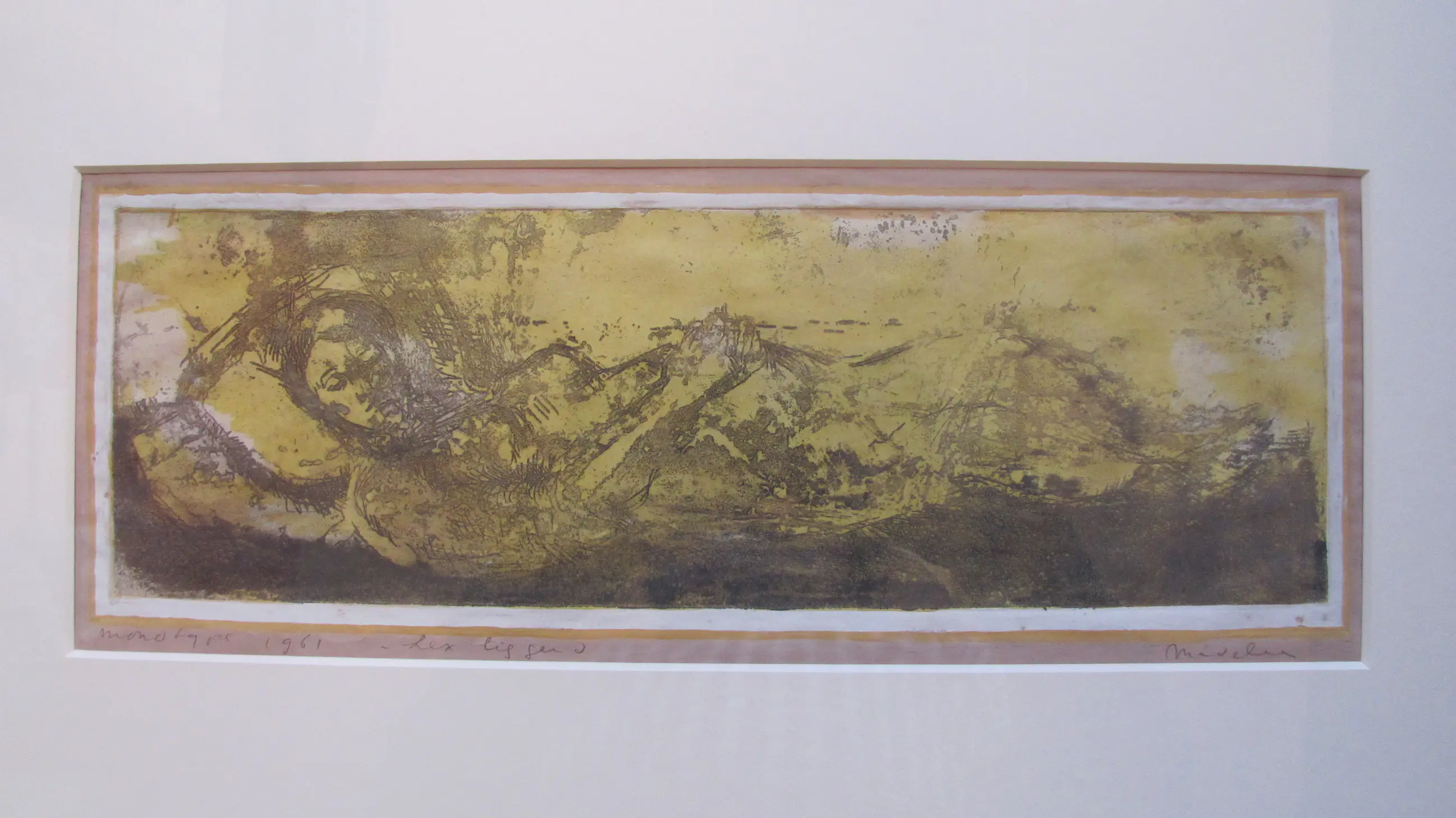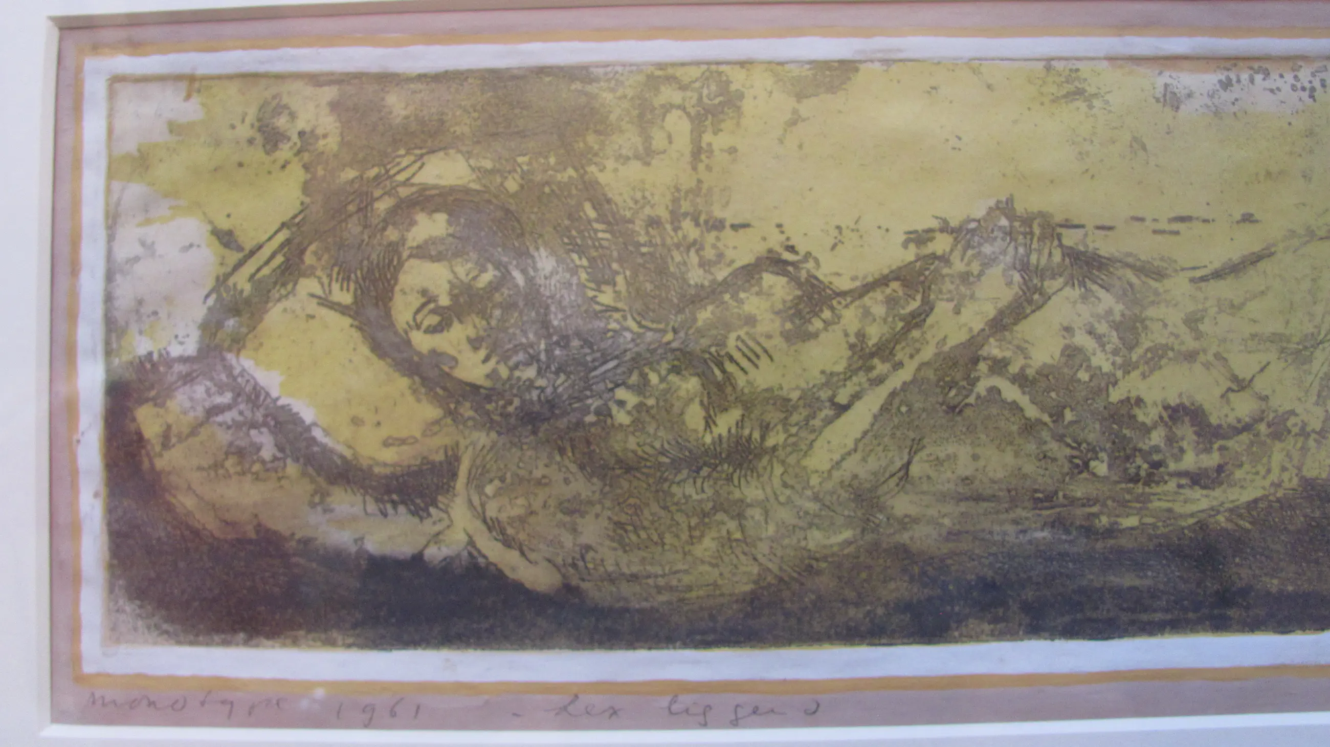 Linksonder in potlood: "monotype" en gedateerd "1961 Daarnaast: "Lex liggend" Rechtsonder gesigneerd: "Madeleen".