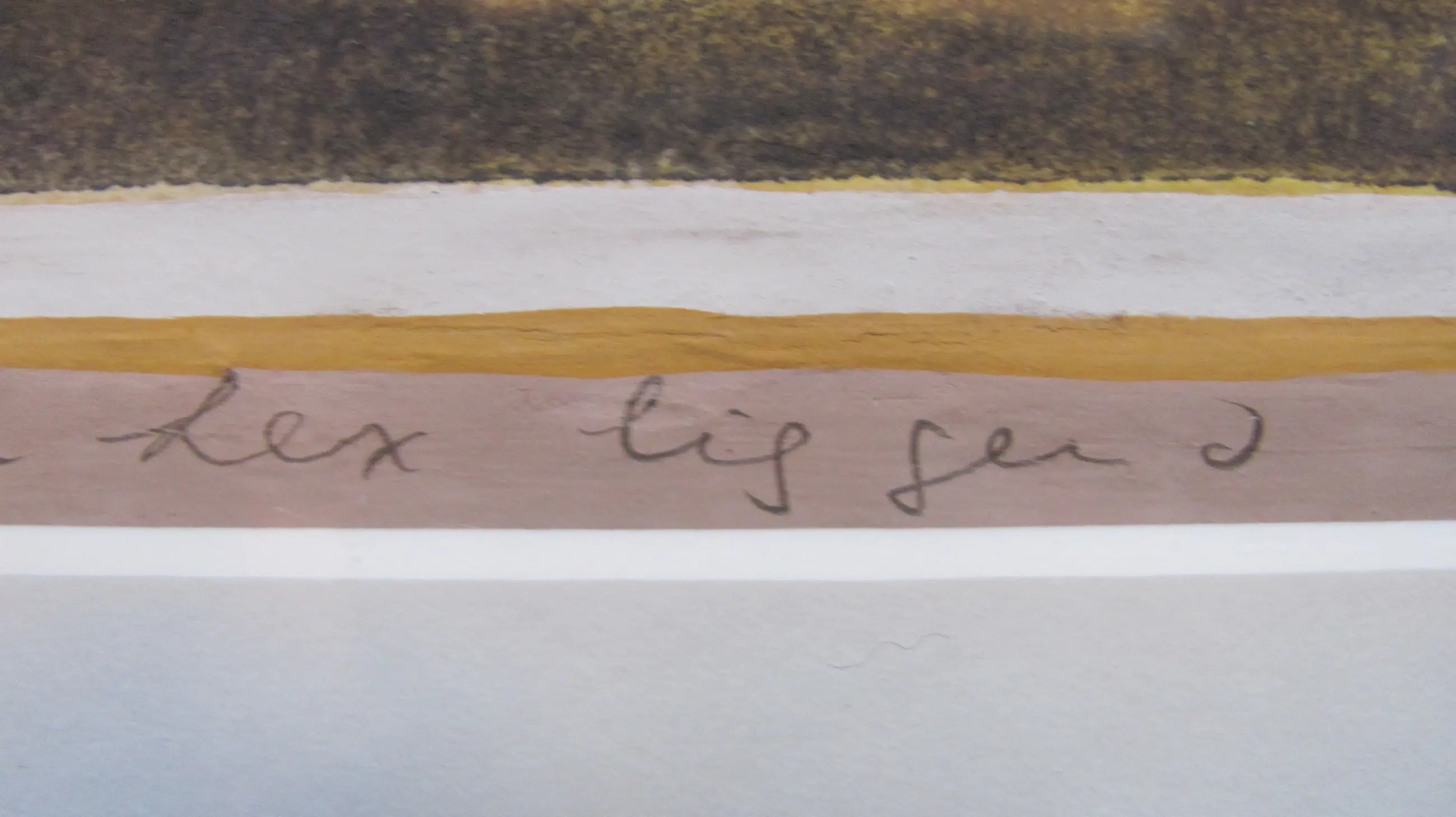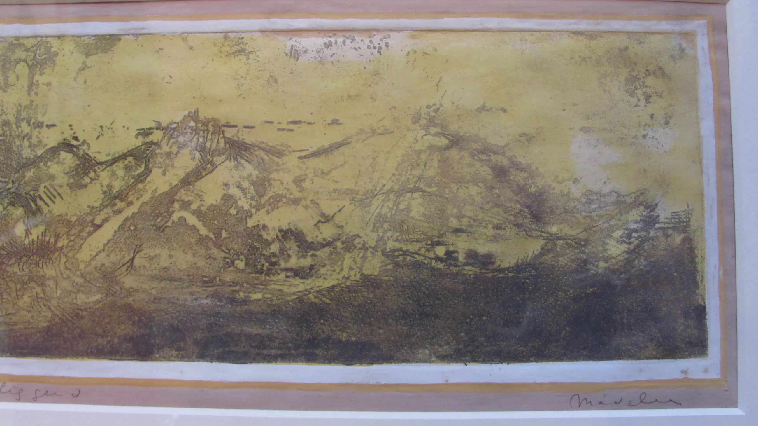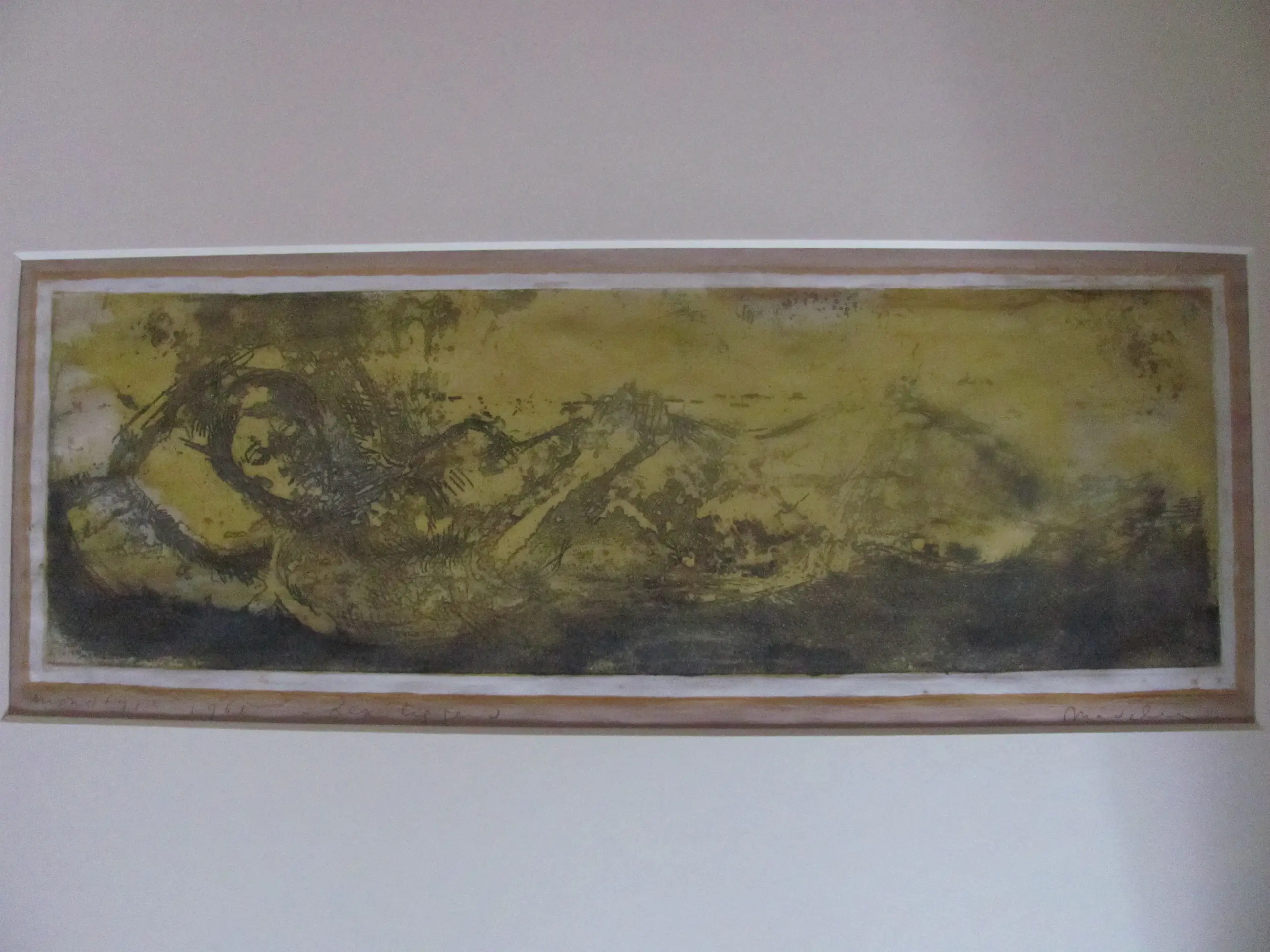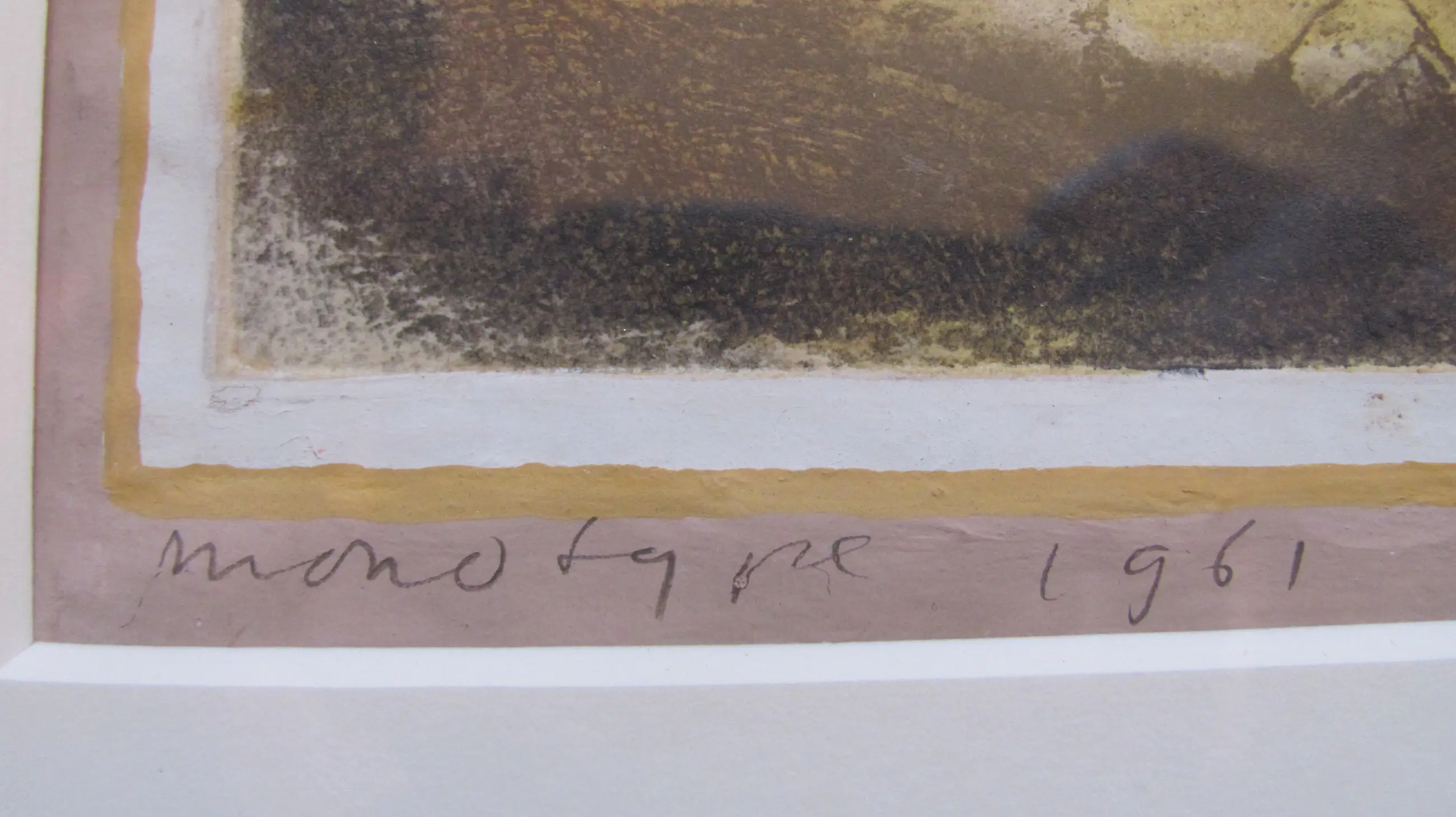 Linksonder in potlood: "monotype" en gedateerd "1961 Daarnaast: "Lex liggend" Rechtsonder gesigneerd: "Madeleen".