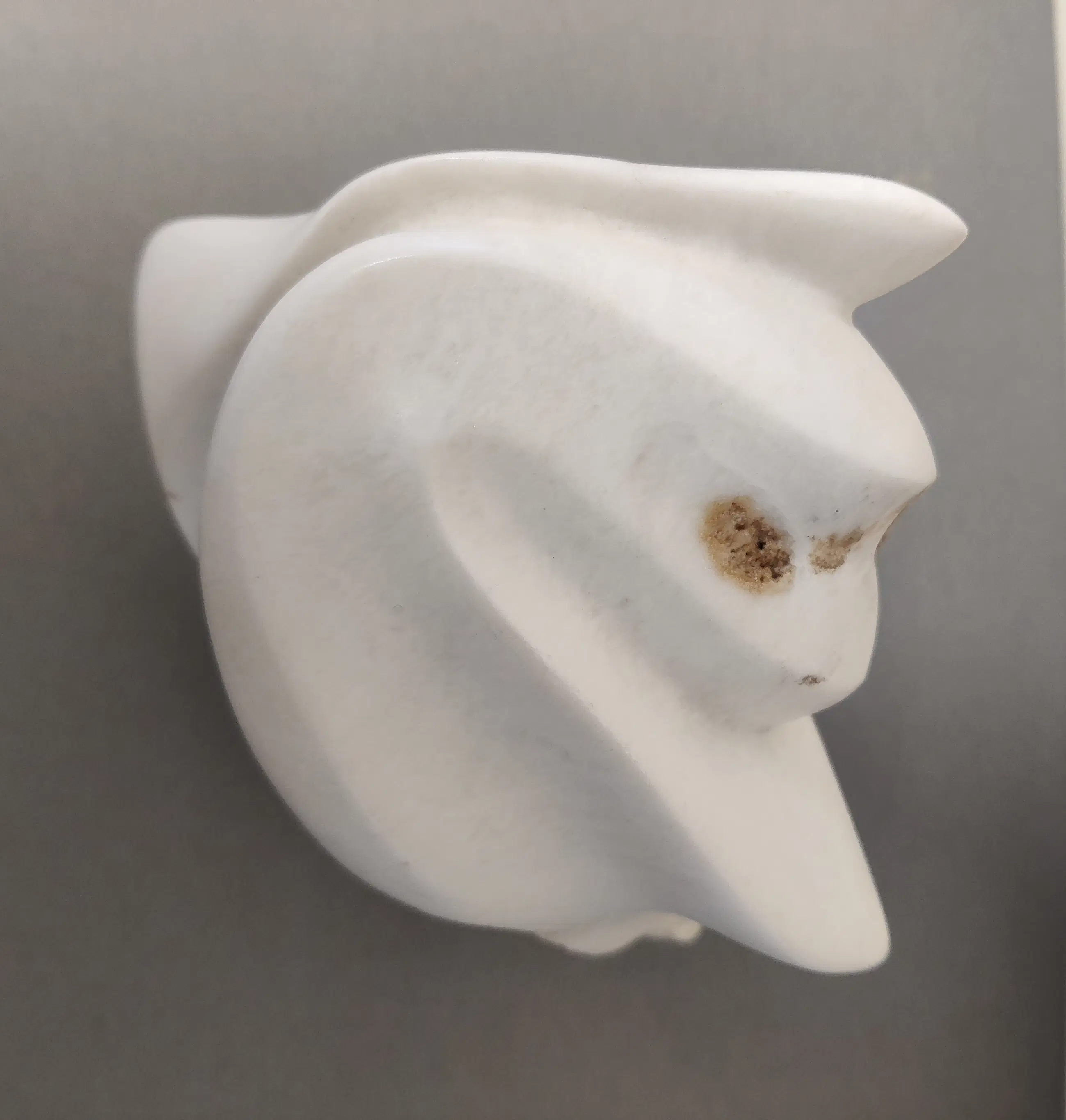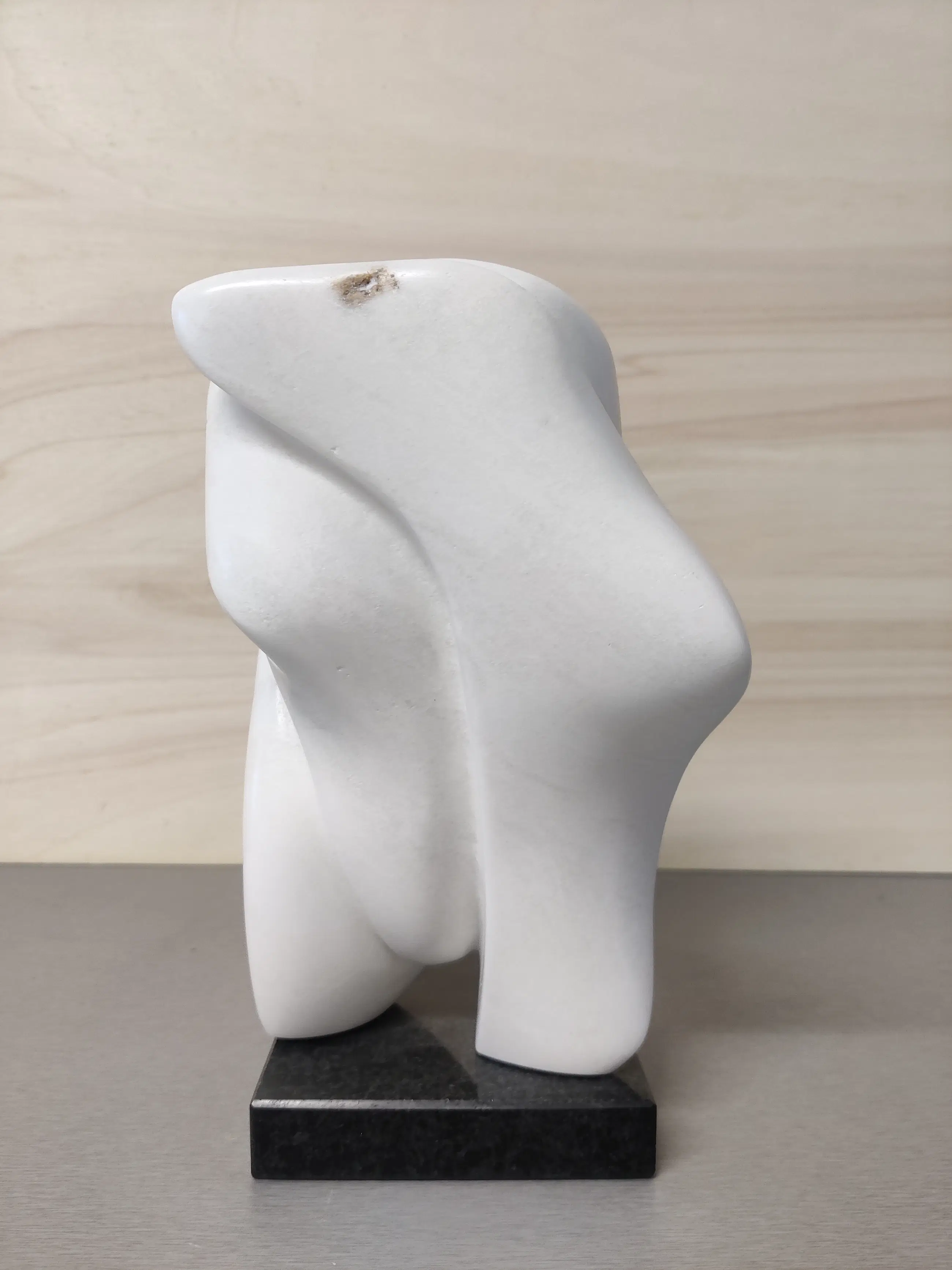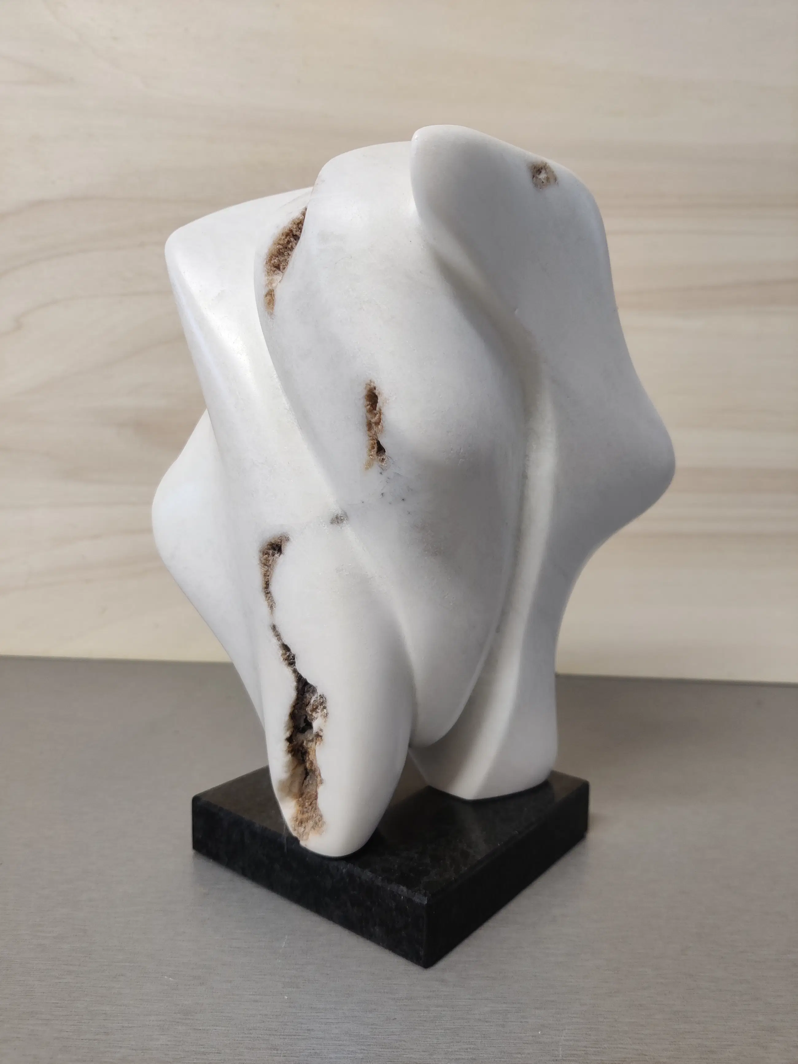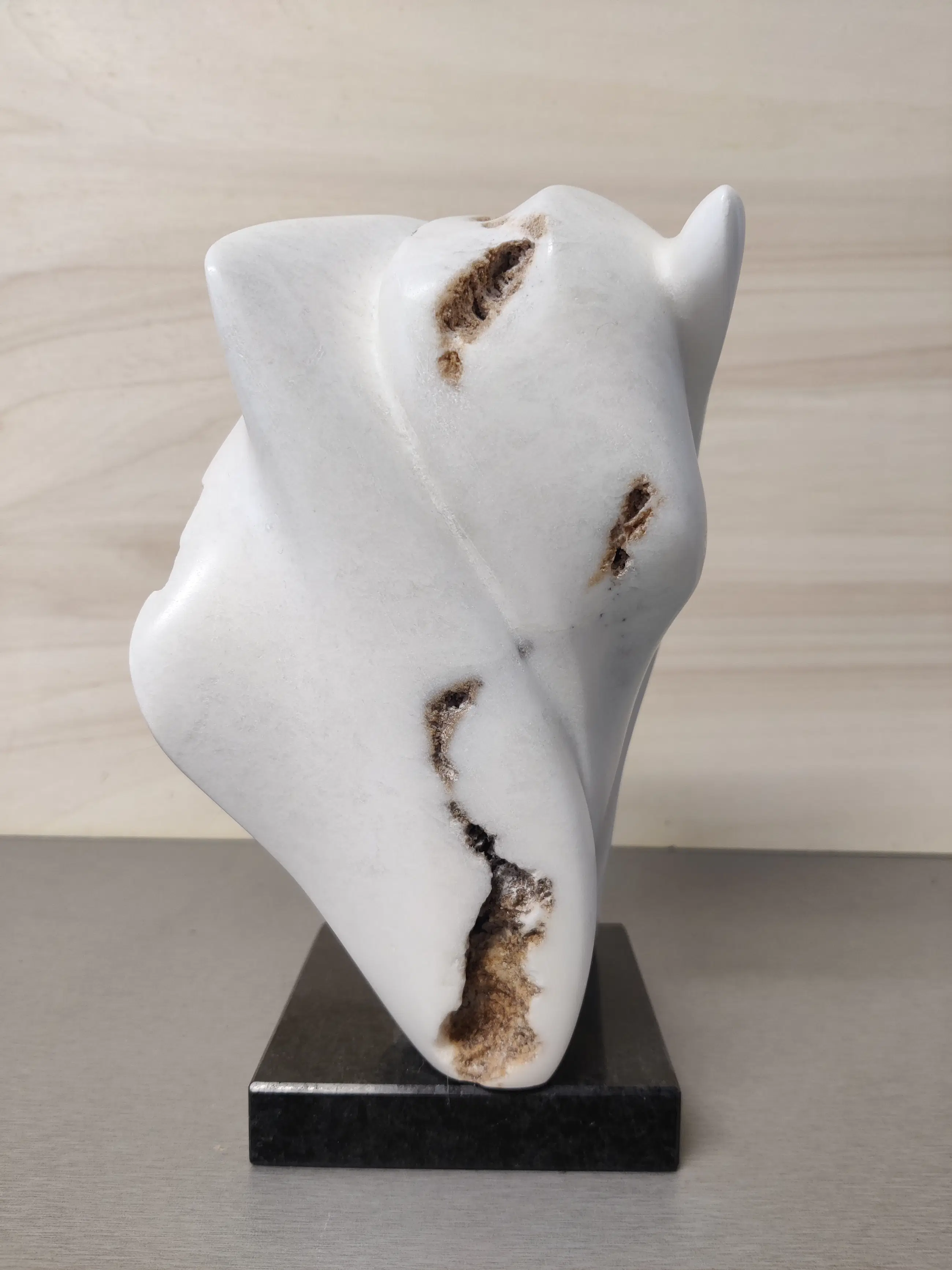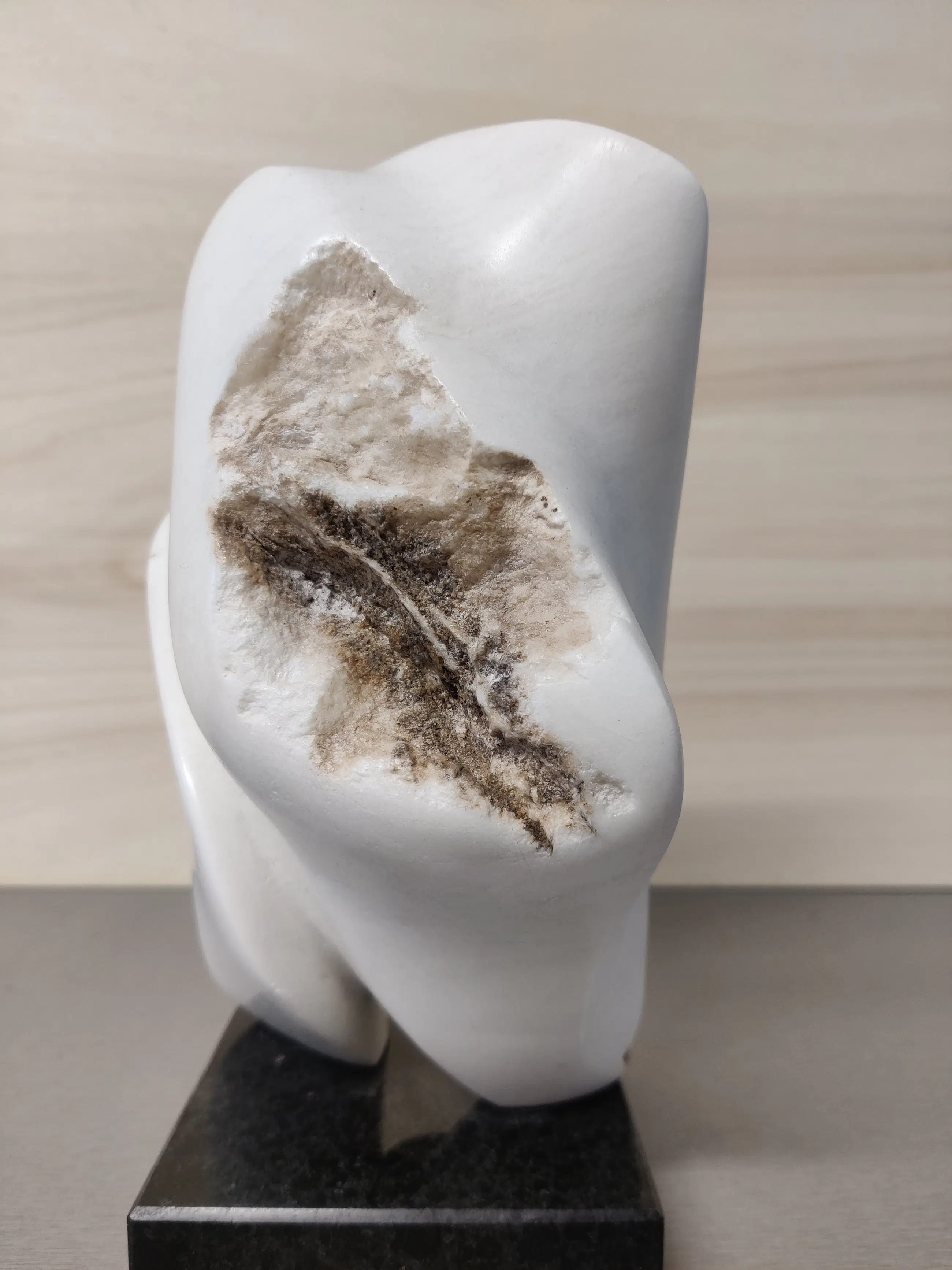 Dit beeld is gemaakt uit een braziliaanse witte speksteen. De interne massa geeft zich bloot.