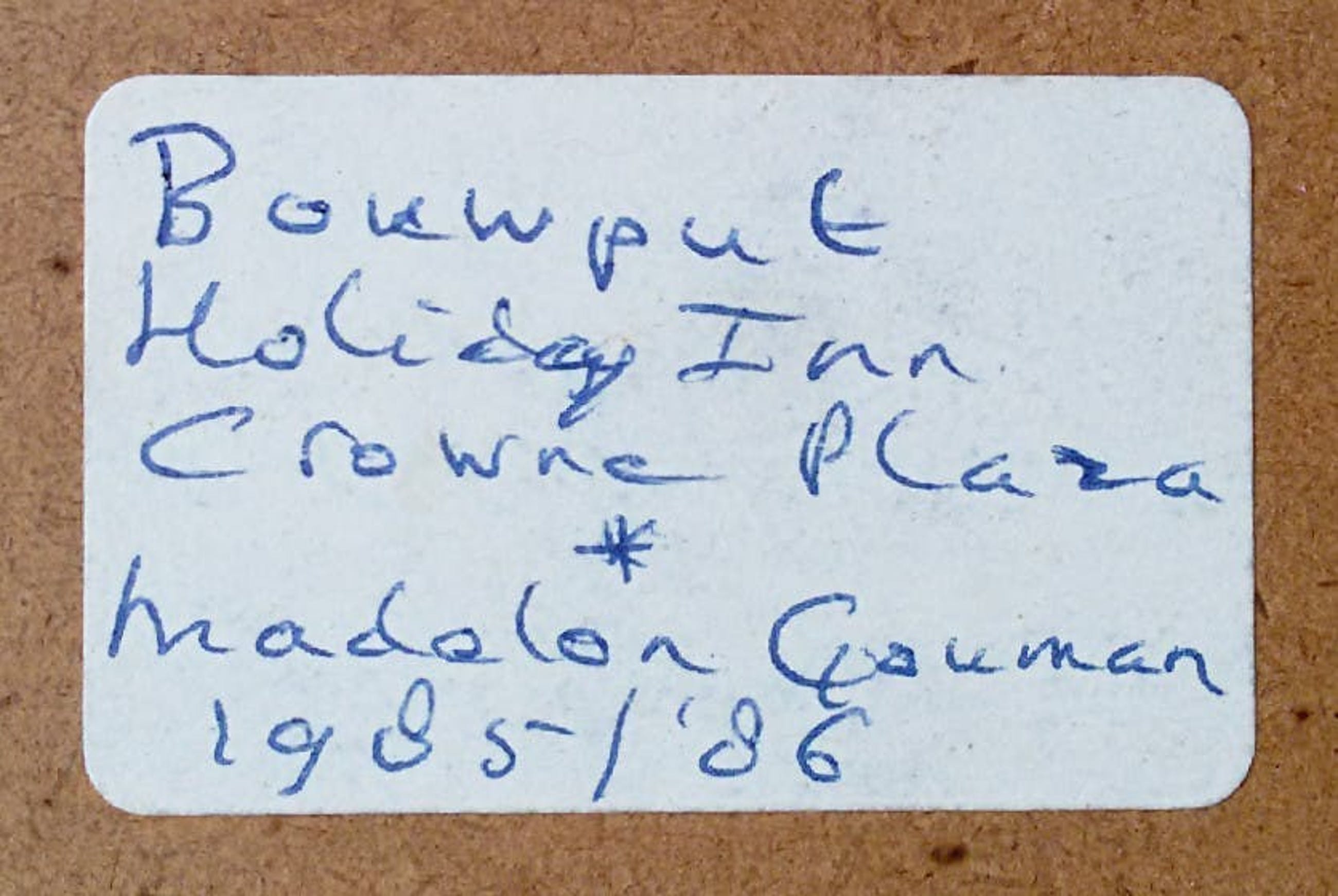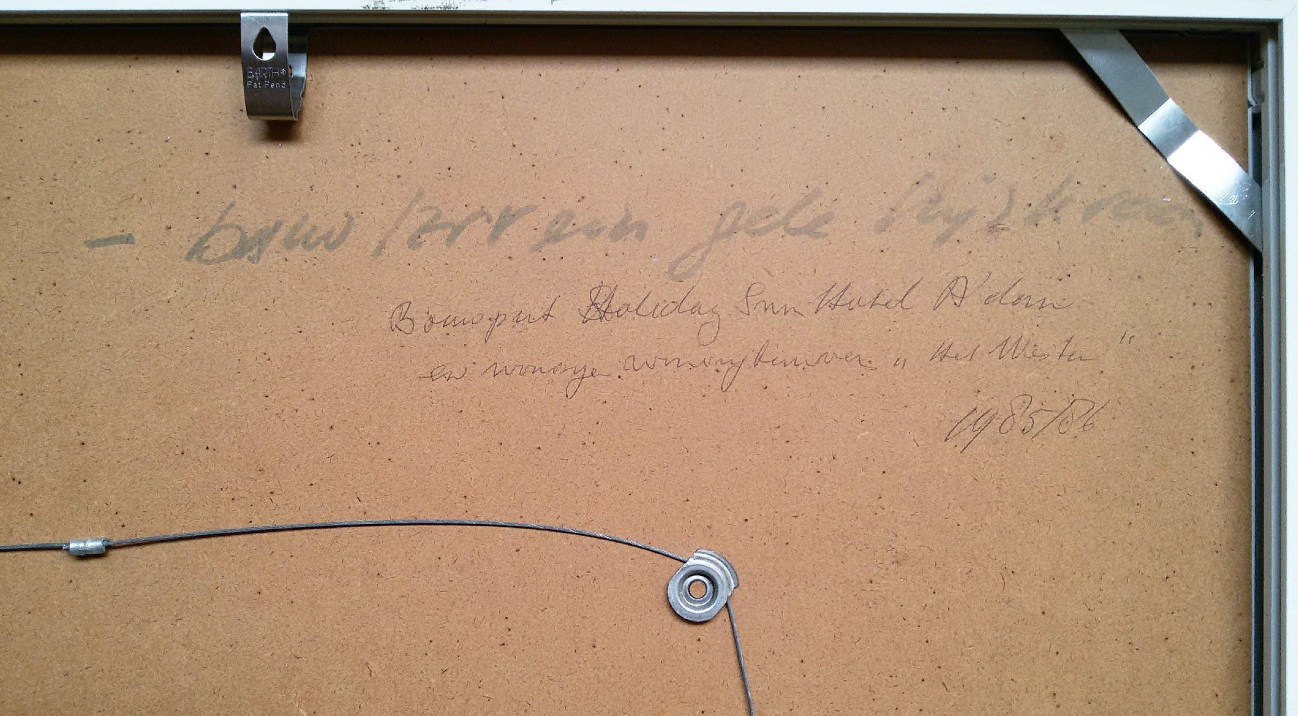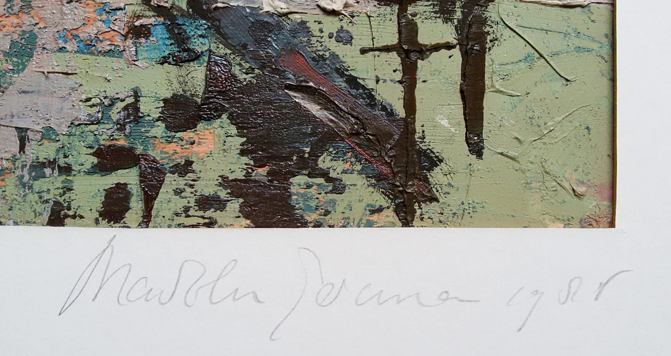 Bijna abstract, zeer pasteus geschilderd werk van Madelon Gouman. De bouwput van het vroegere Holiday Inn Crowne Plaza hotel (tegenwoordig Kimpton DeWitt) aan de Nieuwezijds Voorburgwal in 1985/86. Olieverf op karton gemonteerd in passe-partout, met potlood op het passe-partout gesigneerd en gedateerd, in verso omschreven en nogmaals gedateerd. In witmetalen lijst en achter glas. Alles in goede conditie, alleen zit er een barstje in het glas in de hoek linksonder.