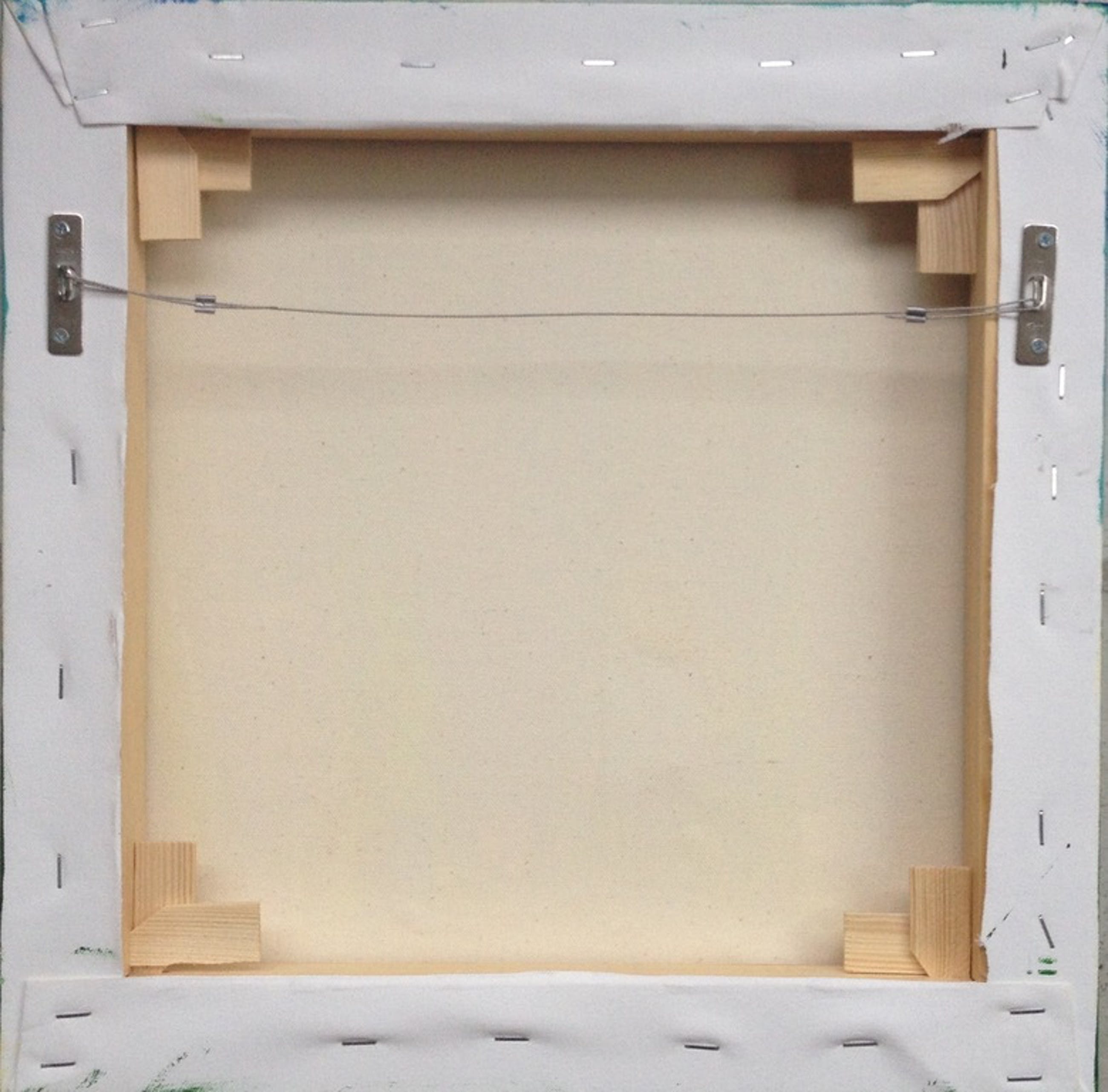 De zijkanten van het doek zijn mee geschilderd (foto 2) en voorzien van een ophang systeem (foto 3), het werk kan dus zo aan de muur.