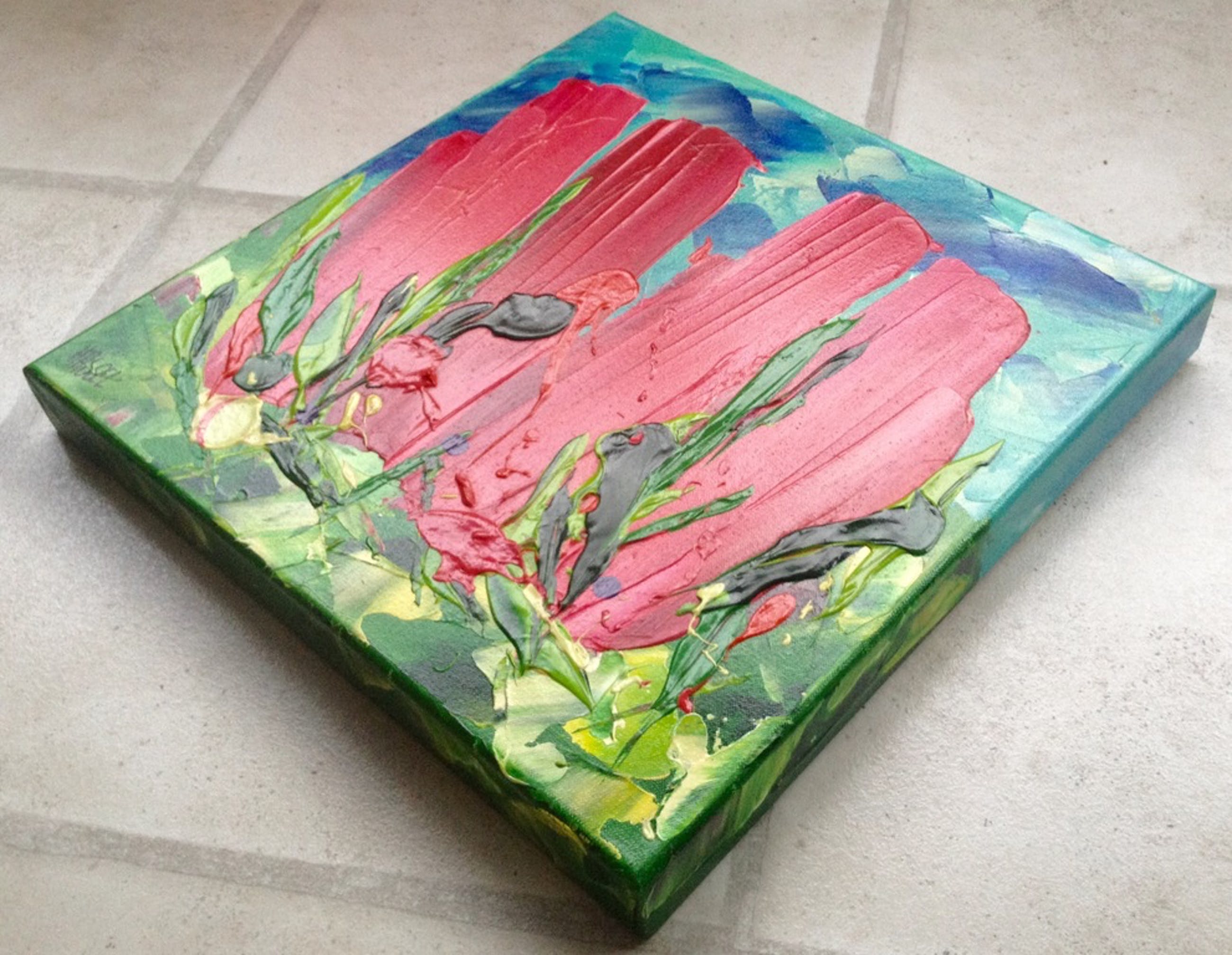 Betreft een hand geschilderd 3D doek door Ad van Hassel. Tulpen in een veld, geschilderd met acrylverf.