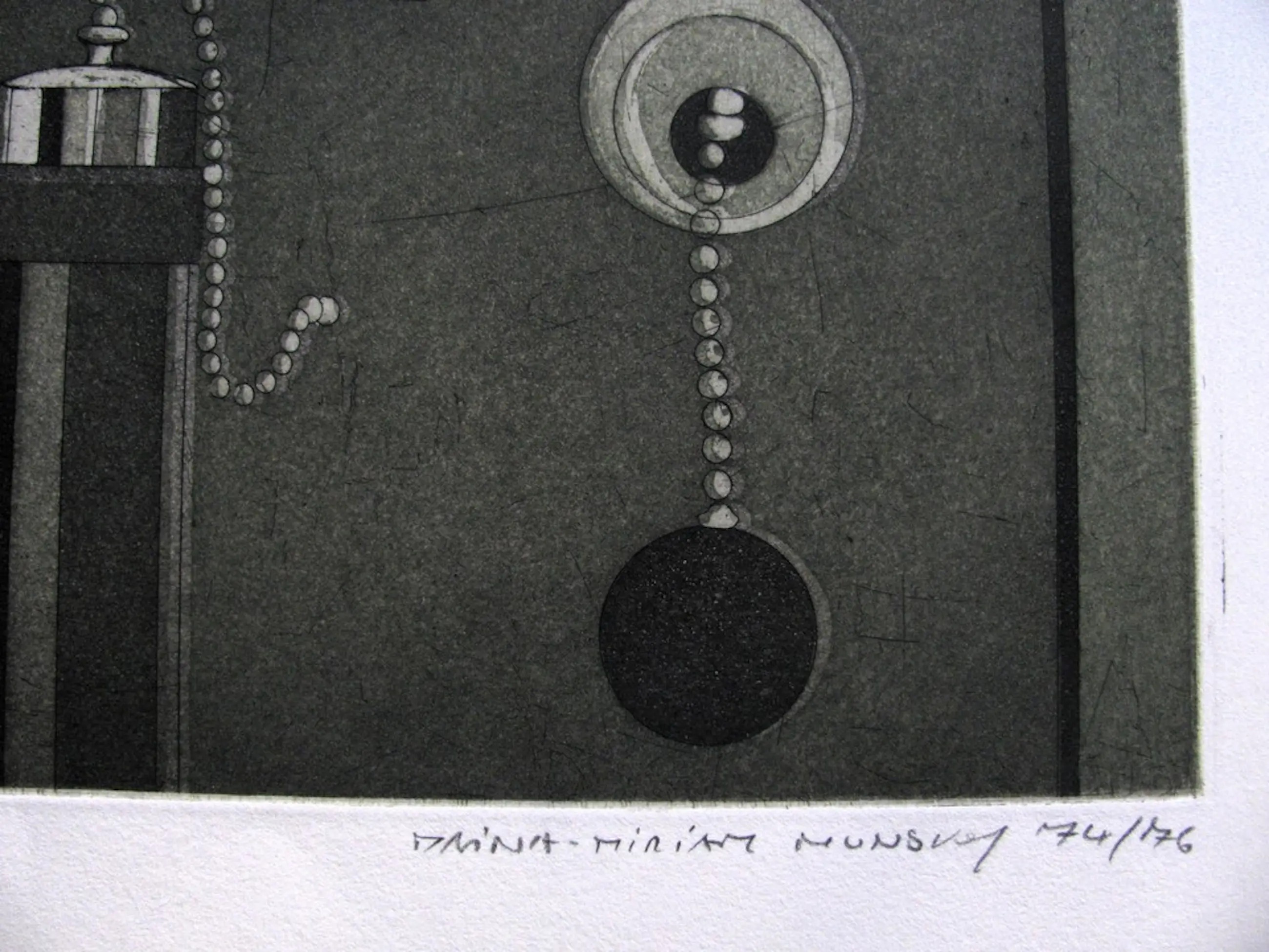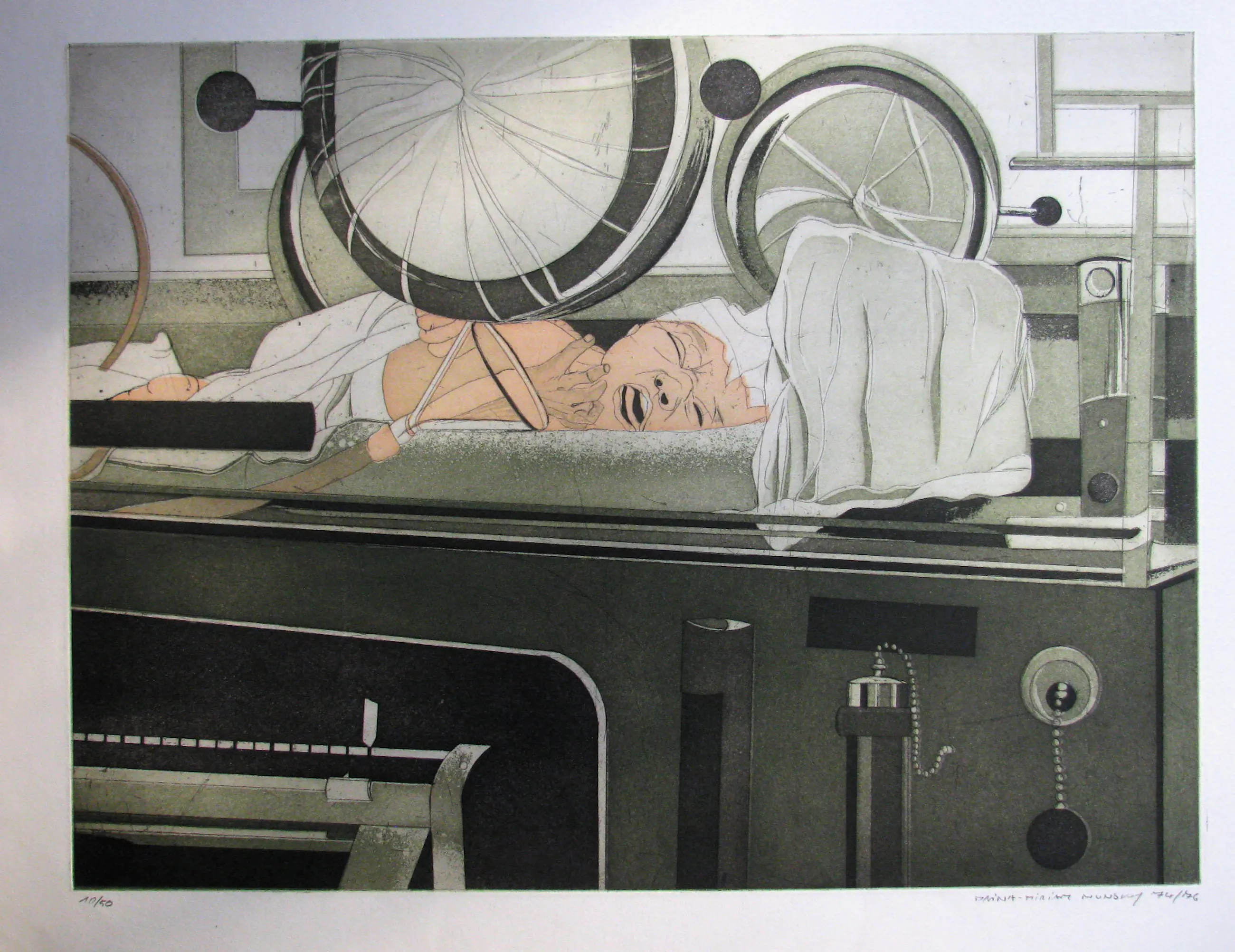 Grootformaat ets, 45 x 60 cm (54 x 77 cm per vel) op handgeschept papier. Gesigneerd en gedateerd met potlood 74/76. Pagina 10 van 50. In zeer goede staat. Schitterende print met een volledig rafelige rand.
