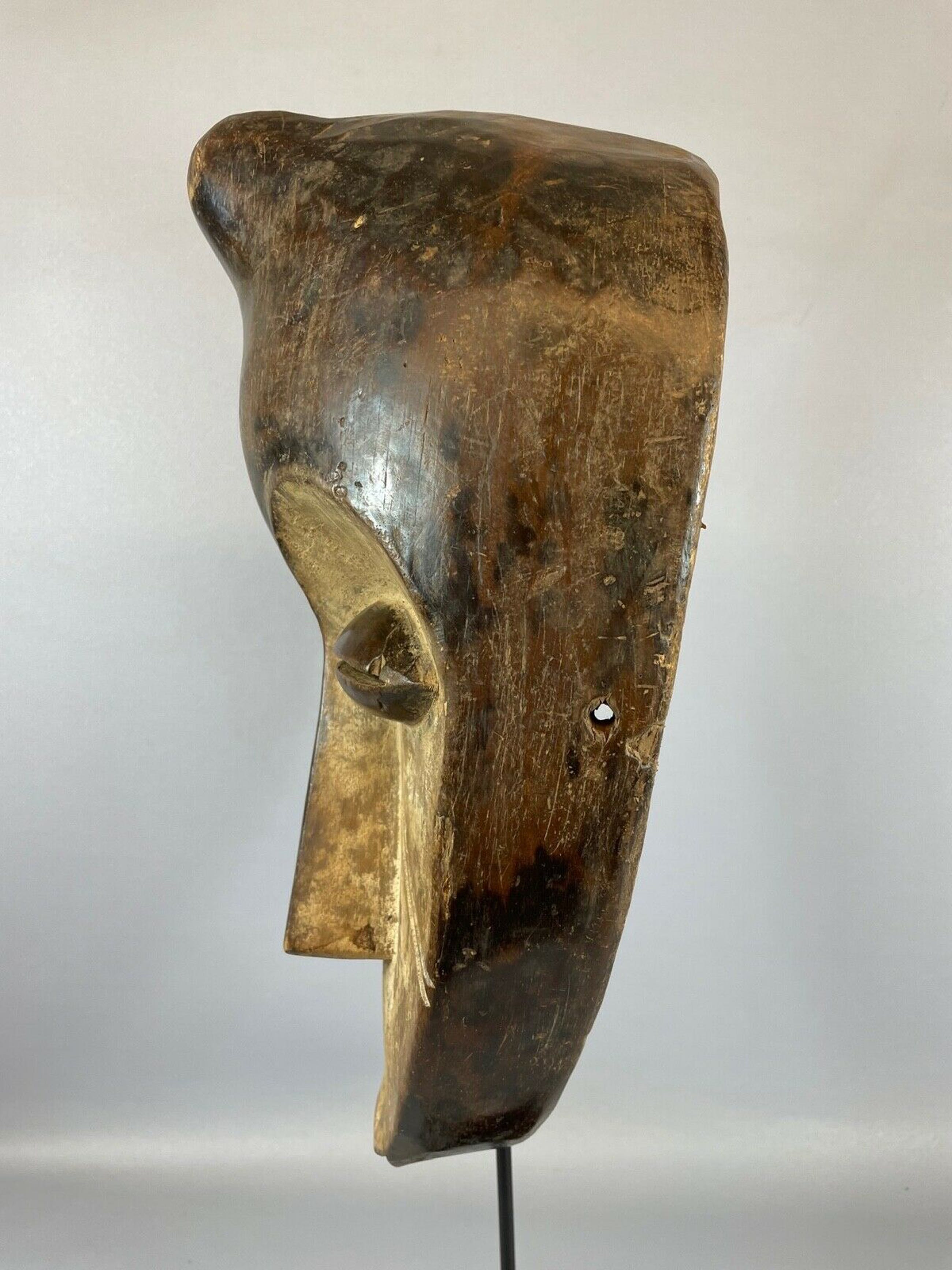 African mask from the Mahongwe, Gabon. This type of mask belongs to a group of masks meant to protect a village from any harm (witchcraft, dispute, misfortune). Hand carved from a single piece of wood, with color pigments. Height: 36 cm.