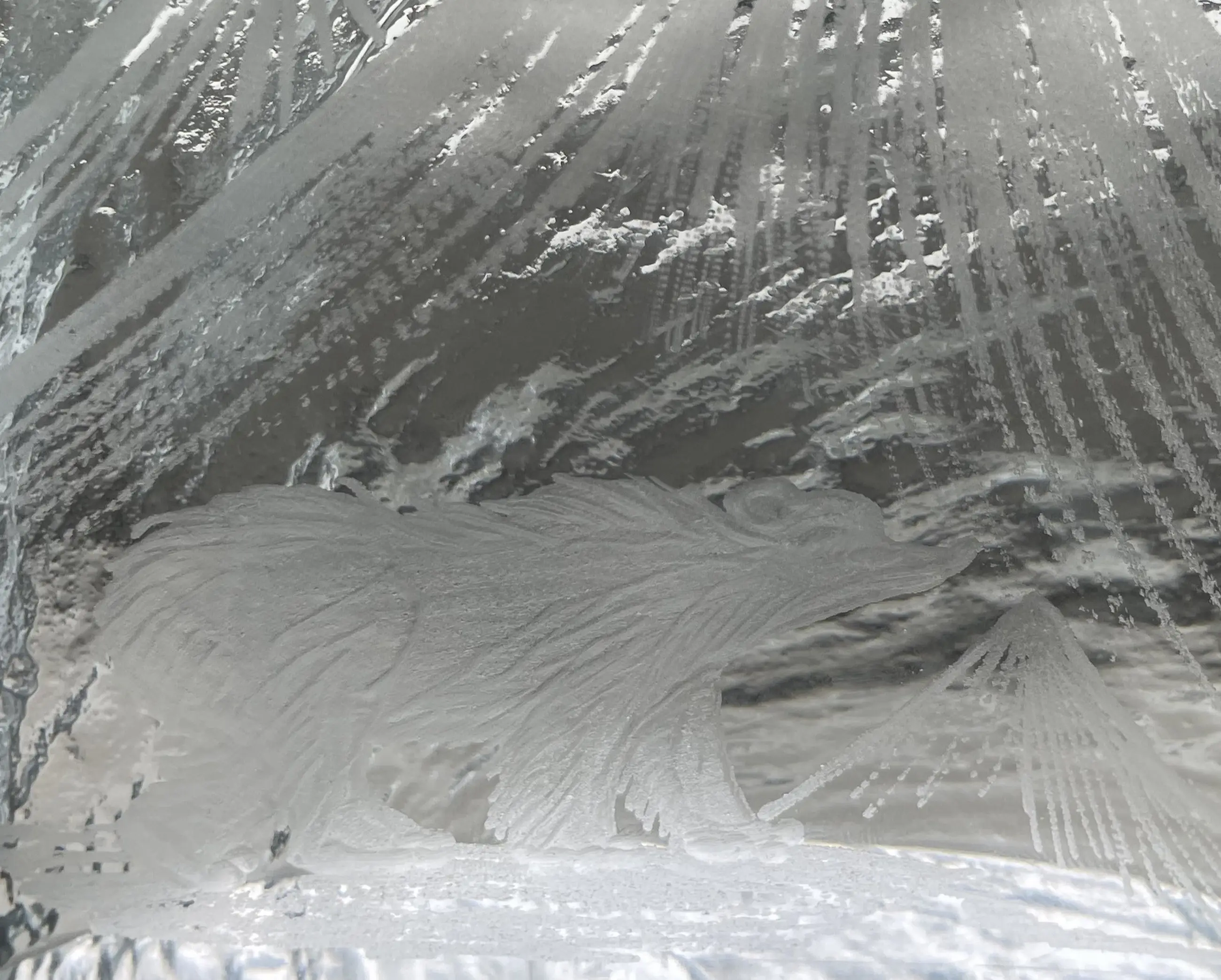Grote vintage ijsblok glazen object of Presse papier met geëtste afbeelding van een beer met op de achtergrond twee bergen. Aan de achterkant met de hand gesigneerd - helaas onduidelijk en gedateerd 1970.