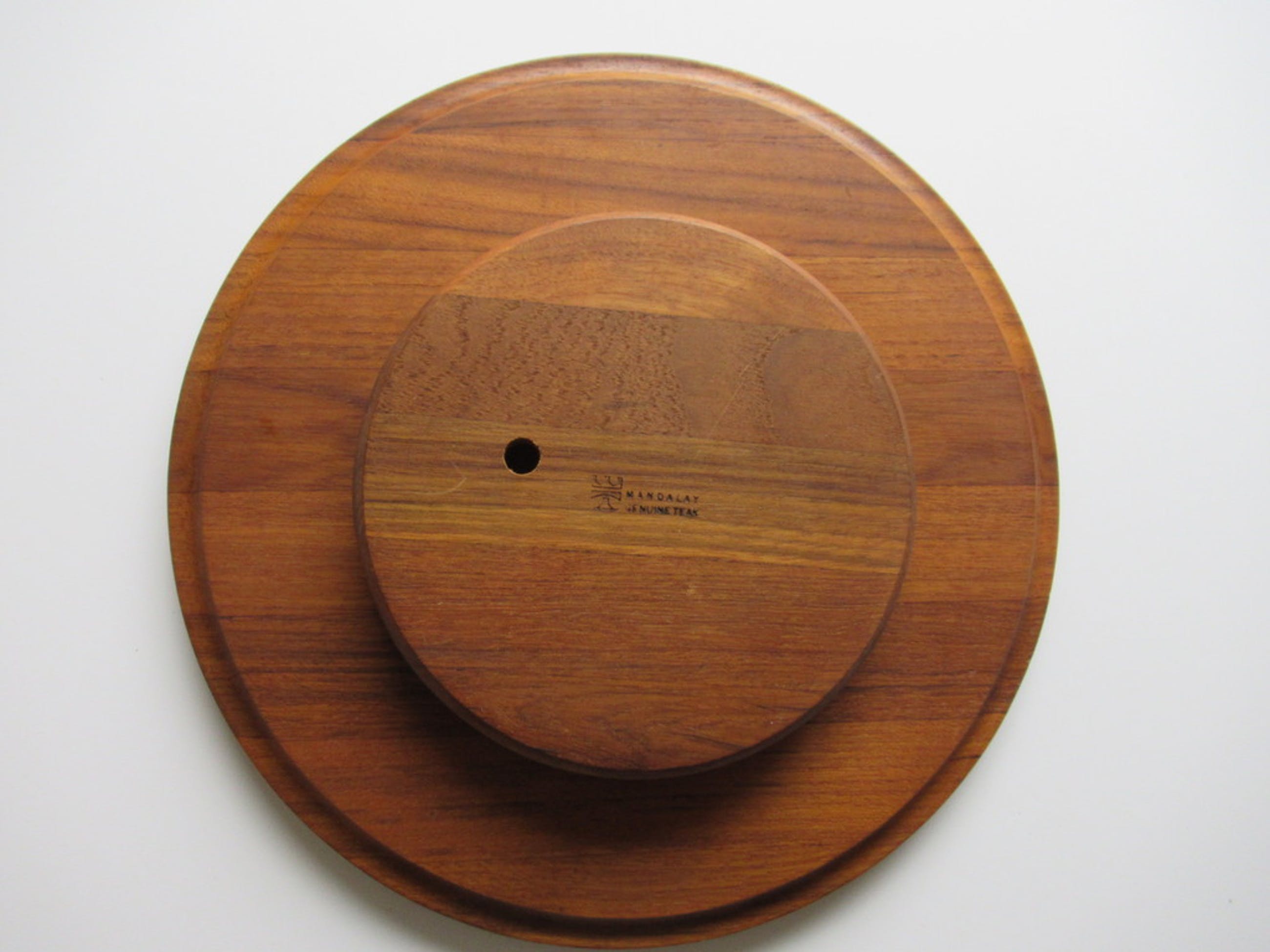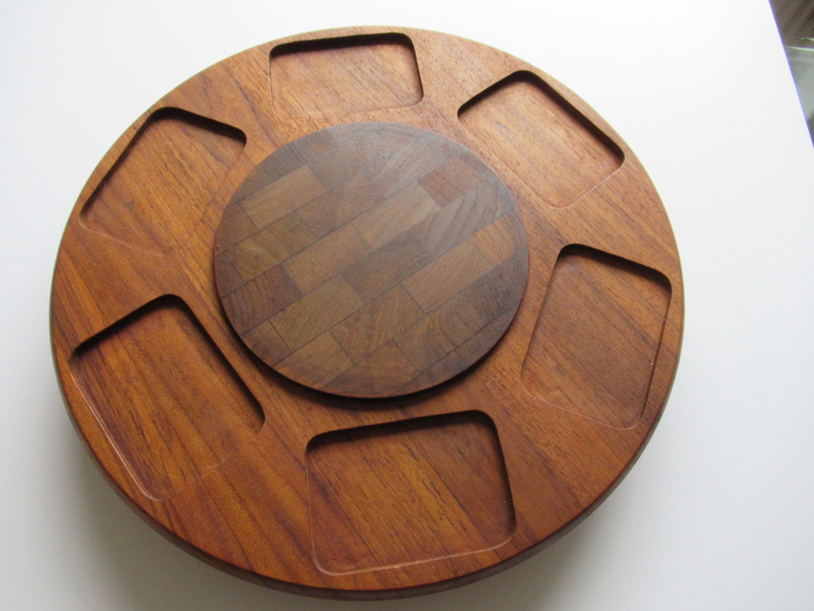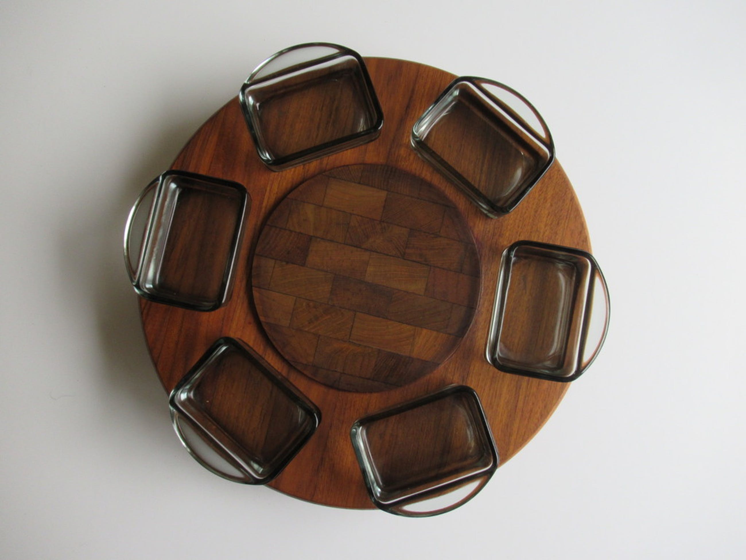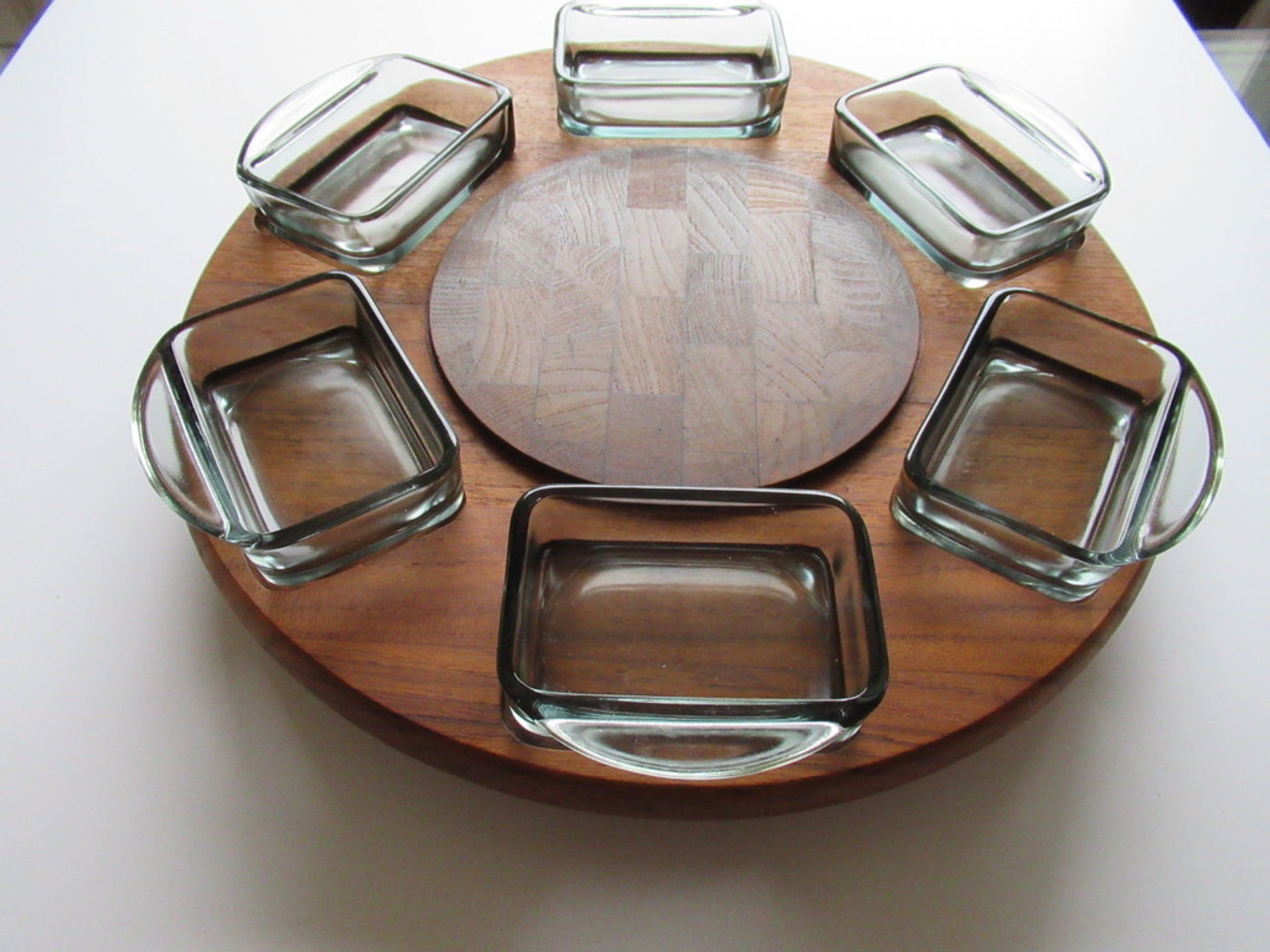 Mooie draaibare genuine teak presenteerplateau met zes glazenbakjes.
