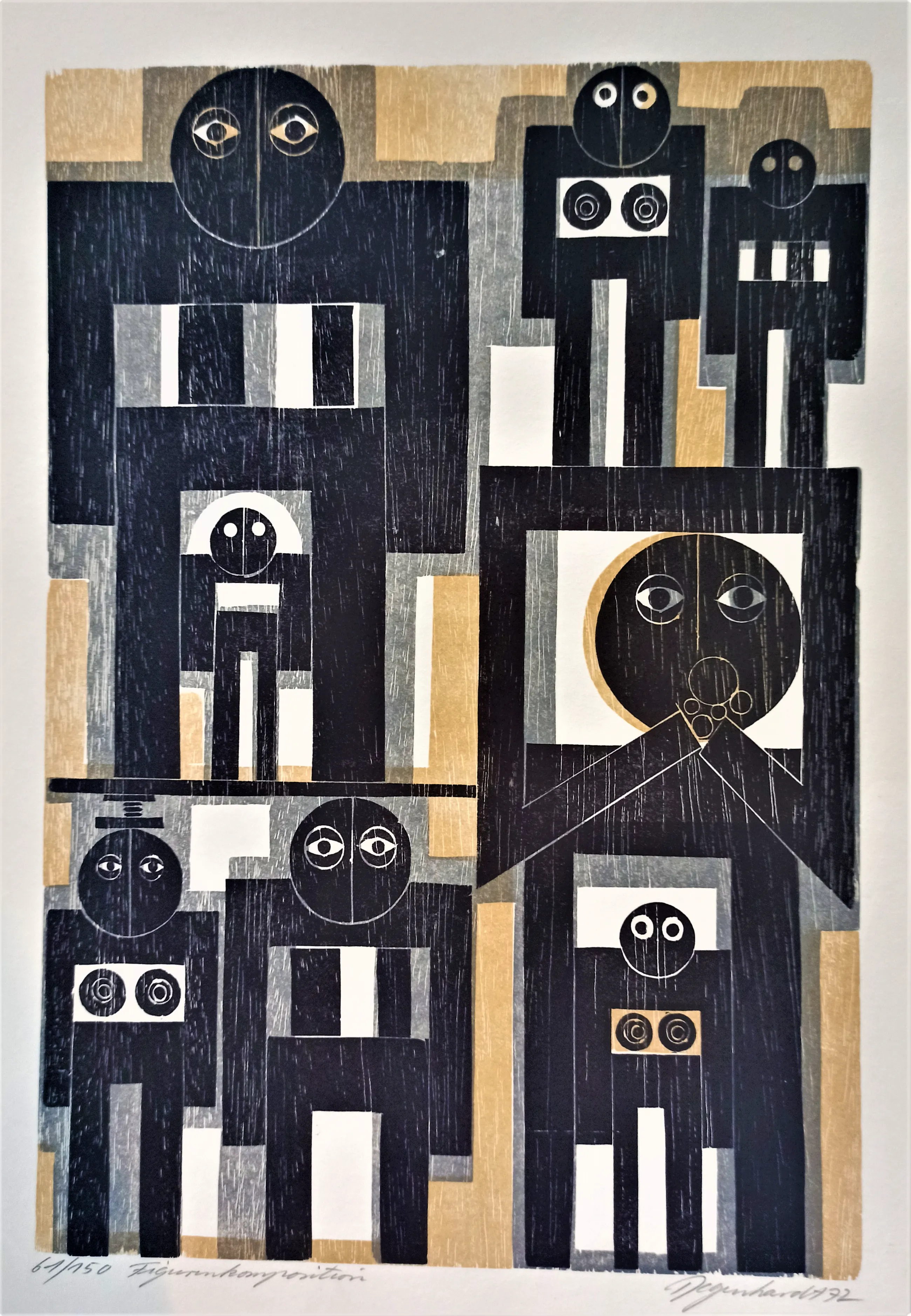 Manfred DEGENHARDT, geboren in Sigmaringen in 1940, studeerde beeldhouwkunst, grafiek en kunstgeschiedenis aan de Academie voor Schone Kunsten in Stuttgart (onder meer bij Herbert Baumann). Manfred Degenhardt werd bekend door zijn houtsneden. Degenhardt wordt beschouwd als de belangrijkste opvolger van HAP Grieshaber. Degenhardt werkt met een hoge mate van precisie en esthetische fijnheid aan het houten drukblok. De werken van Degenhardt - in het hier aangeboden blad de constructivistische compositie van figuren - nemen ook thema's uit de oude mythologie en Keltische kunst over, deels figuratief en abstract gecomponeerd, zoals op dit blad hier. De houtsnedekunstenaar heeft onder meer geëxposeerd in Londen, New York en Chicago.