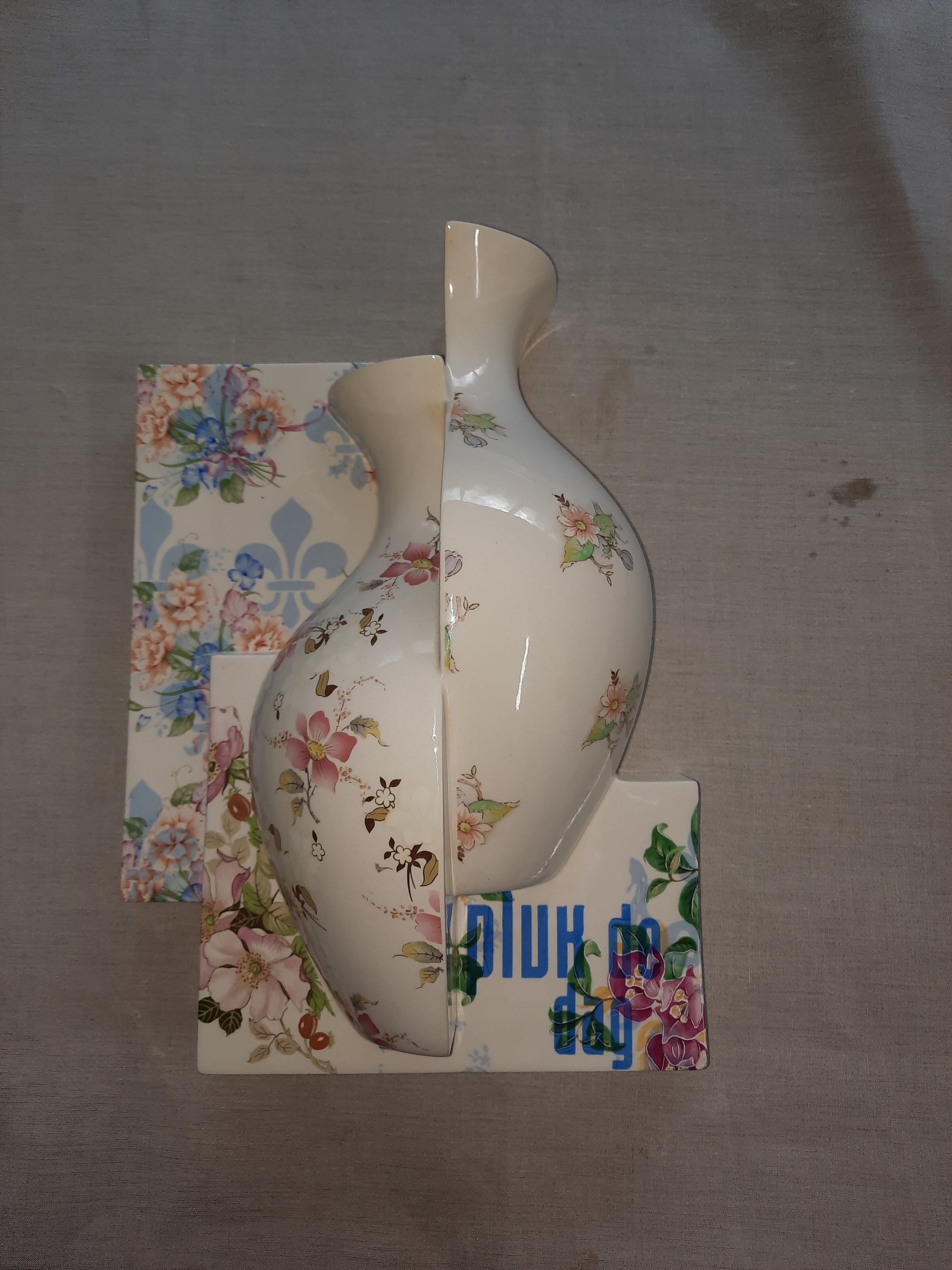 Mooi gegoten wandvaas van keramiek. Rechterbovenzijde is open voor bloemen, 7 cm doorsnee. PLUK DE DAG Met bloemdesign en blauwe franse lelies. Gemerkt aan de achterkant: KOP, ontwerp Manita Kieft.