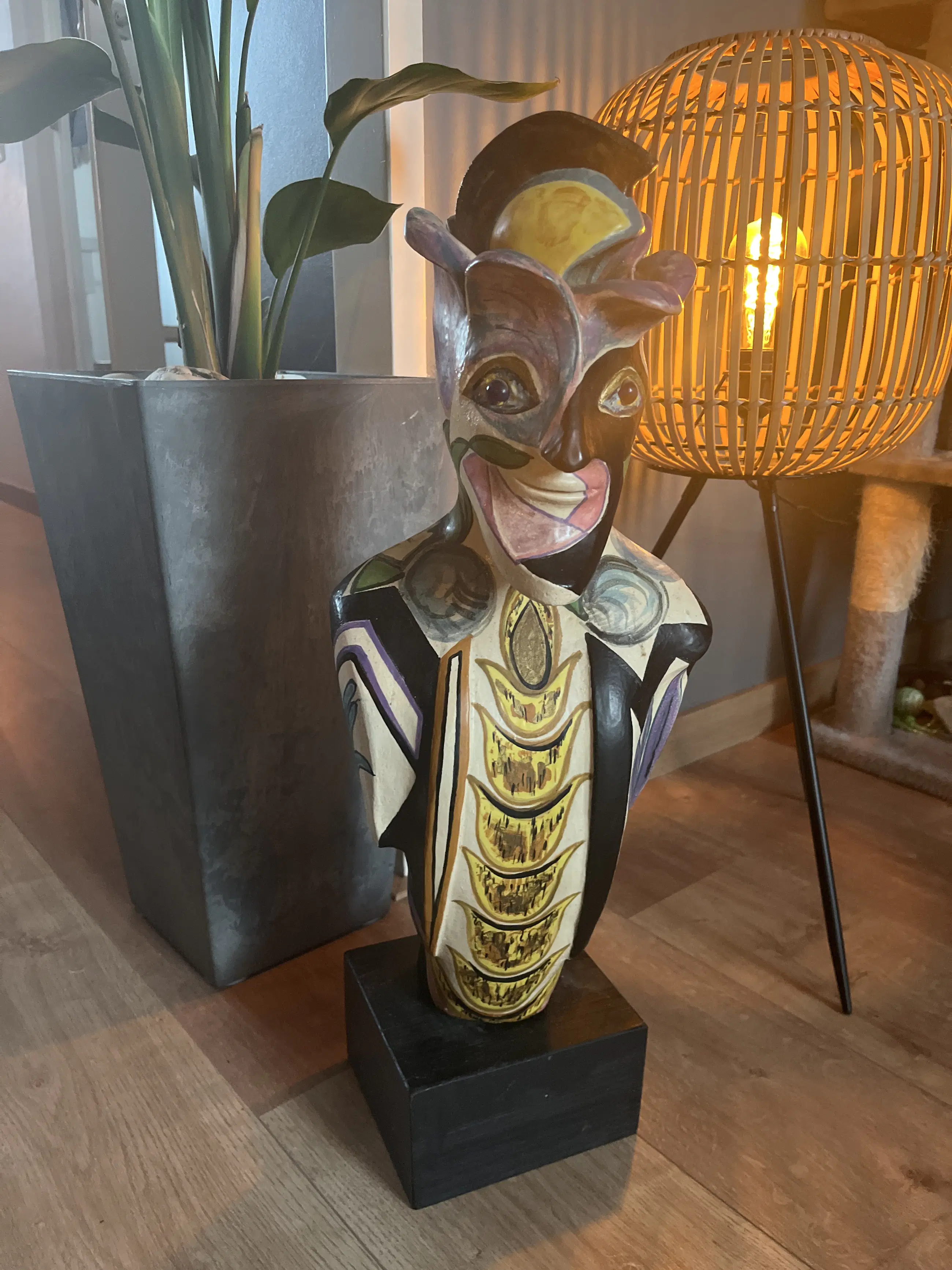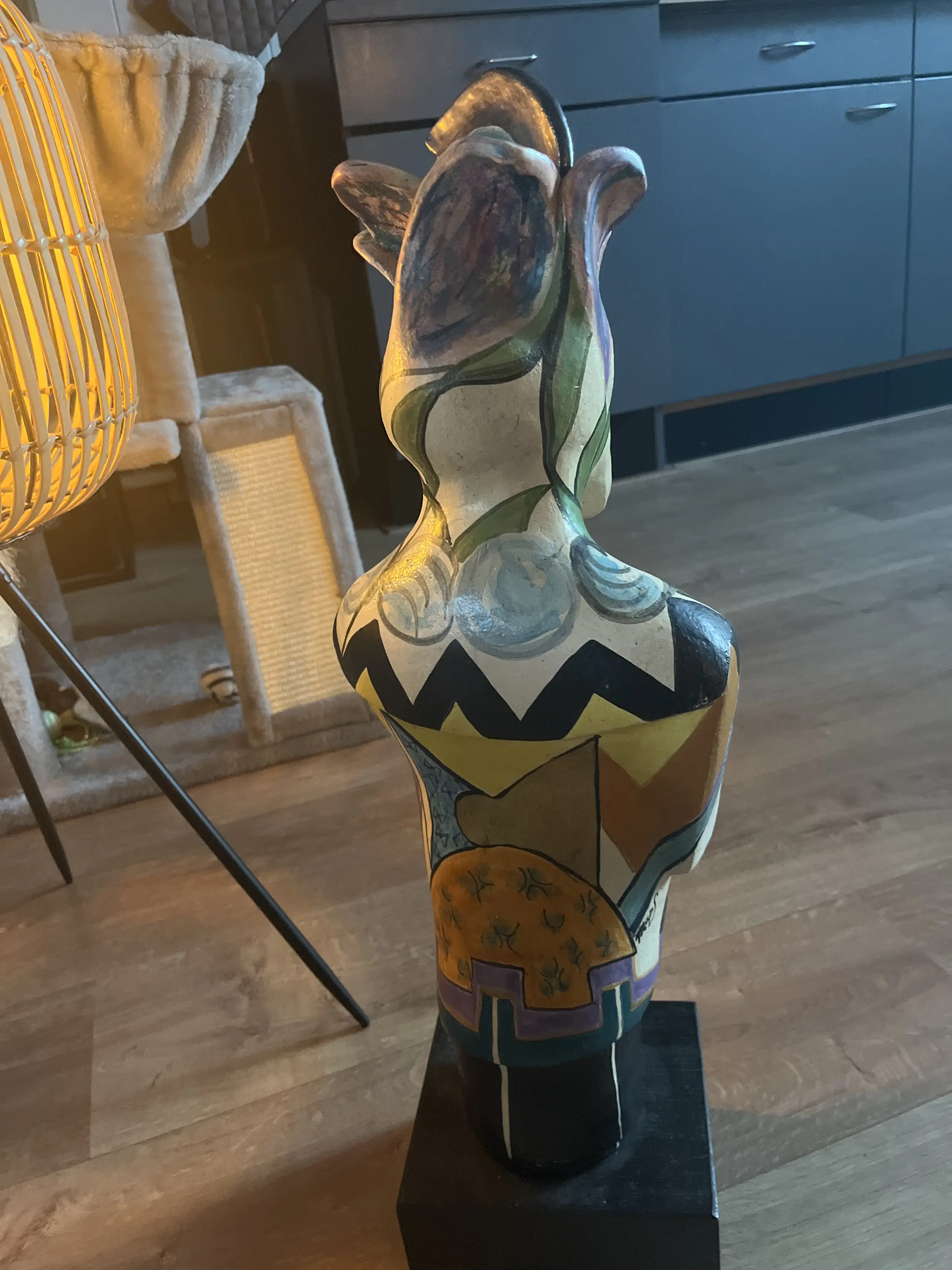 Mooi kunstwerk plateel techniek keramiek op houten standaard