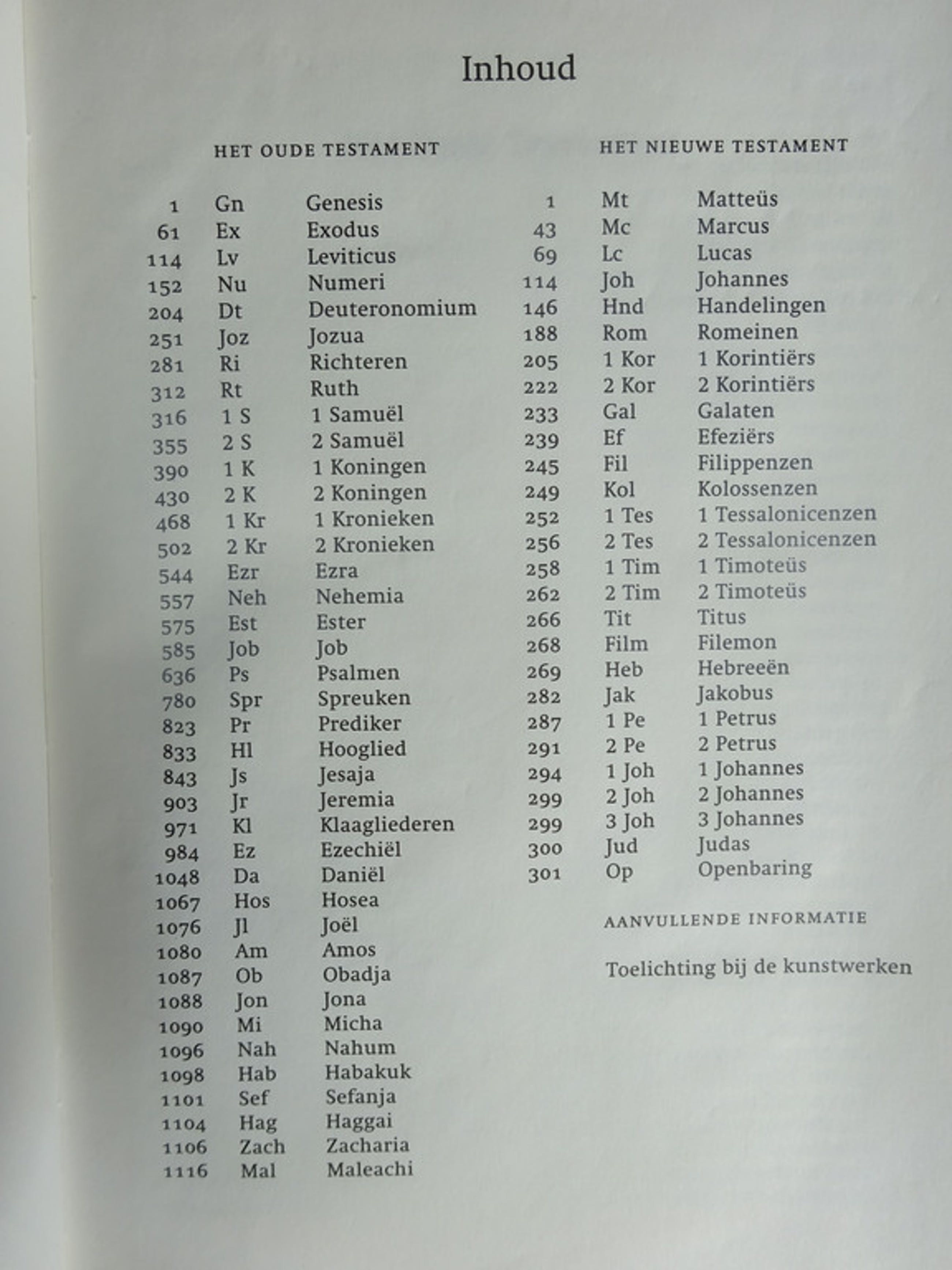 Info: In navolging van de Rembrandtbijbel is de Chagall bijbel verschenen. Het betreft een uitgave van het Nederlands en Vlaams Bijbelgenootschap in de vertaling van 1951. Behalve de boeken van het Oude en het Nieuwe Testament bevat deze bijbel als aanvullende informatie een uitgebreide toelichting bij de 72 opgenomen kunstwerken van Marc Chagall. Deze joodse kunstenaar (1887-1985) heeft de bijbel - opmerkelijk genoeg ook het Nieuwe Testament - als belangrijke inspiratiebron gebruikt voor zijn indringende bijbelplaten: 'Mijn afbeeldingen moeten de mensen helpen in gebed de weg naar God te vinden' was zijn credo. Mooie uitgave, dundruk, duidelijk leesbare bladspiegel. Wit omslag met zwarte belettering; gestoken in cassette.