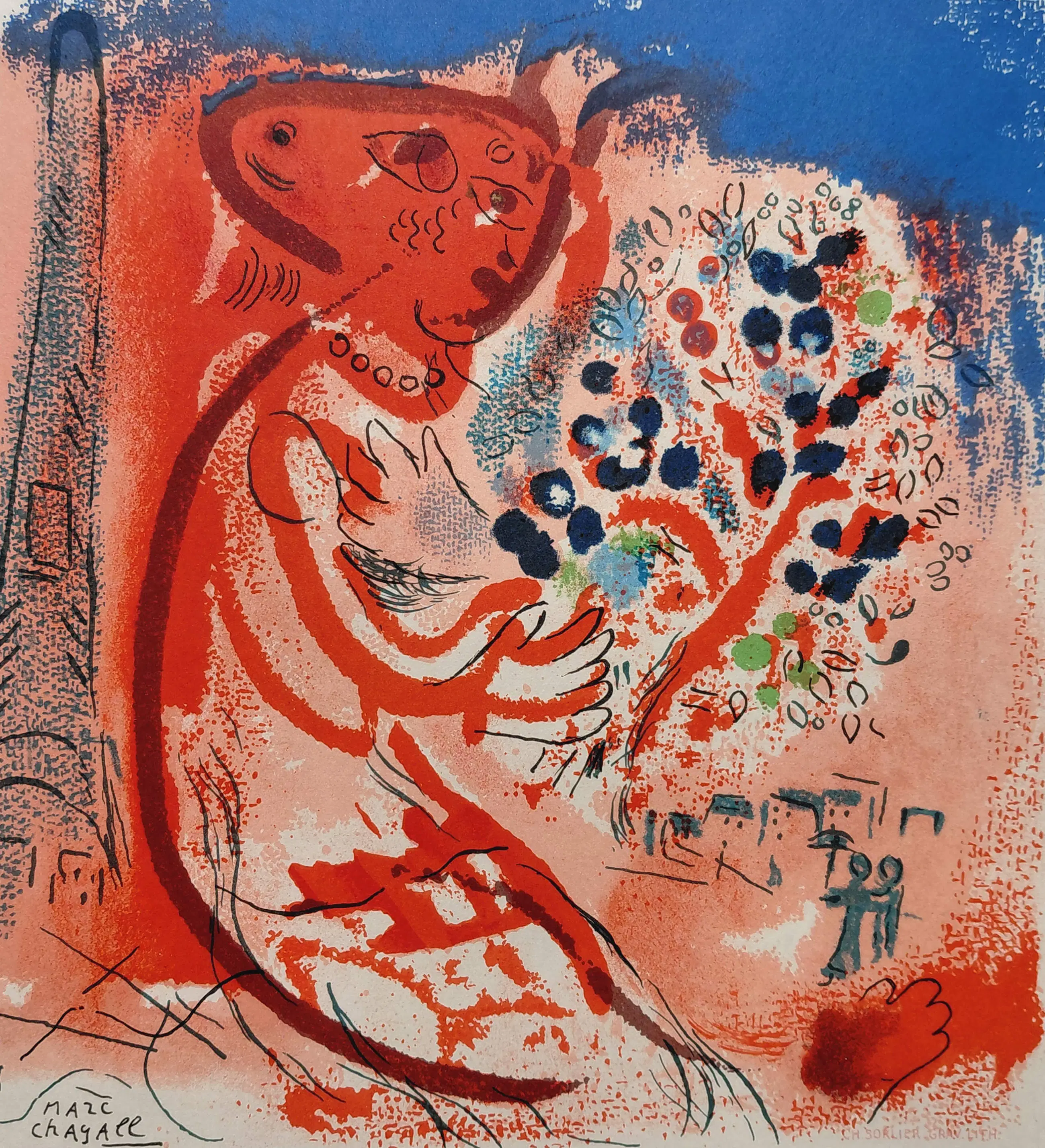 Marc Chagall - Compositie met figuur met boeket bloemen, litho (mooi ingelijst)