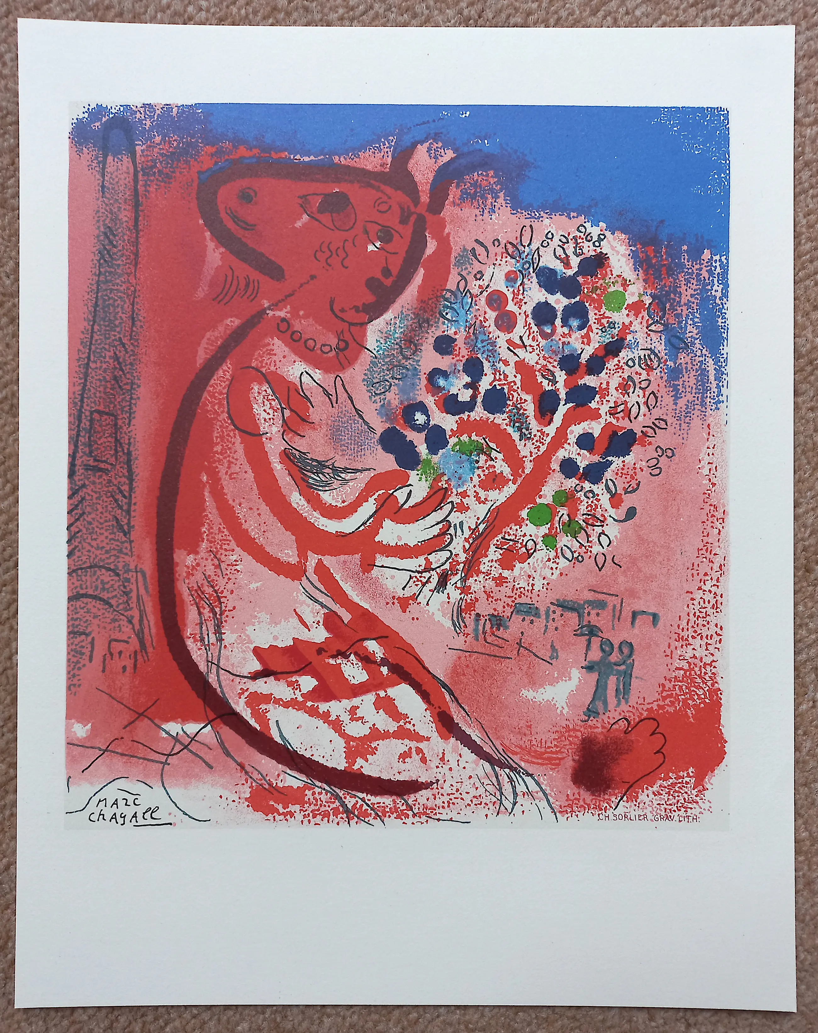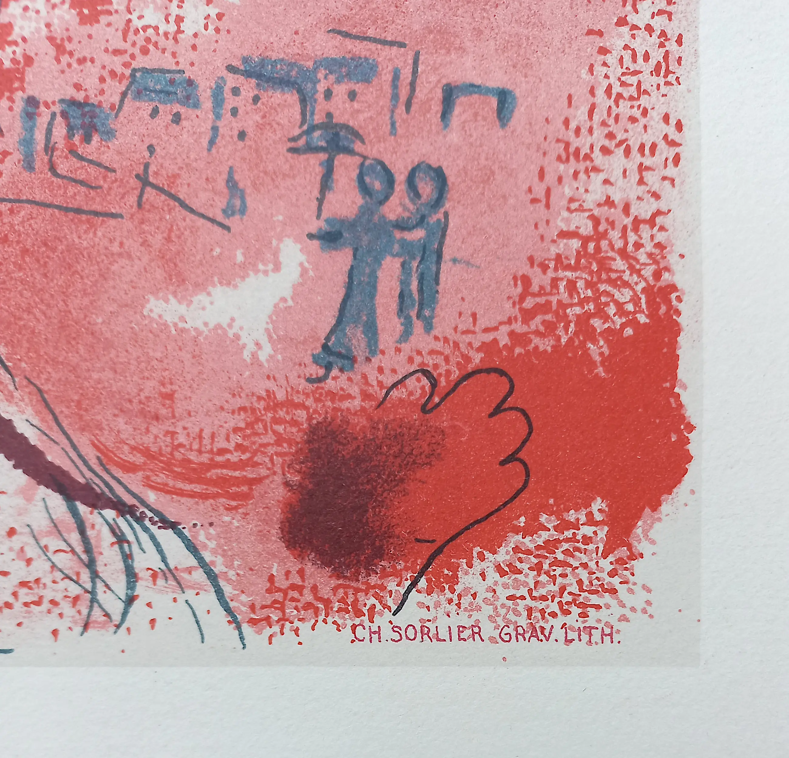 Mooie, karakteristieke litho van Marc Chagall uitgegeven bij het boek “Lettre a mon peintre Raoul Dufy” uit 1965. Litho op geschept papier, in de steen gesigneerd linksonder. In zeer goede conditie.