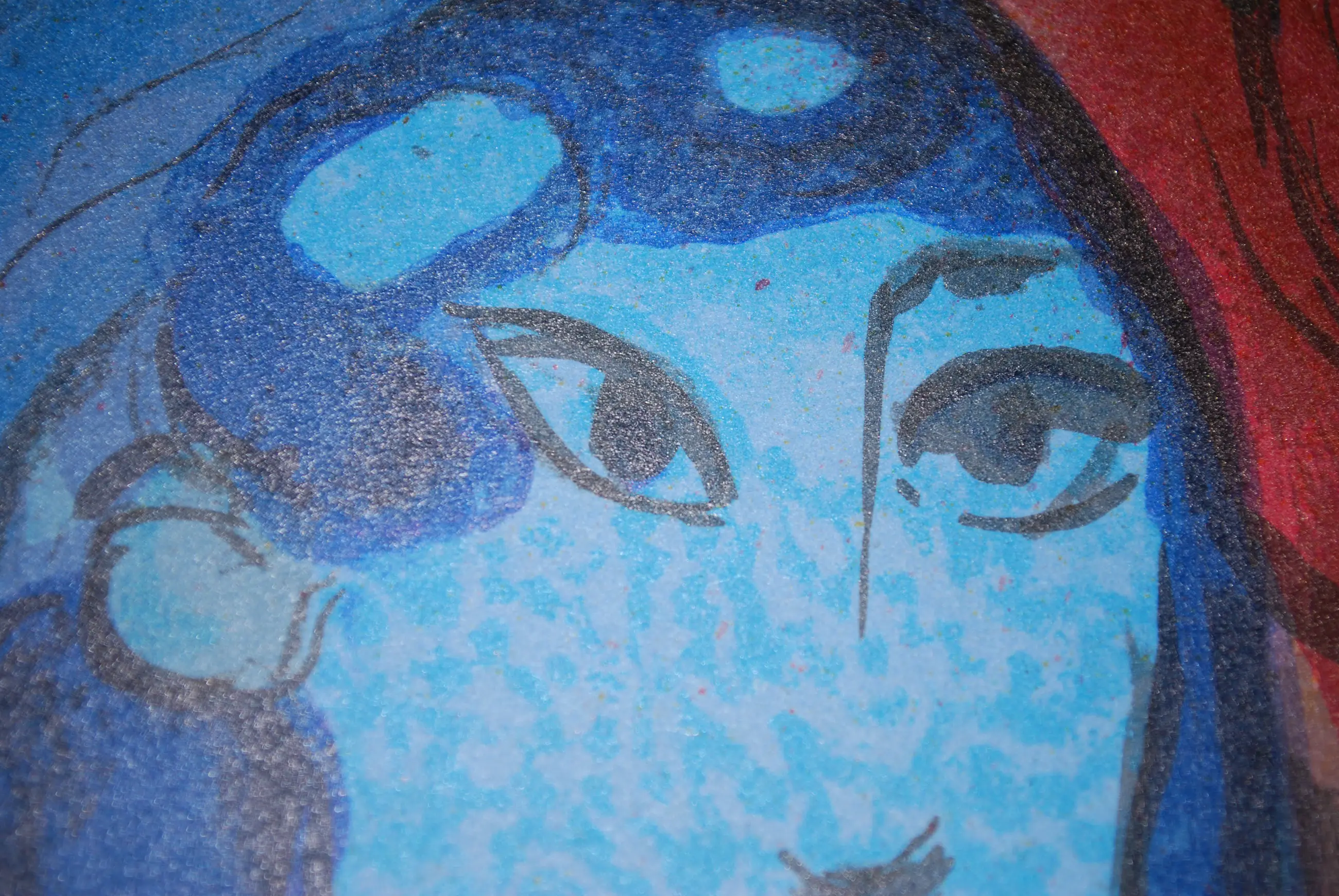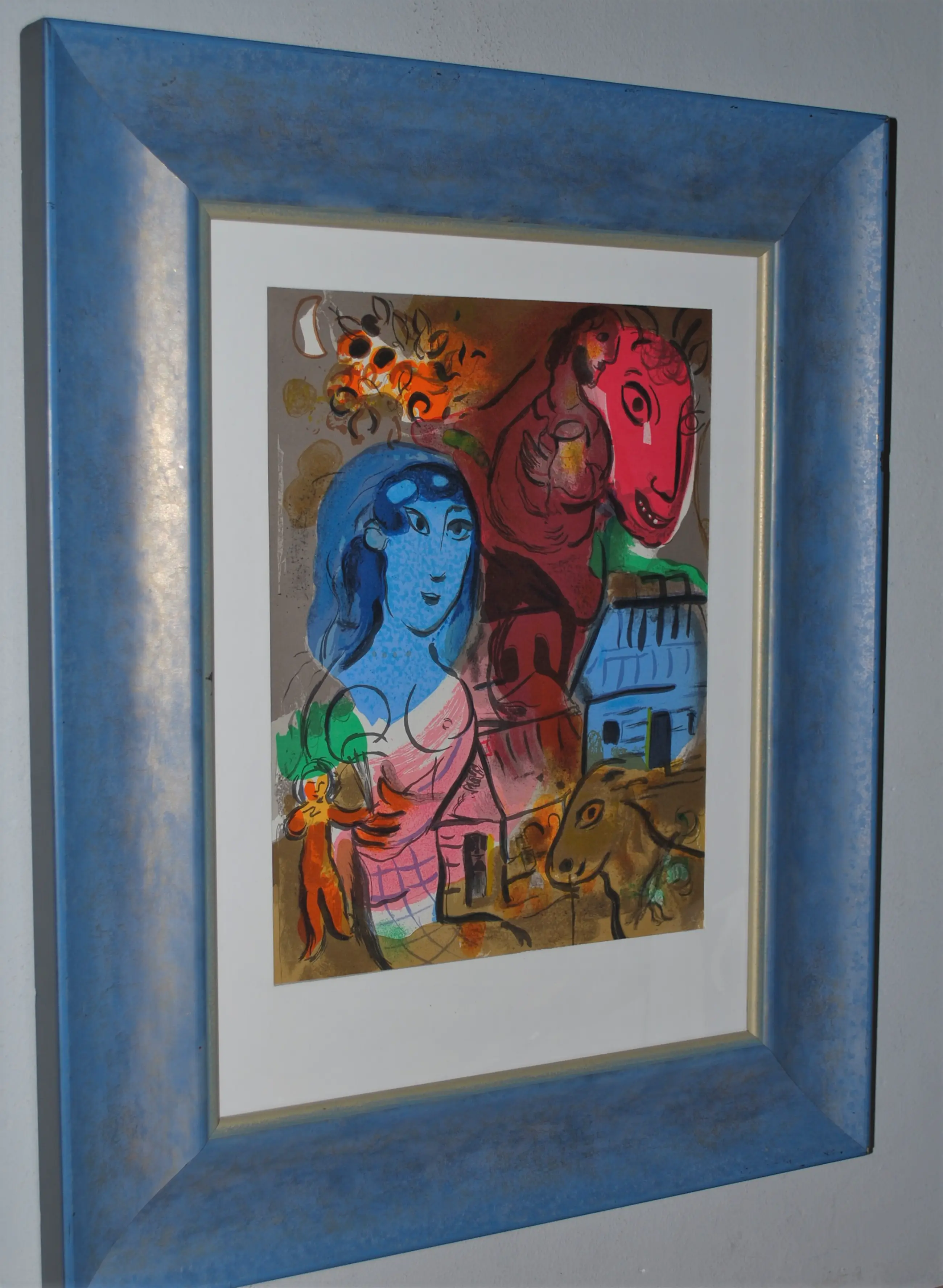 In een prachtige blauwe lijstenmakerslijst van hout (kleine chipjes).