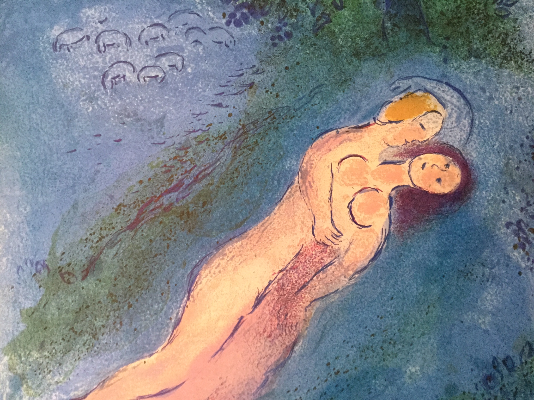 Artiest: Marc Chagall Medium: lithografische poster, 1987 Afmetingen: 30,25 x 20,75 inch, 76,8 x 52,7 cm Klassiek posterpapier - perfecte staat A+ Deze tentoonstellingsposter uit 1987, gemaakt voor een tentoonstelling van werken van Marc Chagall die door Japan reisde (Tokyo, Yamagata, Nagoya en Gunma), werd in Parijs gedrukt door het Atelier Mourlot dat de meeste lithografieën van Chagall drukte. Deze afbeelding is gekozen omdat Marc Chagall een van de grootste liefdesverhalen aller tijden had geïllustreerd: de Griekse legende van Daphnis en Chloé. De poëtische en emotionele visie van de kunstenaar vat de empathie en romantiek van dit verhaal echt vast zoals geen enkele andere kunstenaar dat zou kunnen hebben. Het eerste project duurde bijna zes jaar en omvatte 42 originele lithografieën. Chagall was gecharmeerd van het verhaal en maakte verschillende reizen naar Griekenland, vergezeld van zijn vrouw, om te werken aan voorbereidende schetsen op Lesbos, het geboorte-eiland van de uitgeverij Tériade. Deze poster werd vlak na de dood van Chagall gereproduceerd door meesterdrukker Charles Sorlier, die zijn naaste medewerker was bij Mourlot, maar die ook zijn meest vertrouwde vriend was geworden. | |||||||||||