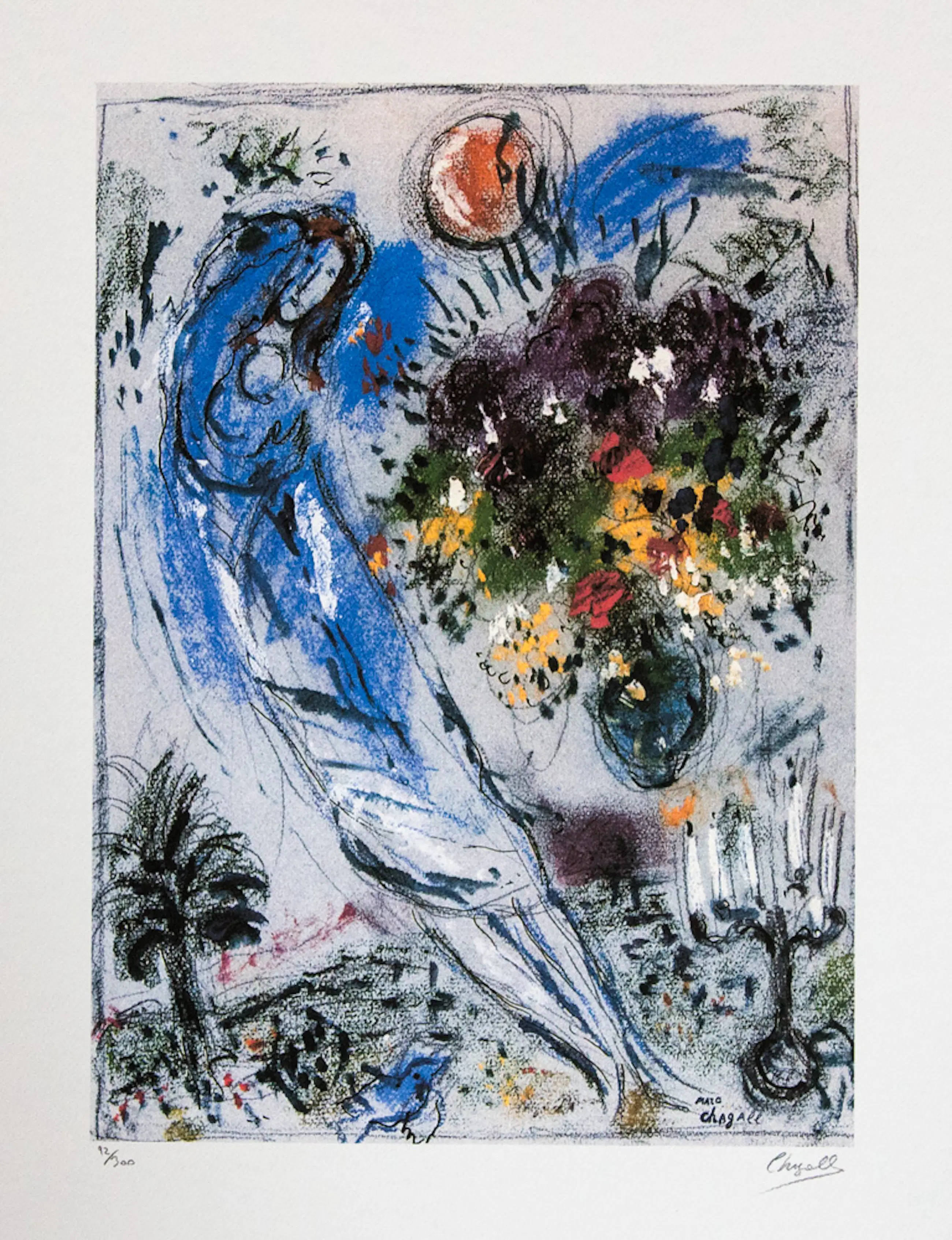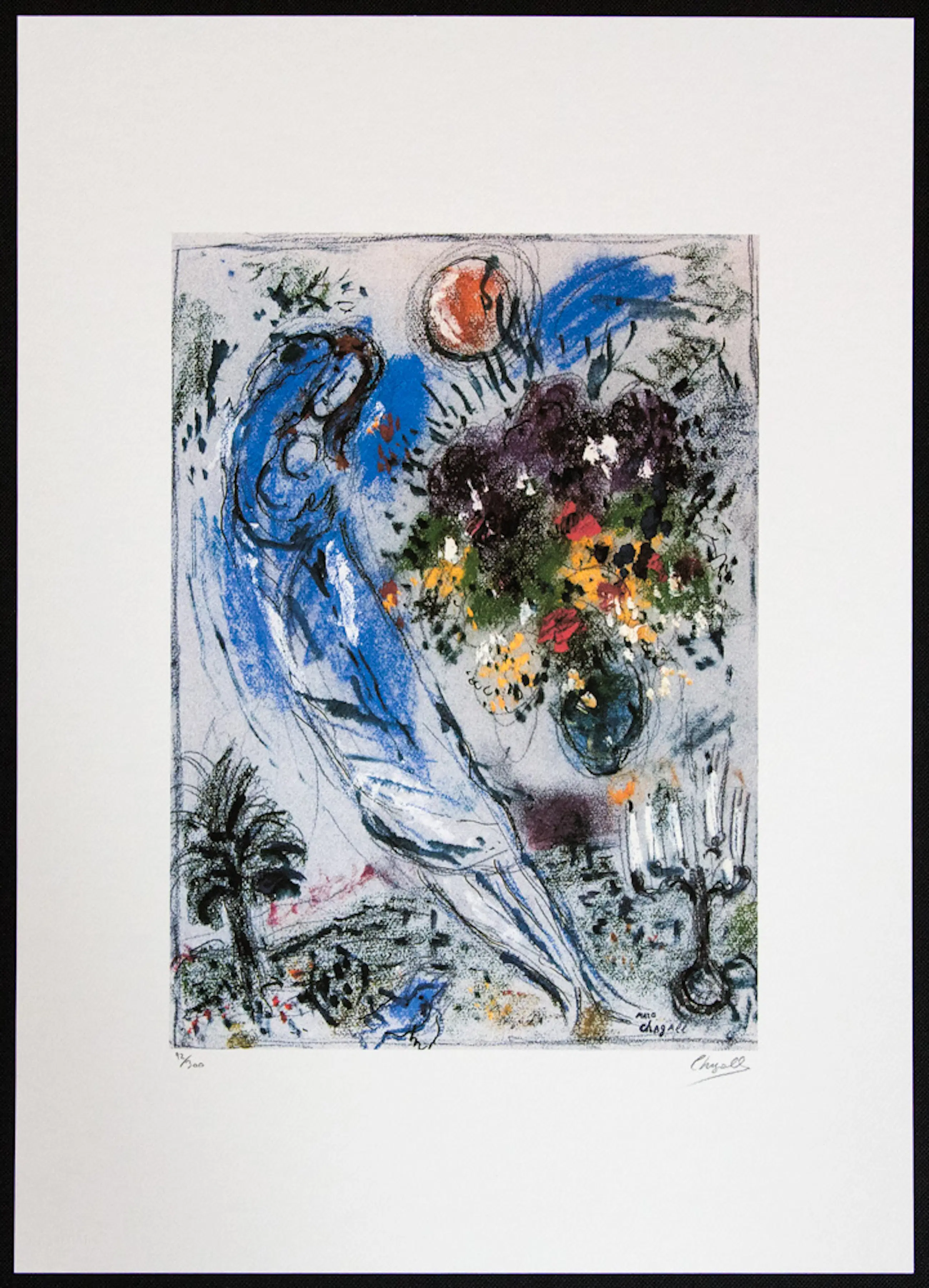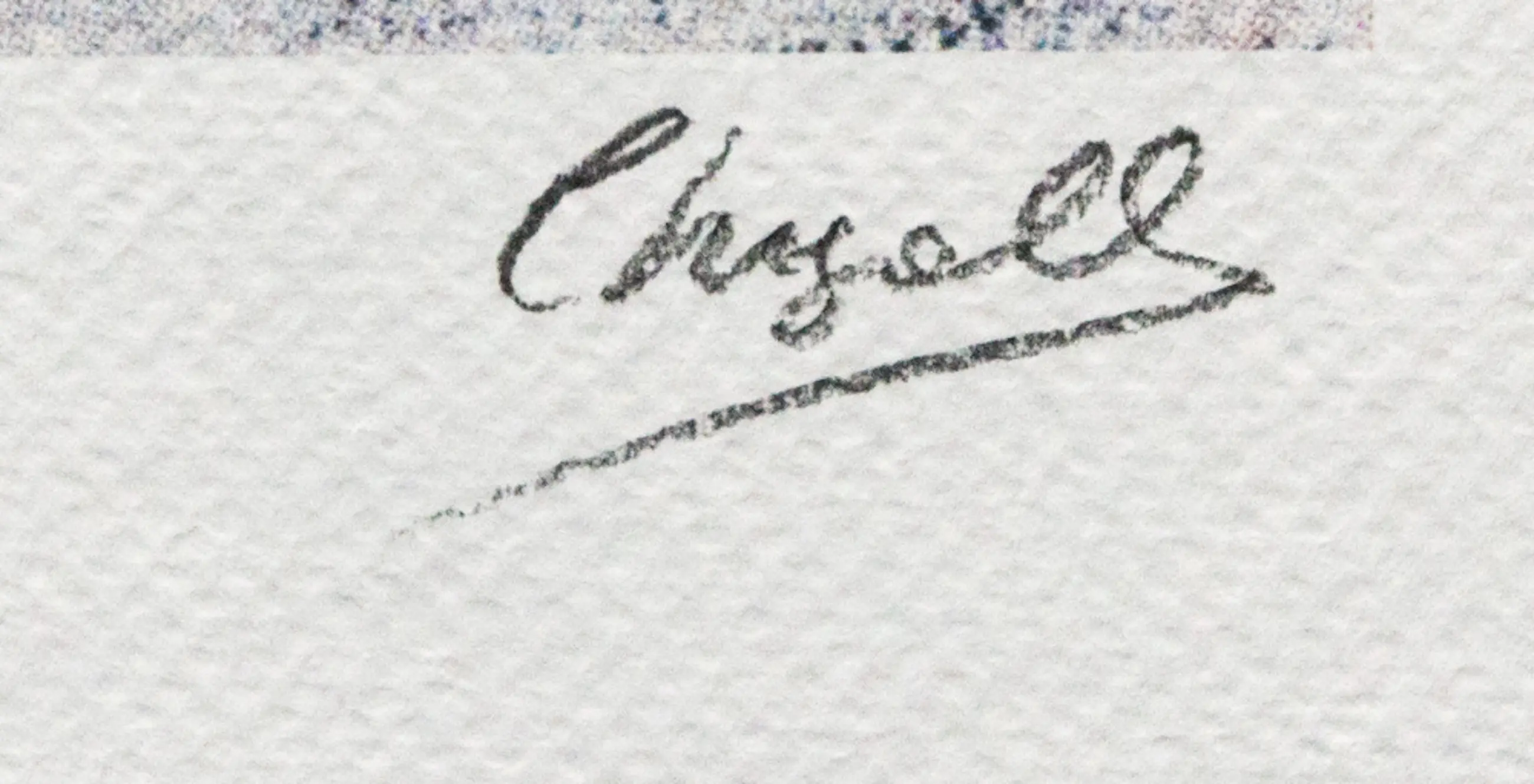 Marc Chagall (naar) 'Liefde bij de maan' offsetlithografie, rechtsonder gesigneerd, linksonder met potlood genummerd, beperkte oplage 92/300, linksonder reliëfstempel 'SPADEM Paris', zwaar katoenpapier, bladformaat 50 x 70 cm, zonder aanvullende documentatie, oningelijst verkocht.