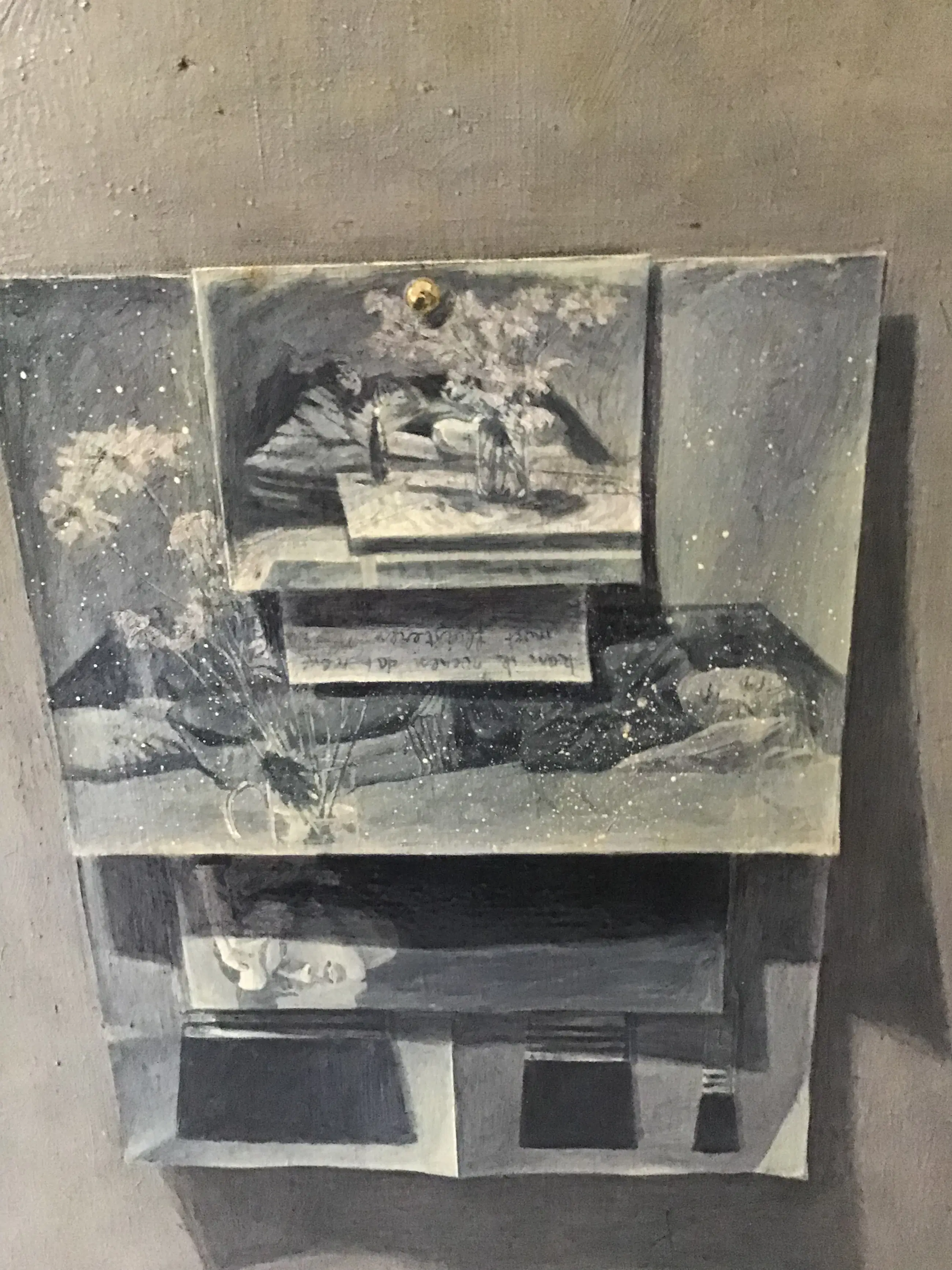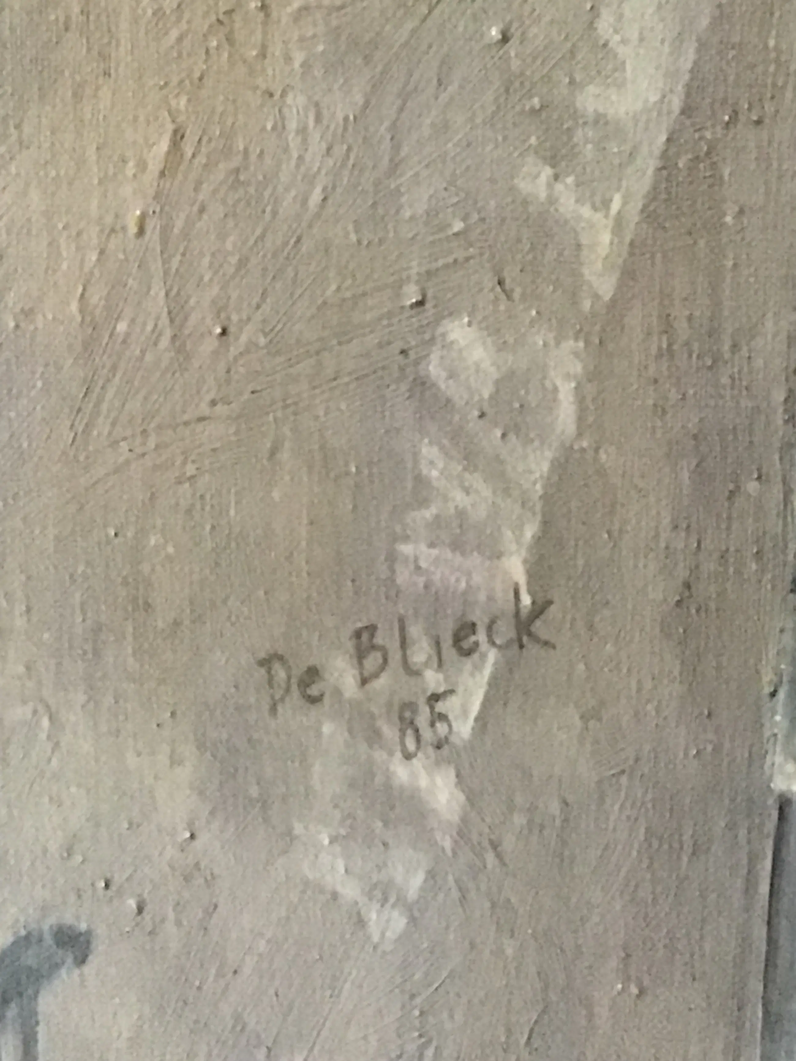 Momenteel is Marc De Blieck bekend als fotograaf. Er loopt een tentoonstelling van hem in het Smak te Gent. Deze is nog te bezoeken tot 8 maart 2026. Hij startte echter als schilder. Mijn vader kocht toen drie werken van hem. Wegens plaatsgebrek en mits een goed bod wens ik dit werk te verkopen. Het werk is speciaal, in die zin dat het van dichtbij veel meer details prijsgeeft. Op het eerste zicht zie je iets maar als je beter kijkt, ontdek je nog vanalles.