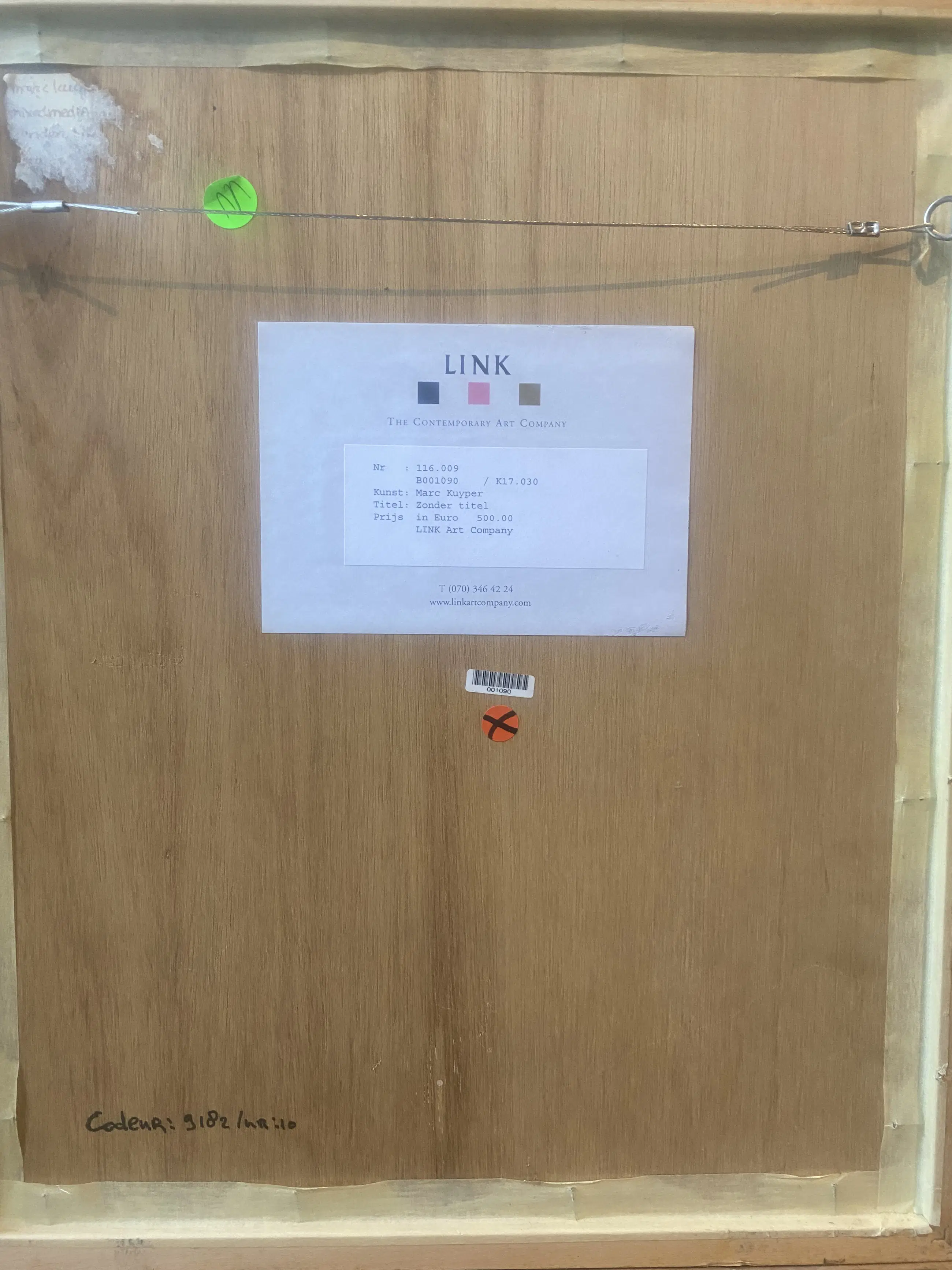 Aan de achterzijde bevindt zich een origineel galerielabel van Link – The Contemporary Art Company, met een vermelde galerieprijs van €500, wat de herkomst en presentatiegeschiedenis onderstreept.