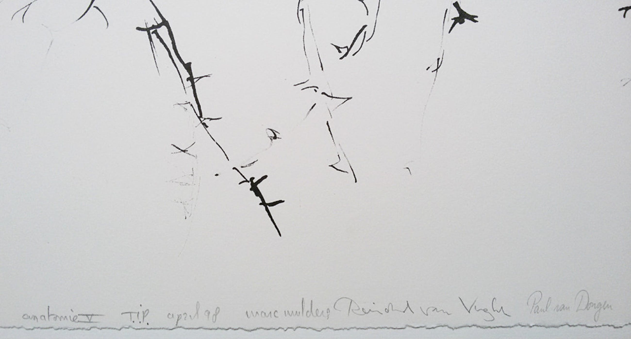 Bekend werk uit de serie “Anatomie” van Themes in Painting (T.I.P.), een samenwerkingsverband van bovengenoemde drie kunstenaars. Litho op geschept papier, netjes gemonteerd op stijf, dik papier/karton. Met potlood gesigneerd (3x), gedateerd (april 98) en genummerd (8/25). Afkomstig uit de kunstcollectie van ABNAMRO, in uitstekende conditie.