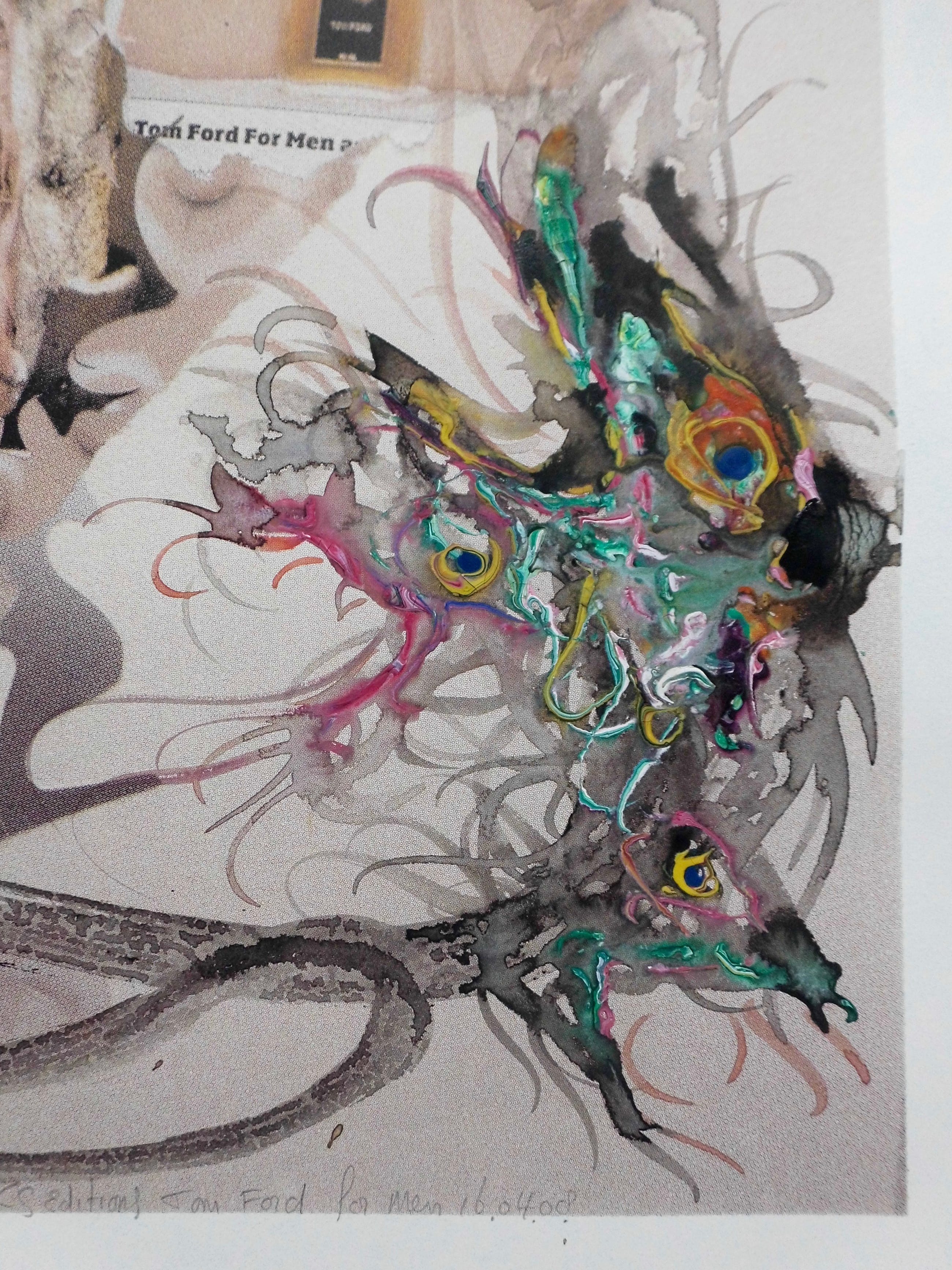Op deze zeefdruk, uitgevoerd in full colour, reageert de bekende kunstenaar Marc Mulders kritisch op de cosmetische industrie. Deze kritiek versterkt hij met demonische figuren als draak en slang, symbool voor het kwaad. Deze figuren zijn door Mulders handmatig veelkleurig met aquarel toegevoegd aan het bestaande beeld. We zien dus een zeefdruk, voor Mulders gedrukt bij C.S. Editions in Eindhoven, met daar overheen een veelkleurige, handmatig aangebrachte aquarel! Het betreft dus een UNIEK EXEMPLAAR!