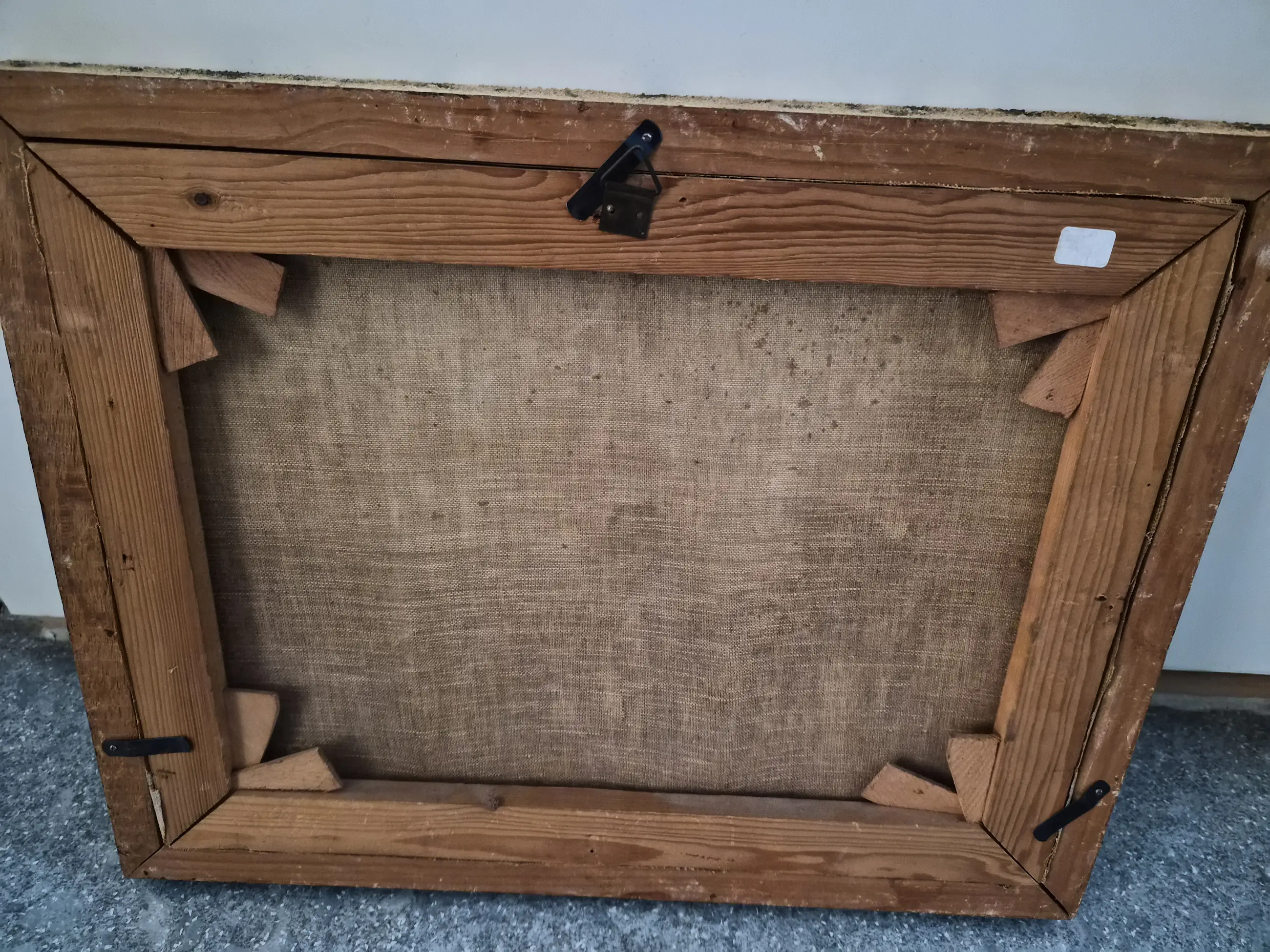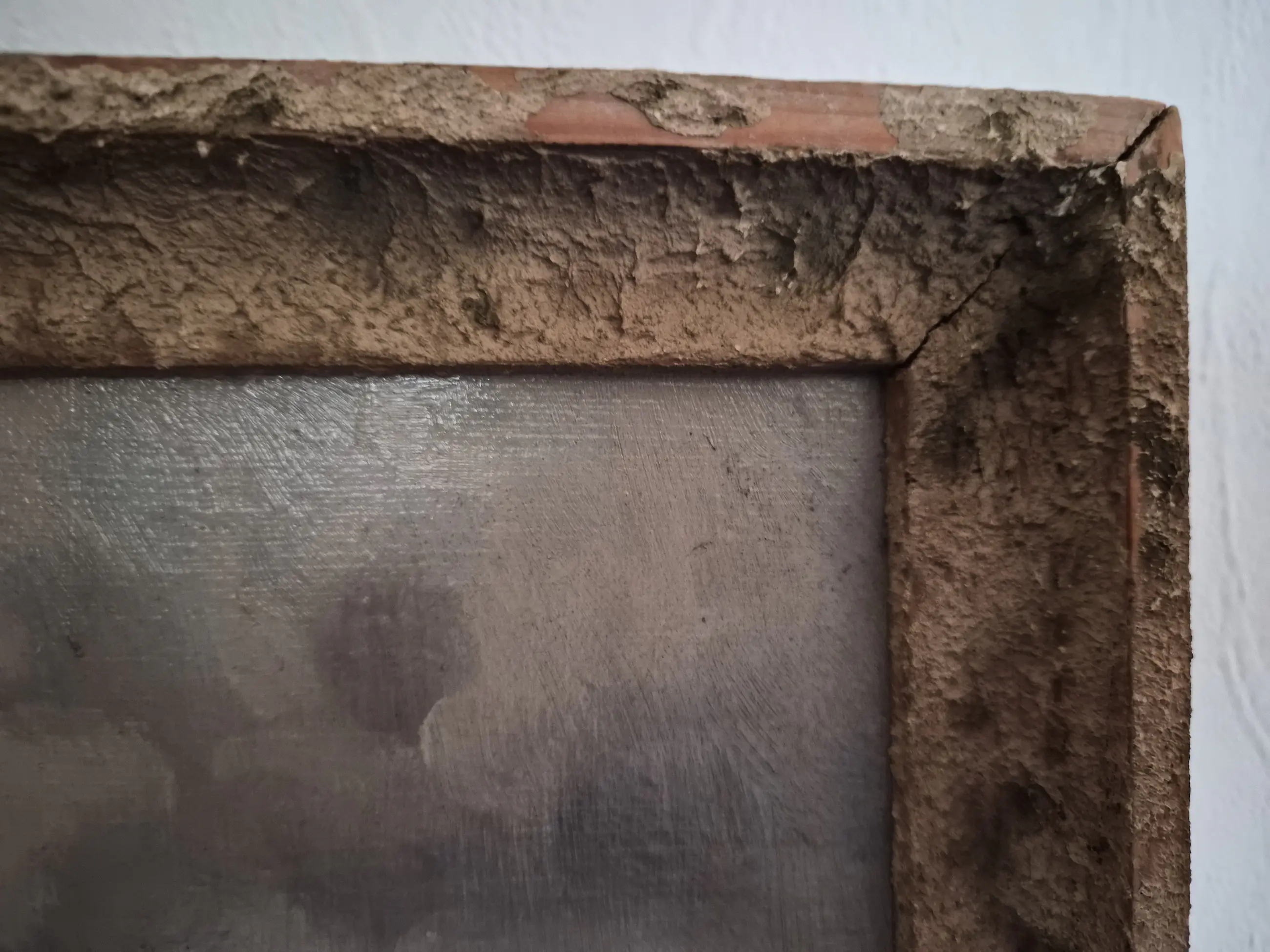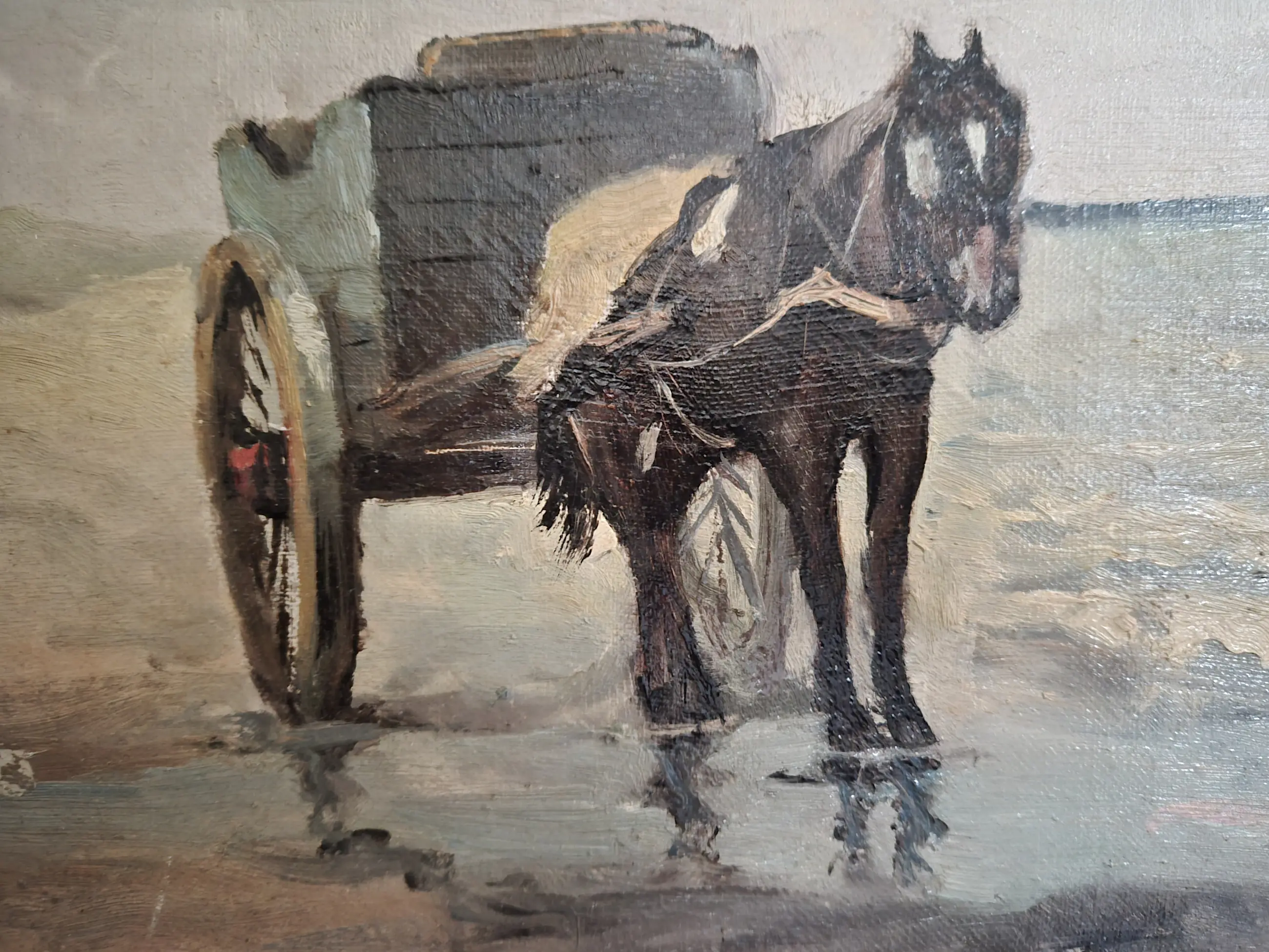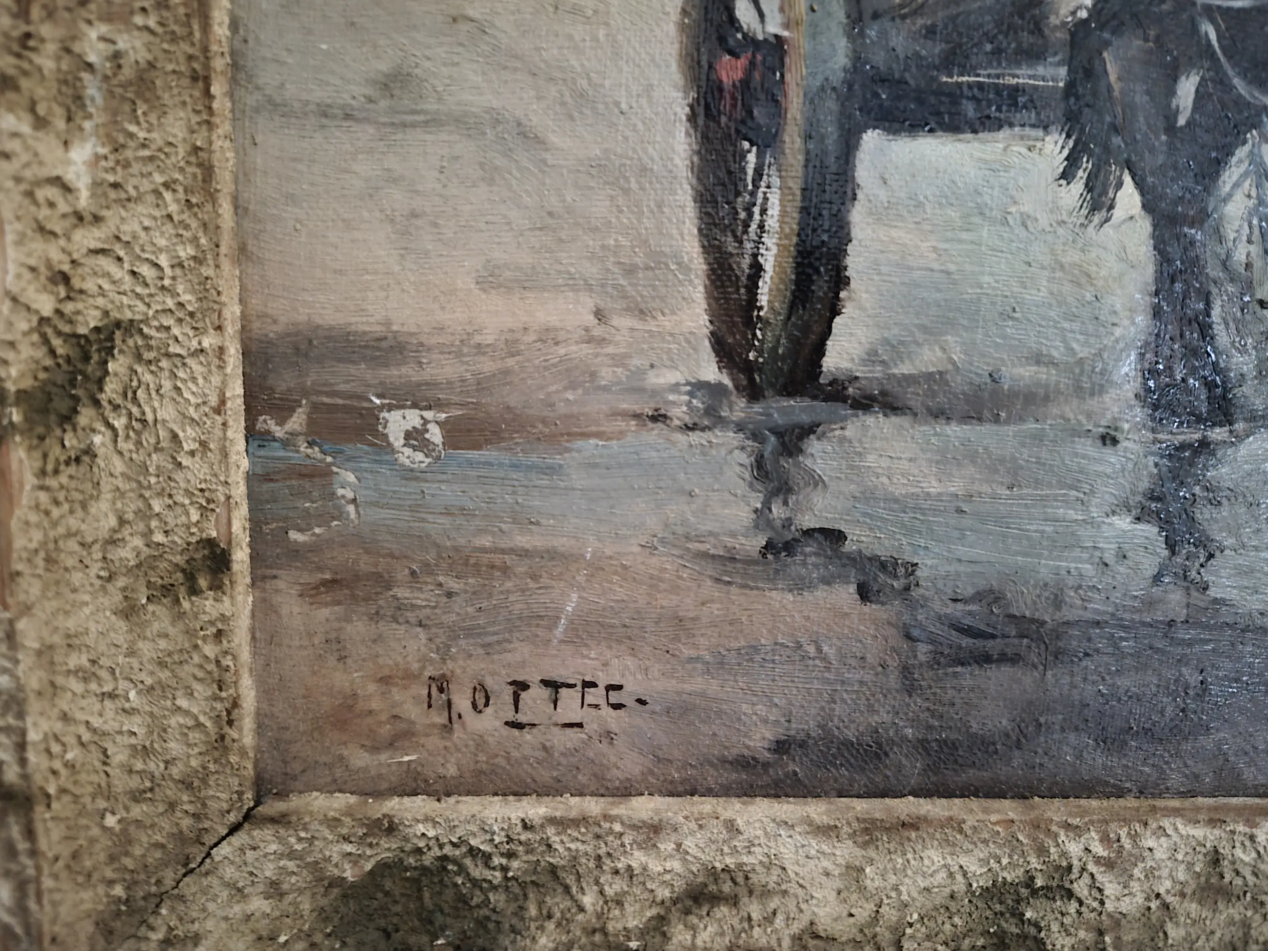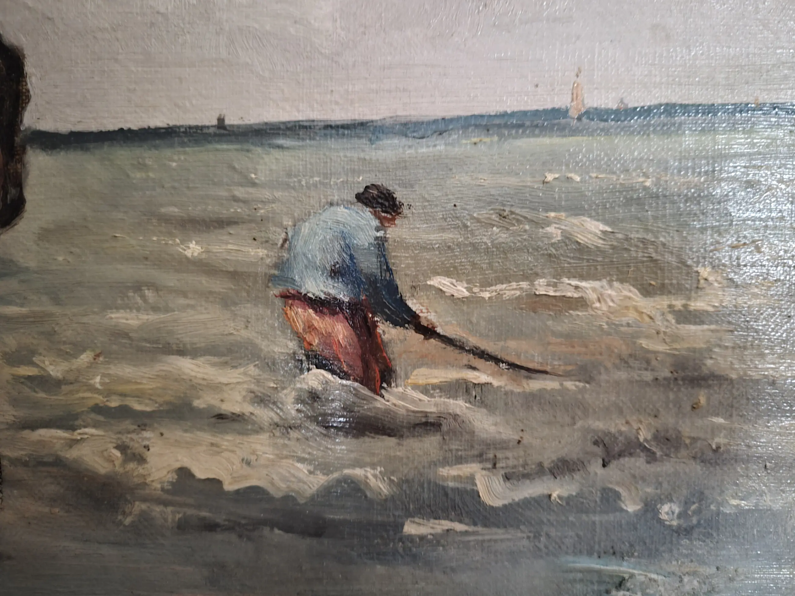 Aantrekkelijk schilderij van Marc Ottee van een visser die in de branding staat te vissen, misschien op kokkels. Het heeft wat ouderdomssporen en kan wat schoonmaak gebruiken. De lijst is erg apart: het is ruw materiaal lijkt wel wat op zandgrond. Hier en daar zijn er stukjes af.