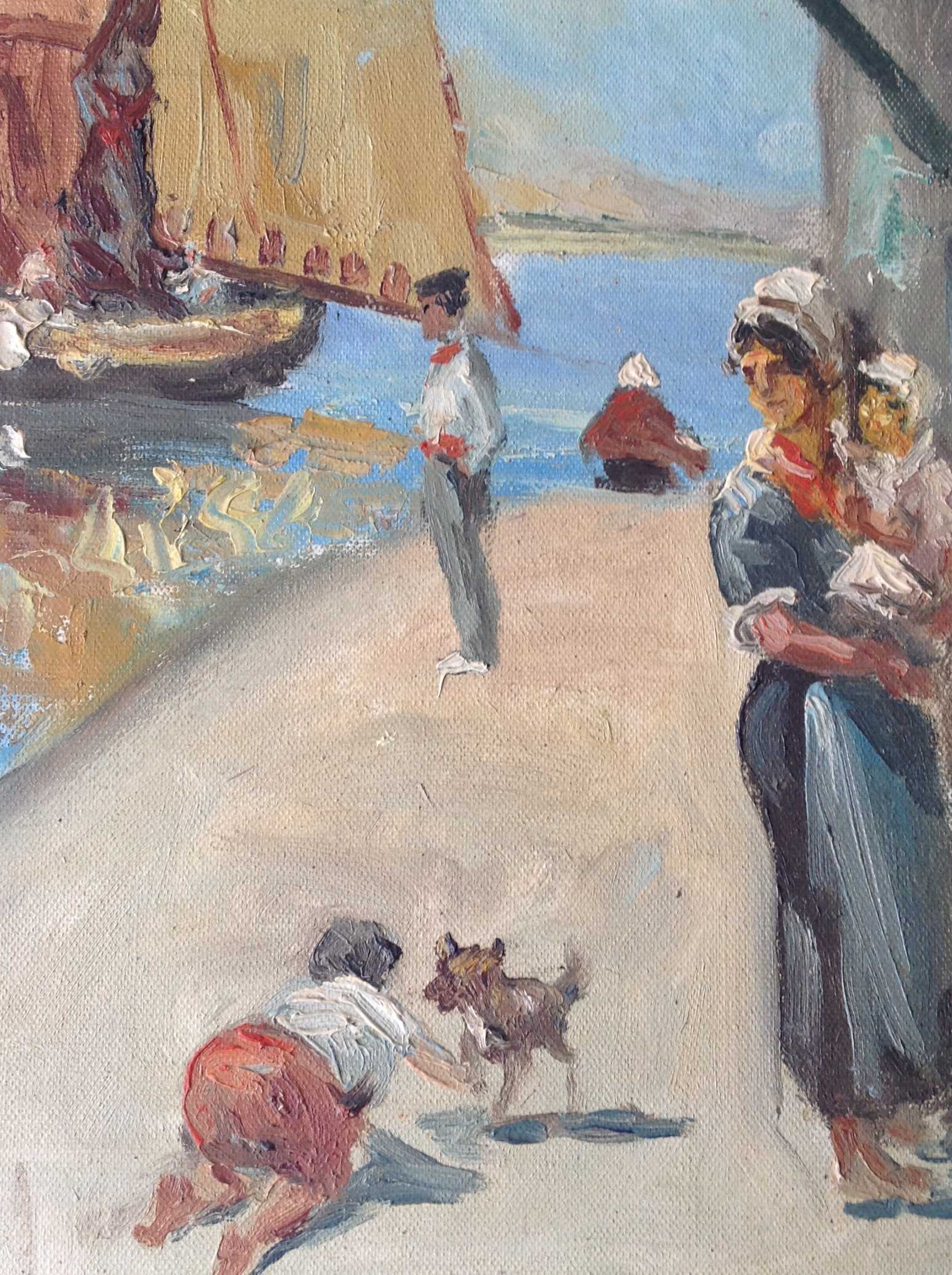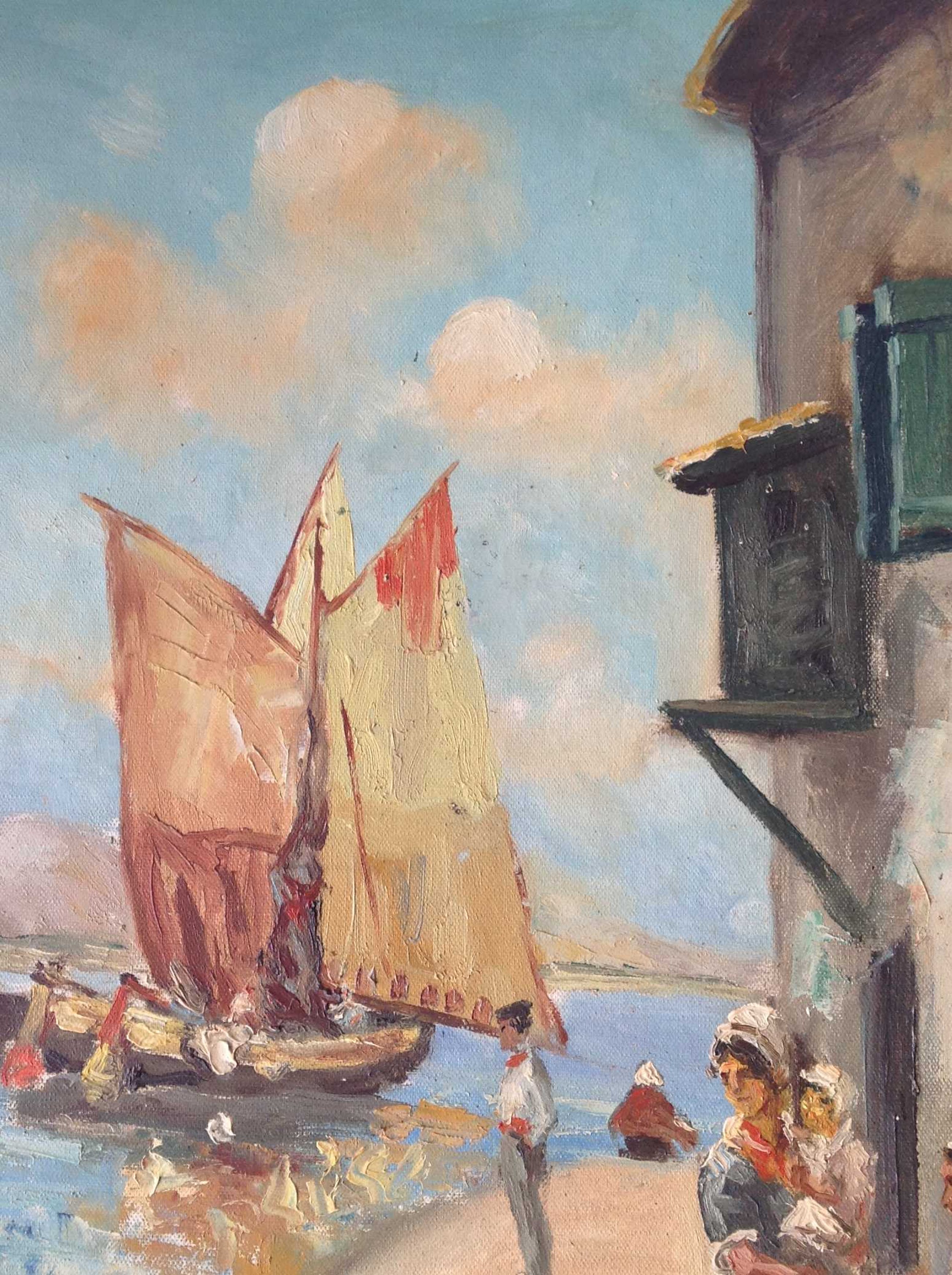 Prachtig, zonnig, kleurrijk schilderij van een visserdorp geschilderd door Marc Ottee, pseudoniem van Arnout van Gilst. De mediterrane sfeer is zeer goed weergegeven door de kunstenaar. Olieverf op doek. Schilderij is zonder lijst. Het schilderij is in een goede conditie.