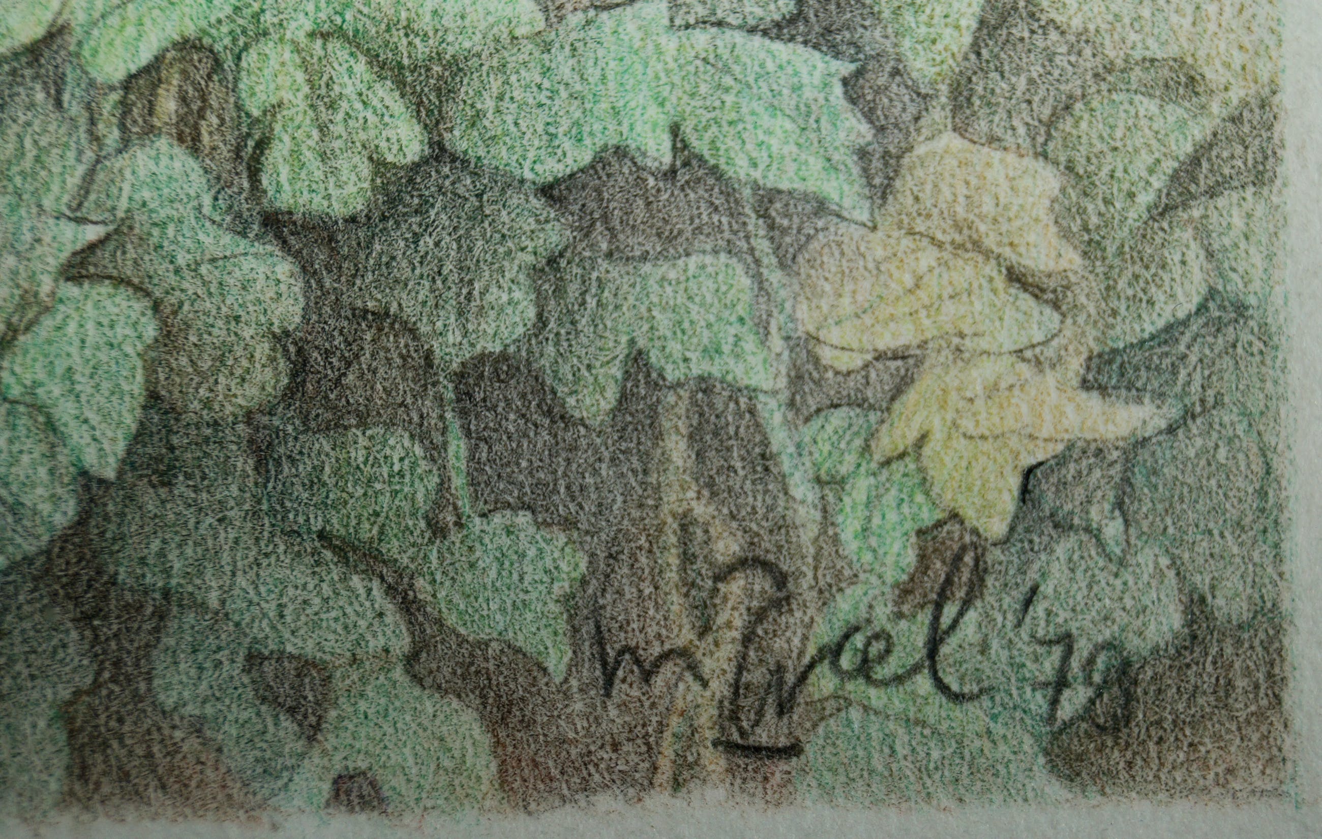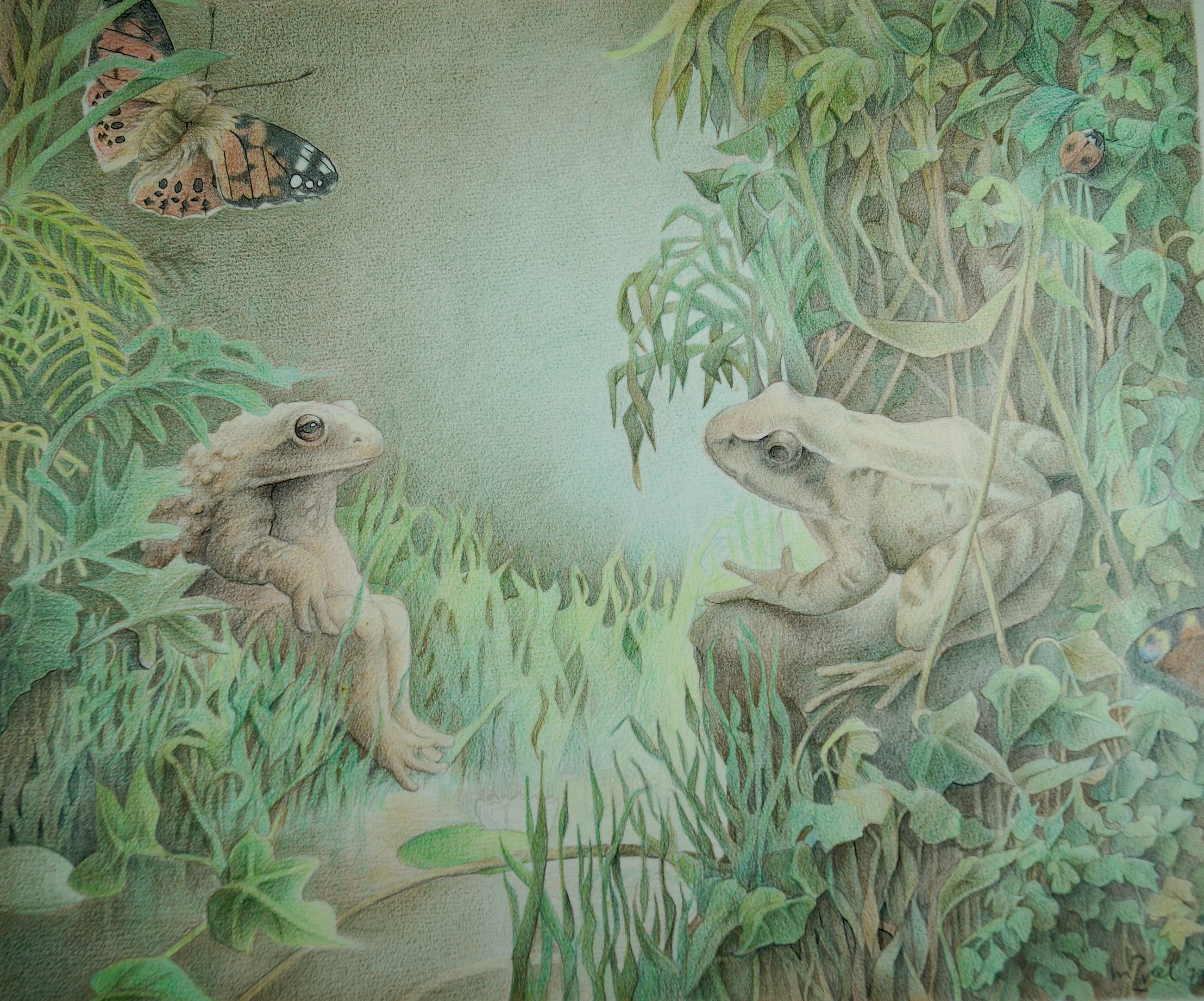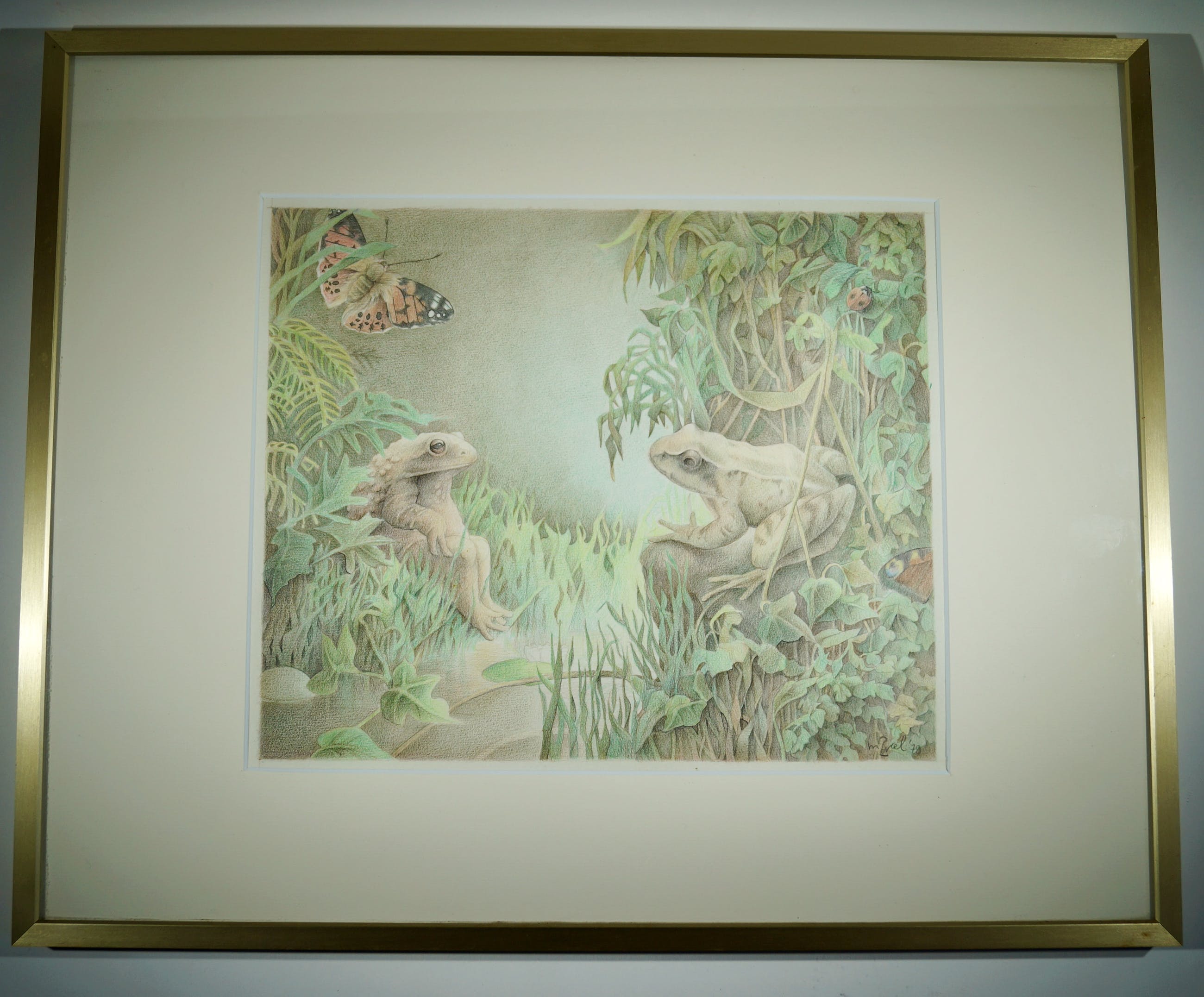 Mooie kleurpotlood tekening voorstellend twee verliefde kikkers in een weelderige groene omgeving. Ingelijst achter in een stevige aluminium lijst, klaar om op te hangen. Van de kunstenaar zelf gekocht tijdens een expositie in 1979.