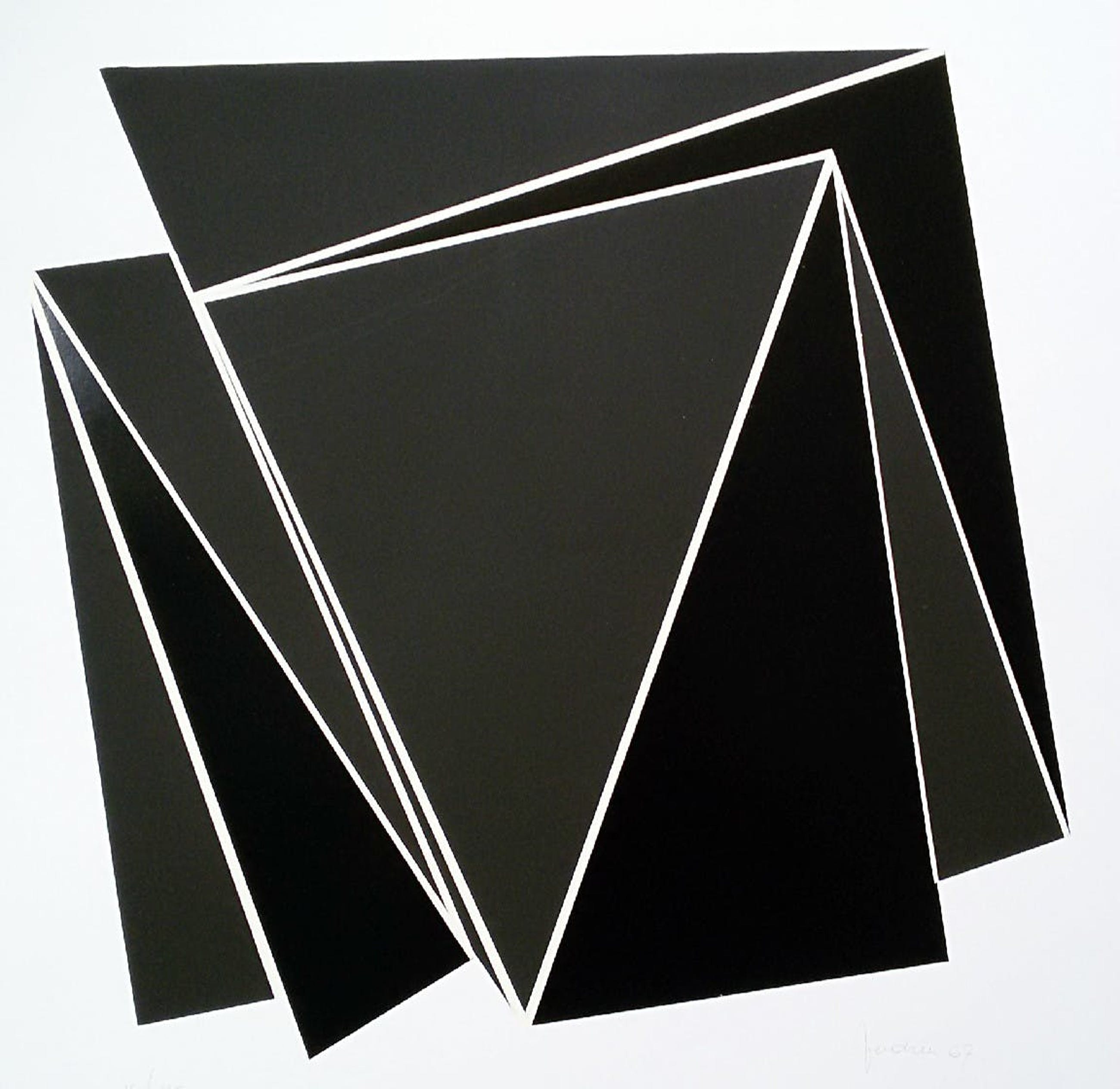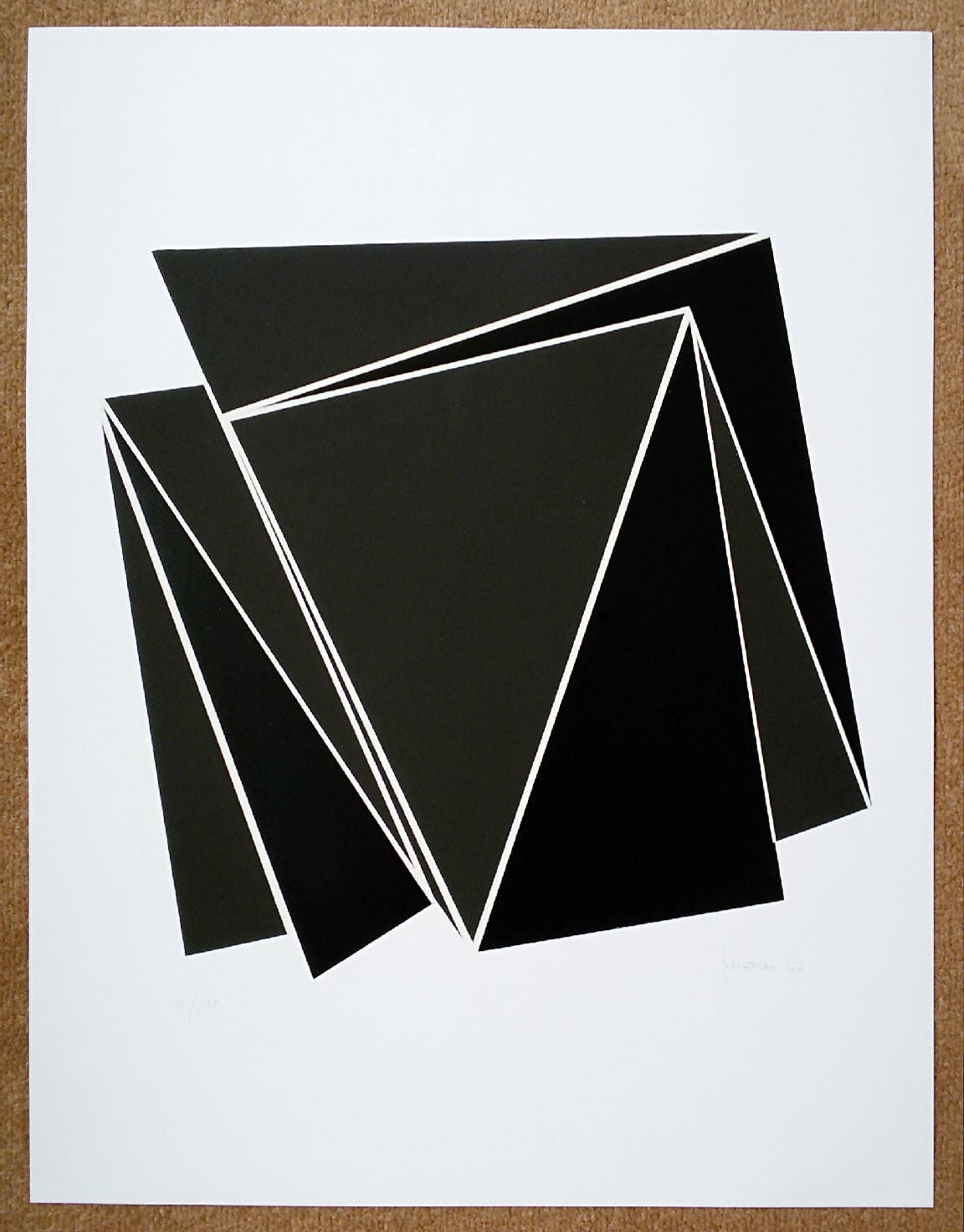 Beeldschoon werk van de Belgische kunstenaar Marcel Verdren (1933-1976). Zeefdruk op glad papier, zowel glimmend als mat gedrukt, zie foto 3.  De lijnen tussen de zwarte vlakken zijn licht beige gedrukt, moeilijk te zien op foto's 1 t/m 3 maar wel op foto 4. Met potlood gesigneerd, gedateerd ('67) en genummerd (10/125). In uitstekende conditie.