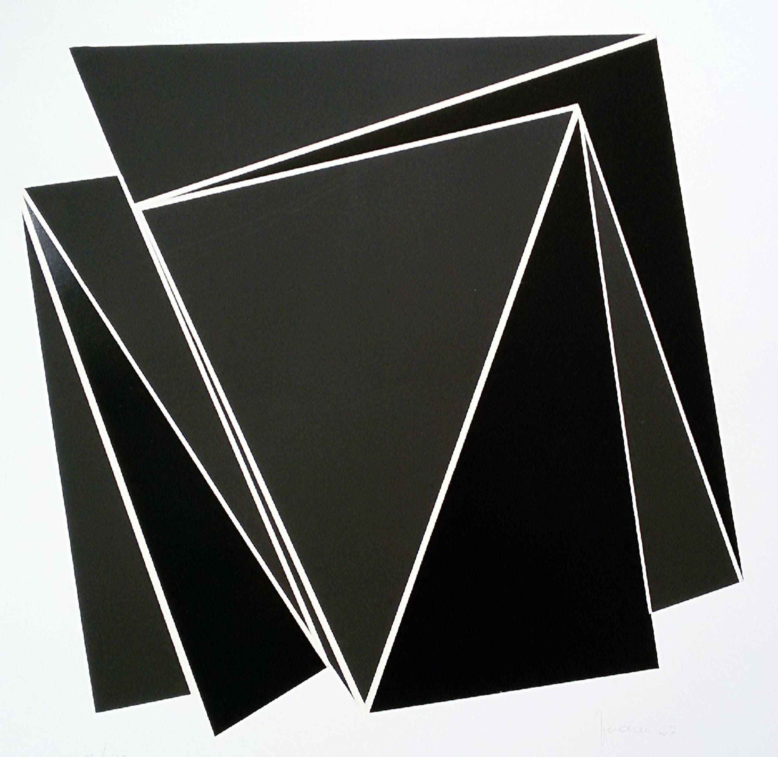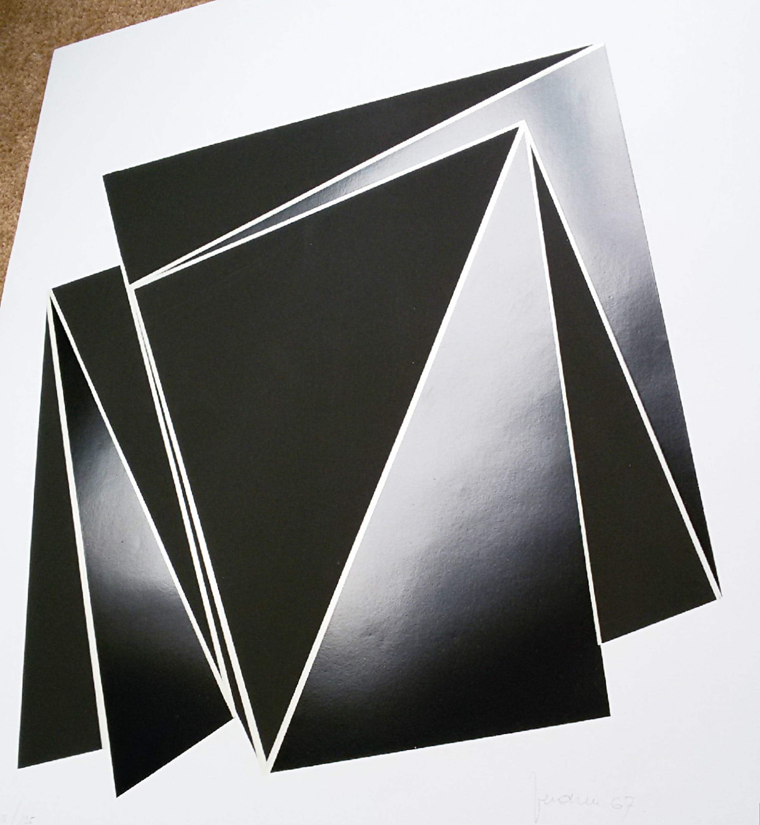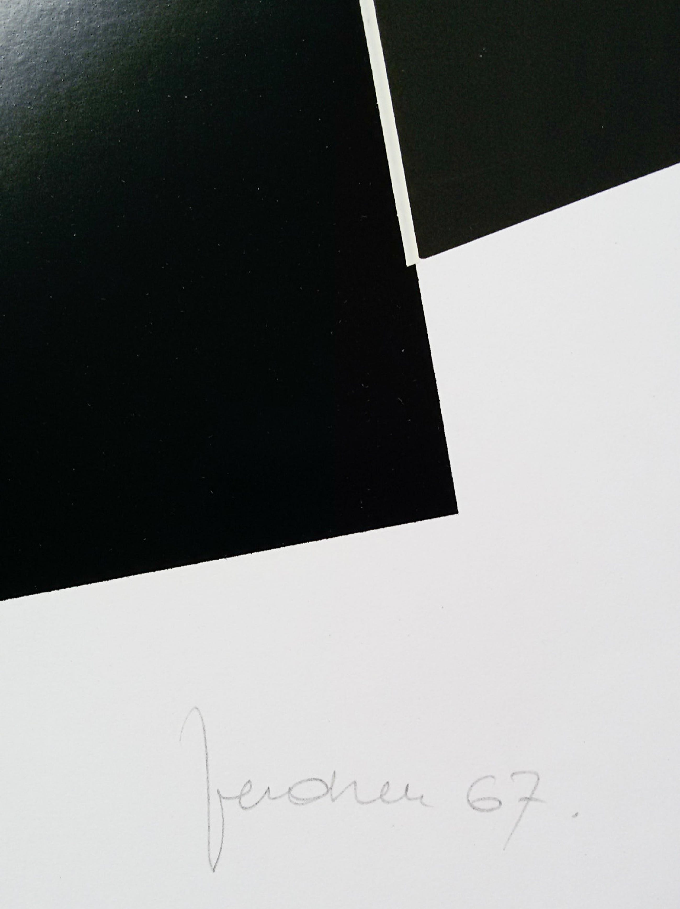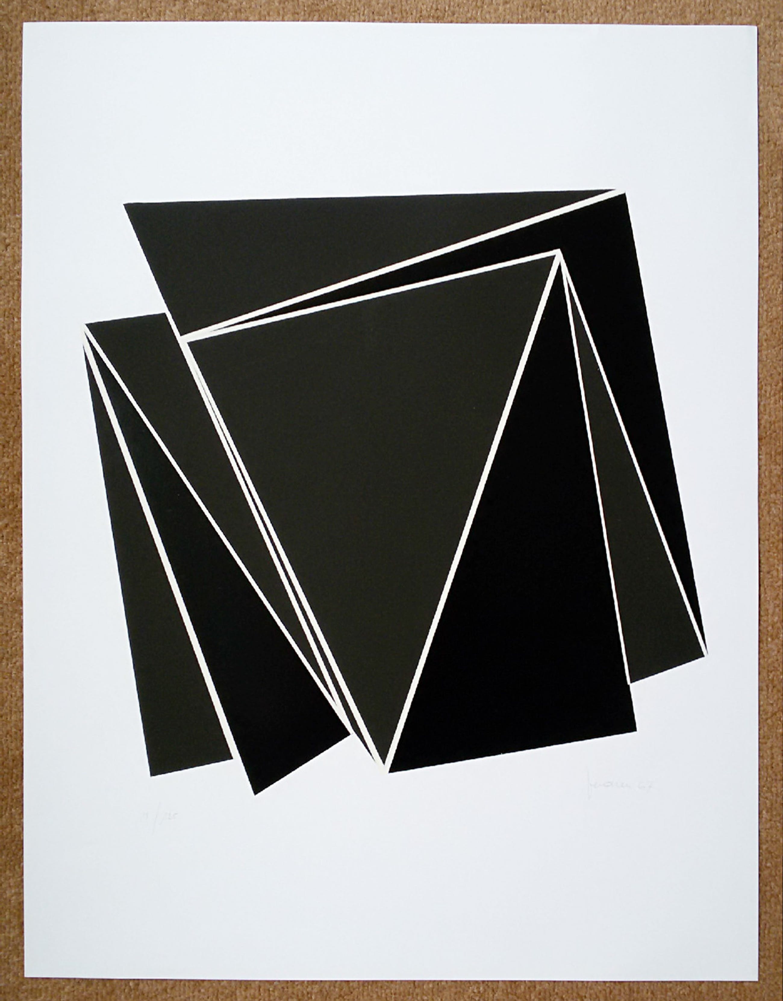 Beeldschoon werk van de Belgische kunstenaar Marcel Verdren (1933-1976). Zeefdruk op glad papier, zowel glimmend als mat gedrukt, zie foto 3. De lijnen tussen de zwarte vlakken zijn licht beige gedrukt, moeilijk te zien op foto’s 1 t/m 3 maar wel op foto 4. Met potlood gesigneerd, gedateerd (‘67) en genummerd (14/125). In zeer goede conditie.
