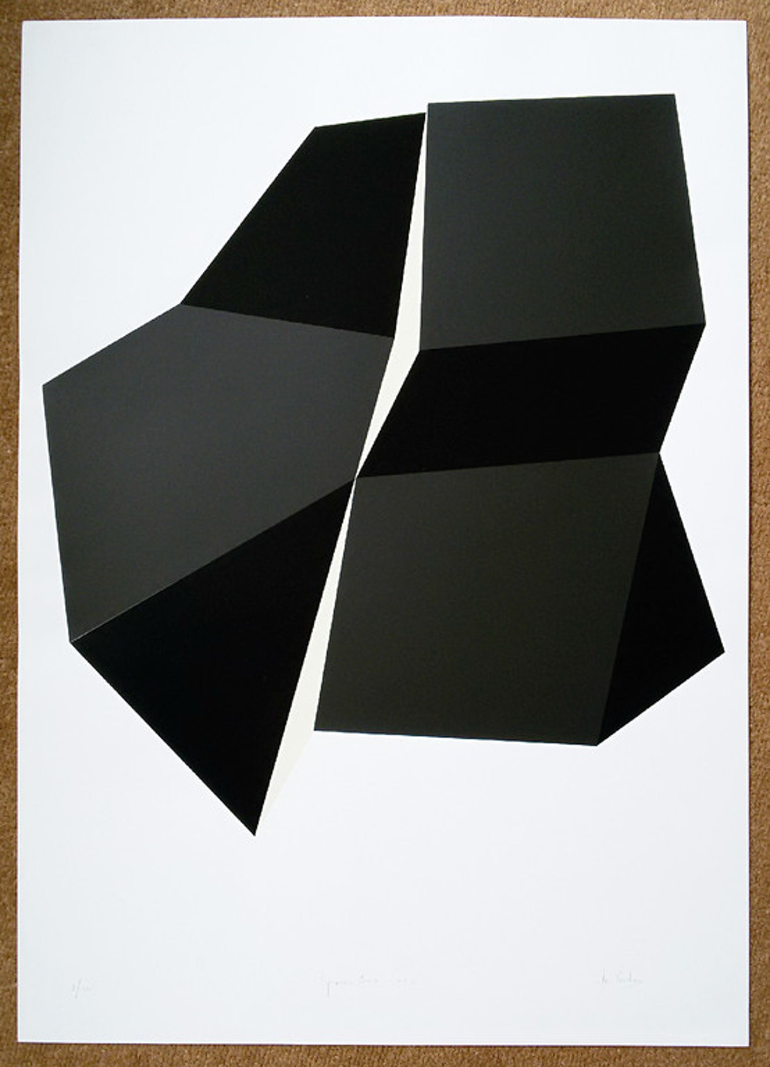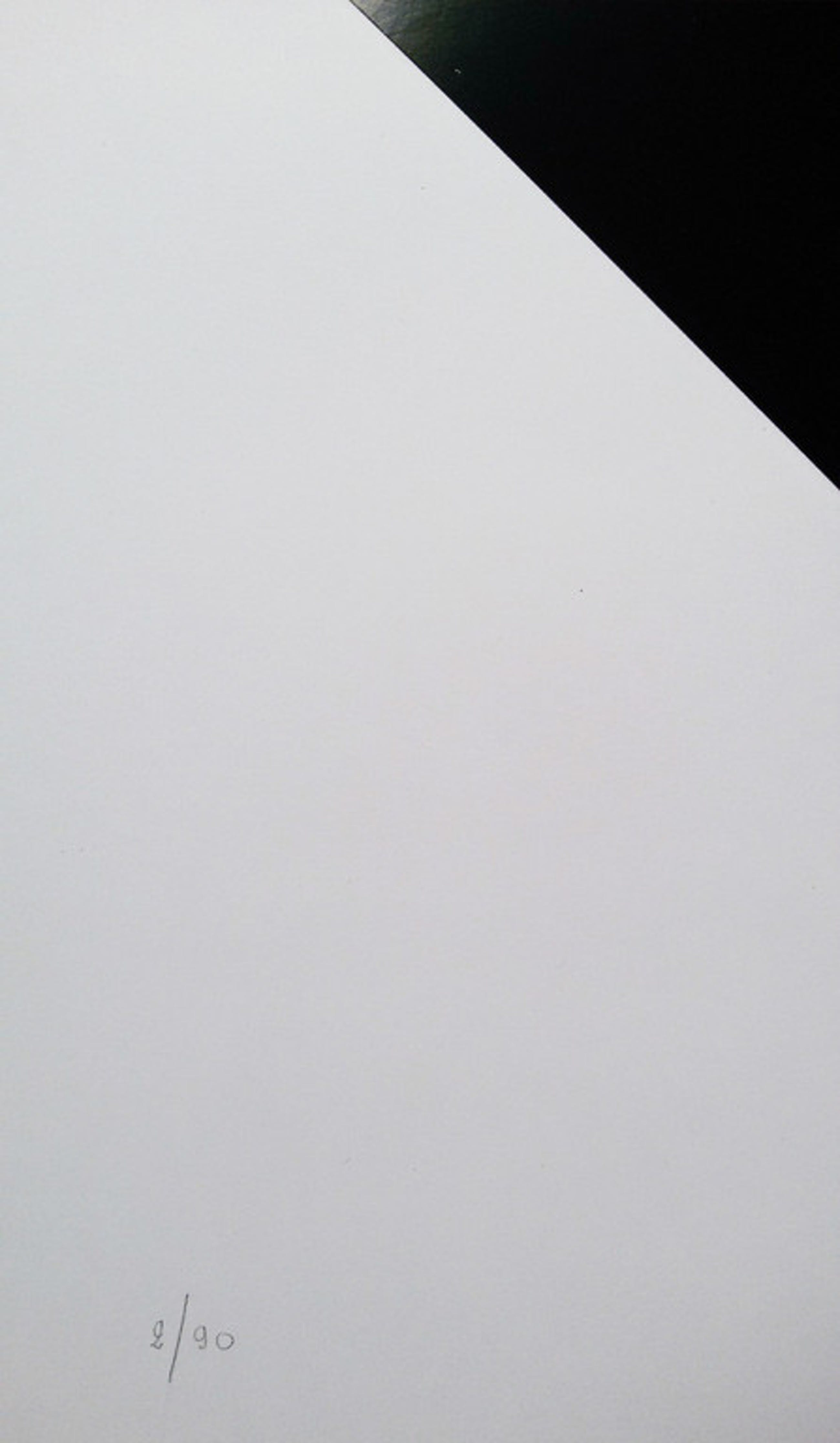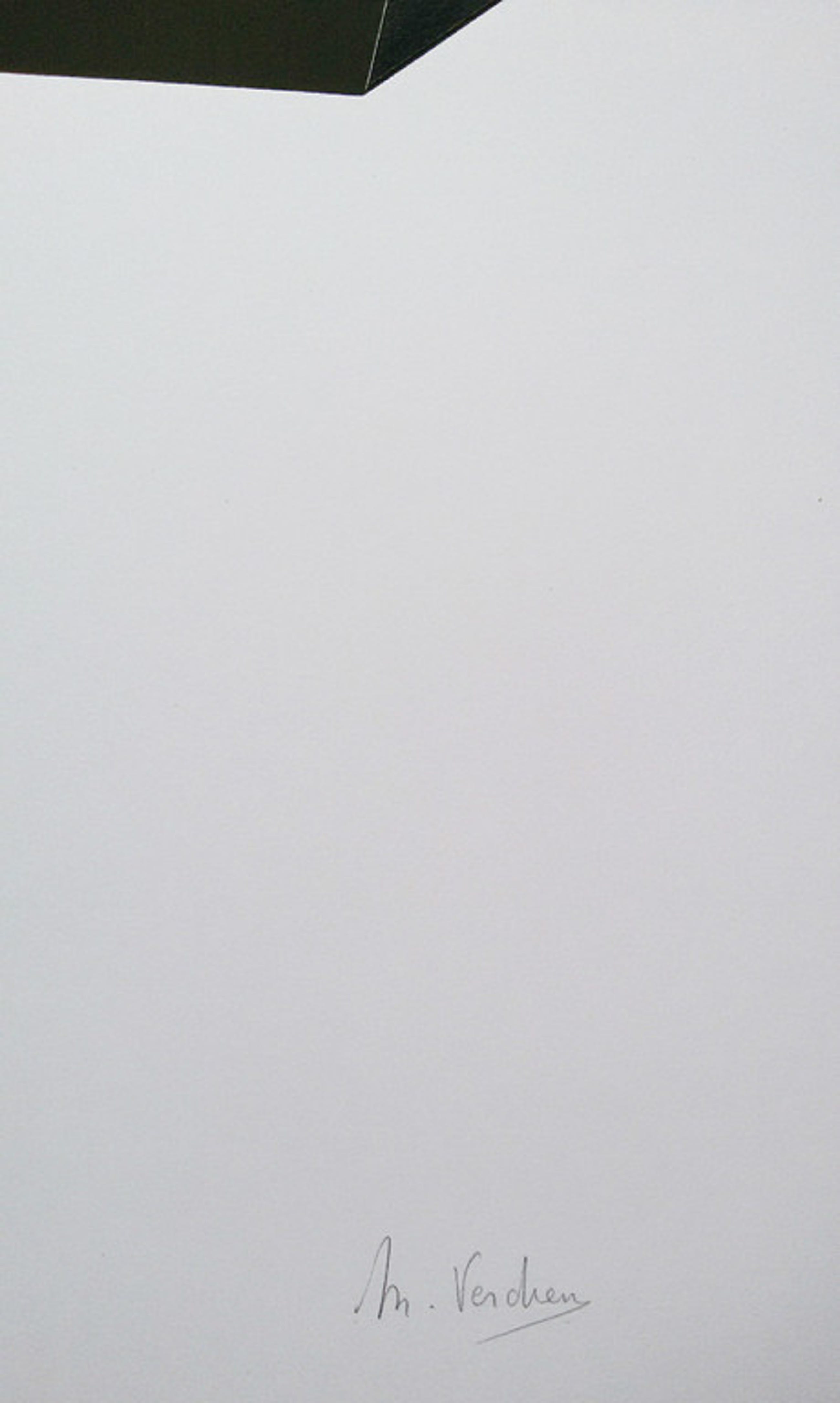 Prachtig werk van de Belgische kunstenaar Marcel Verdren (1933-1976). Zeefdruk op glad papier, zowel glimmend als mat gedrukt, zie foto 3. De lijnen tussen de zwarte vlakken zijn licht beige gedrukt, moeilijk te zien op foto’s 1 t/m 3 maar wel op foto 5. Met potlood gesigneerd, getiteld en genummerd (2/90). In uitstekende conditie.