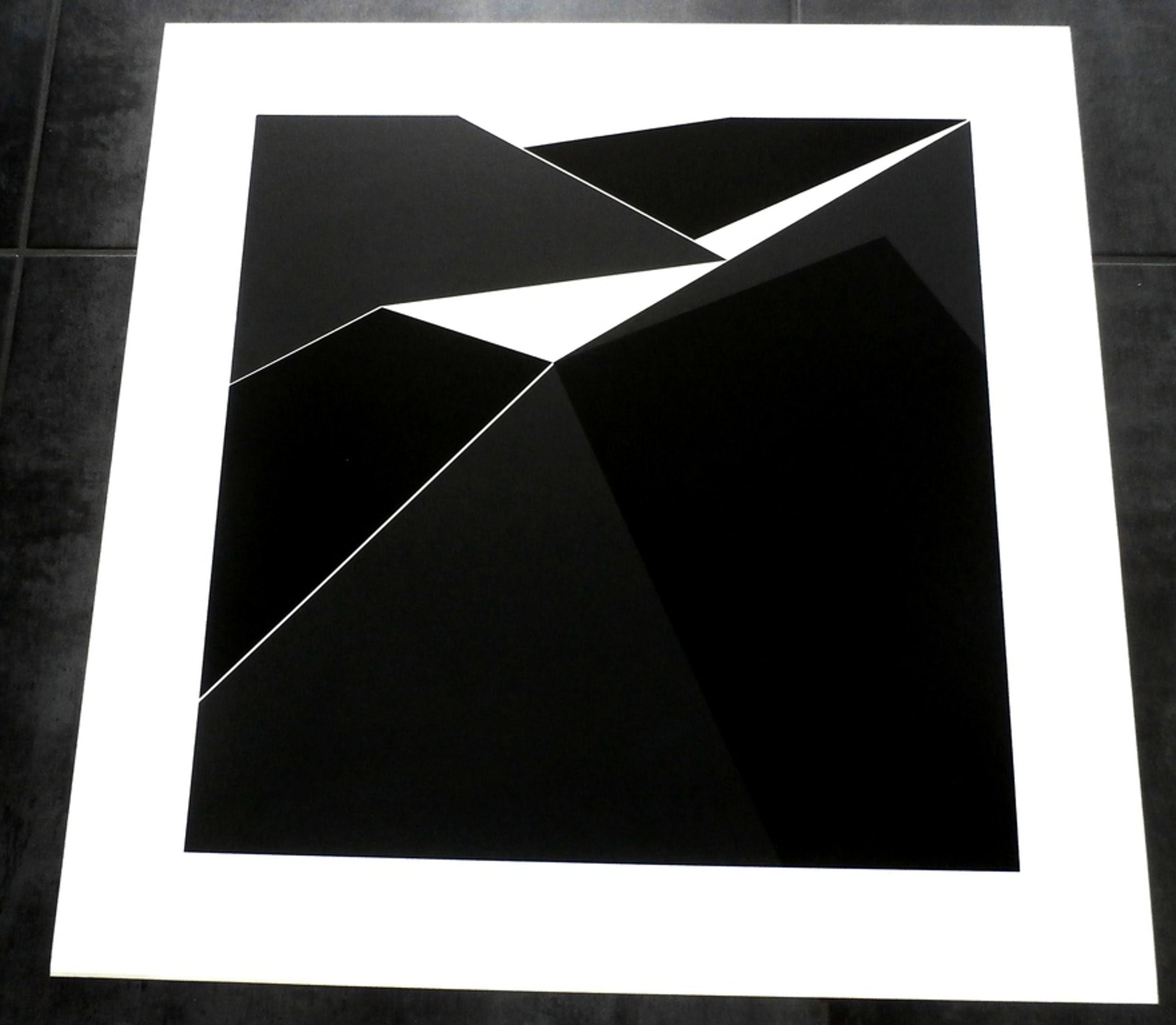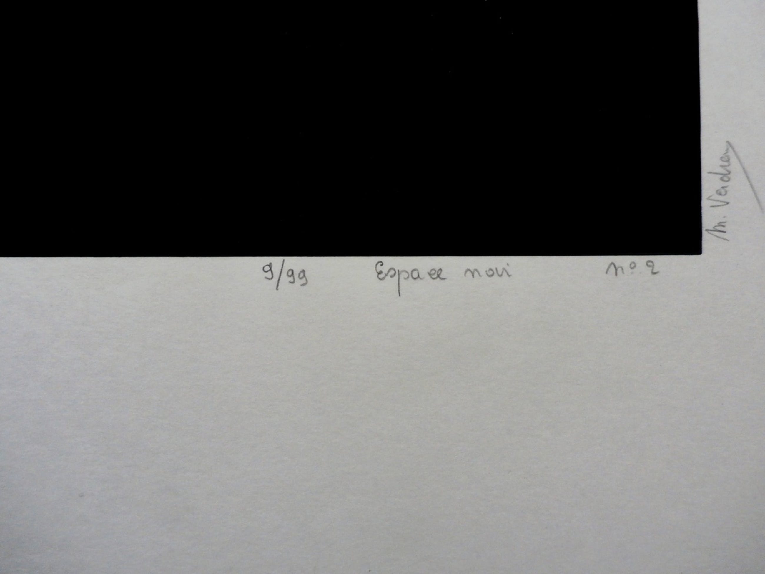 Prachtig werk van de Belgische kunstenaar Marcel Verdren (1933-1976). Hij was bekend om zijn constructivistisch of geometrisch nonfiguratief kunst. Zeefdruk op glad papier, zowel glimmend als mat gedrukt. In werkelijkheid zijn de kleuren veel helderder dan ik op de foto krijg. De lijnen en punten tussen de zwarte vlakken zijn licht beige gedrukt. Met potlood gesigneerd door de kunstenaar. Titel: Espace noir no.2. Nummer : 9/99. Afmetingen blad: H 70 x b 70 cm. Afmetingen voorstelling: H54,5 x b54,5 cm. In goede conditie. Herkomst: nalatenschap Henk van der Vet (drukker).