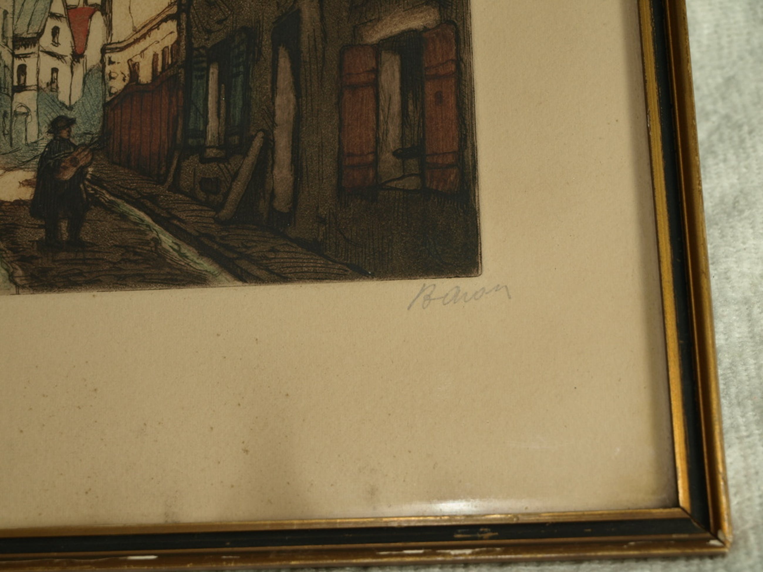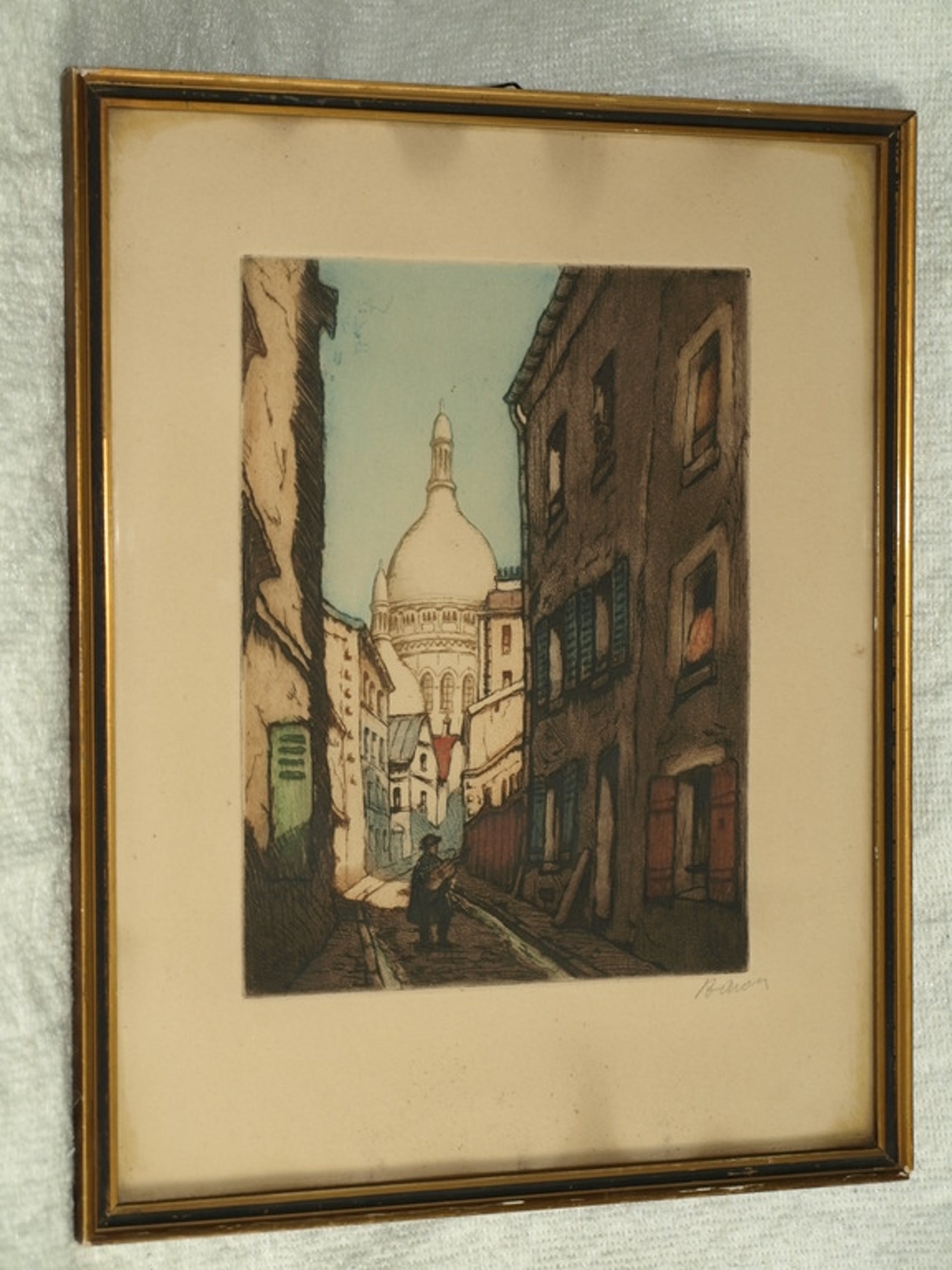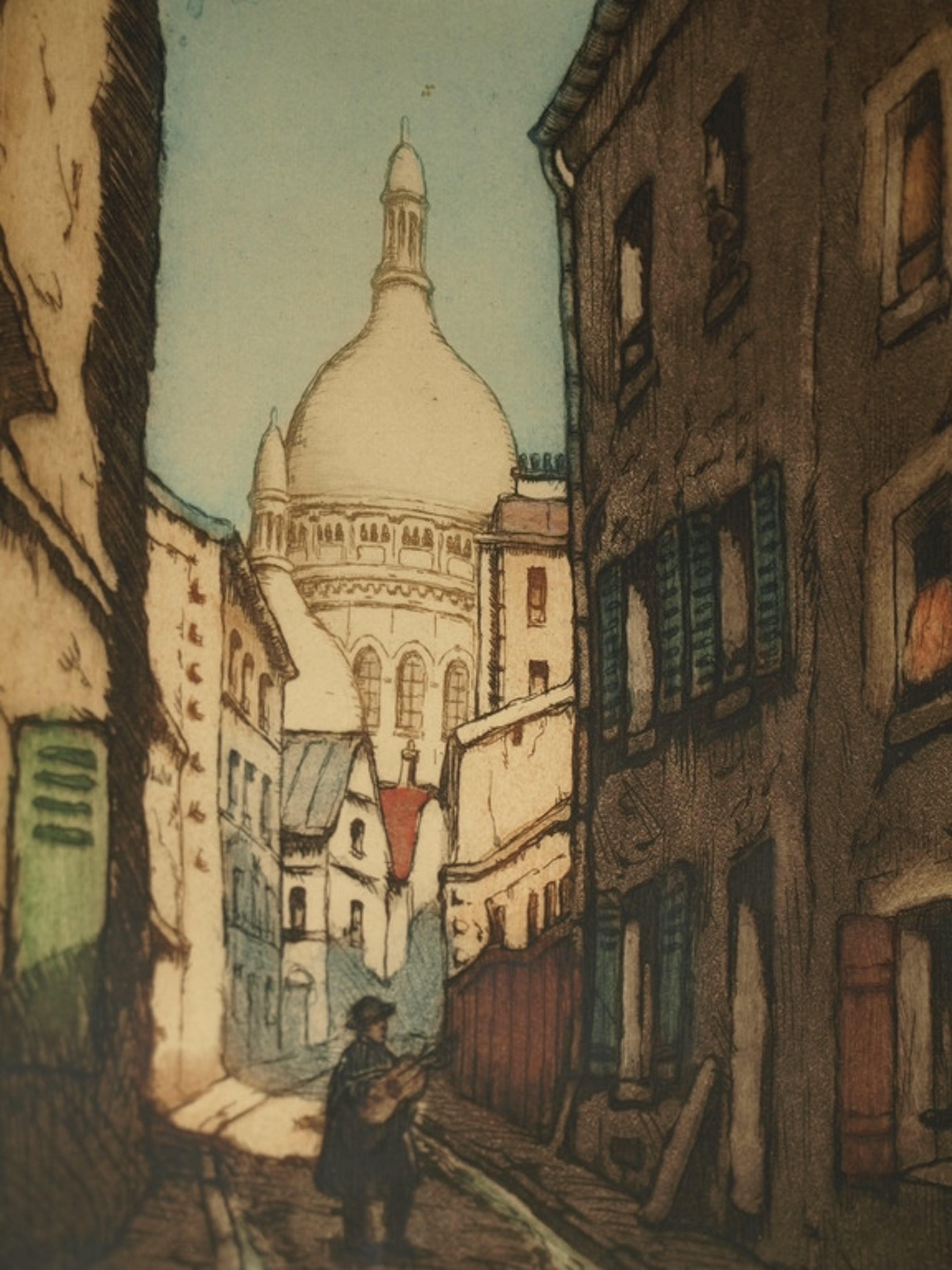 Een ets en aquatint van de Franse kunstenaar Marcel Julien Baron met een voorstelling van een muzikant in een straatje in Parijs met op de achtergrond de basiliek “Sacré-Coeur”. Gemaakt in ca 1930.