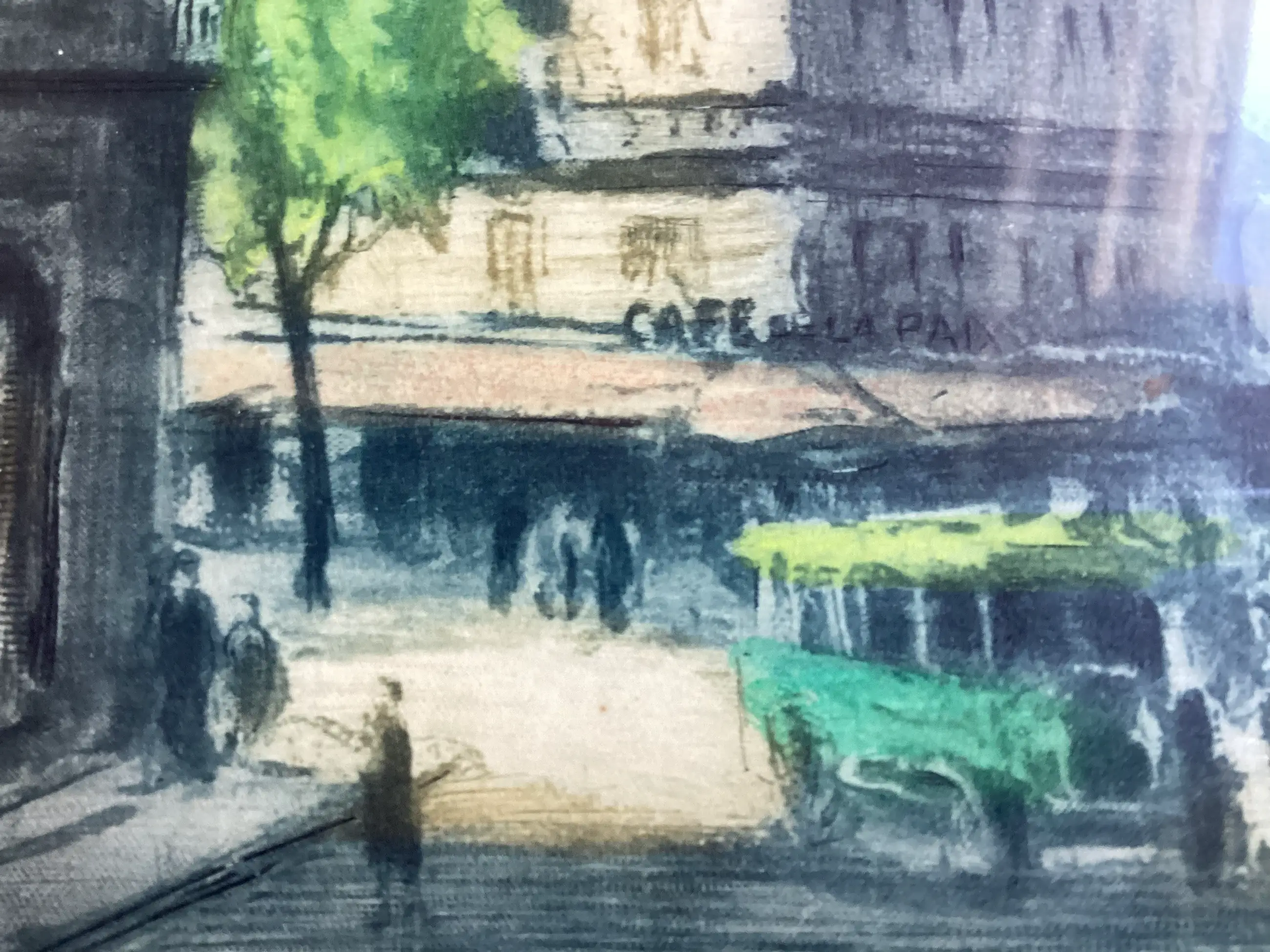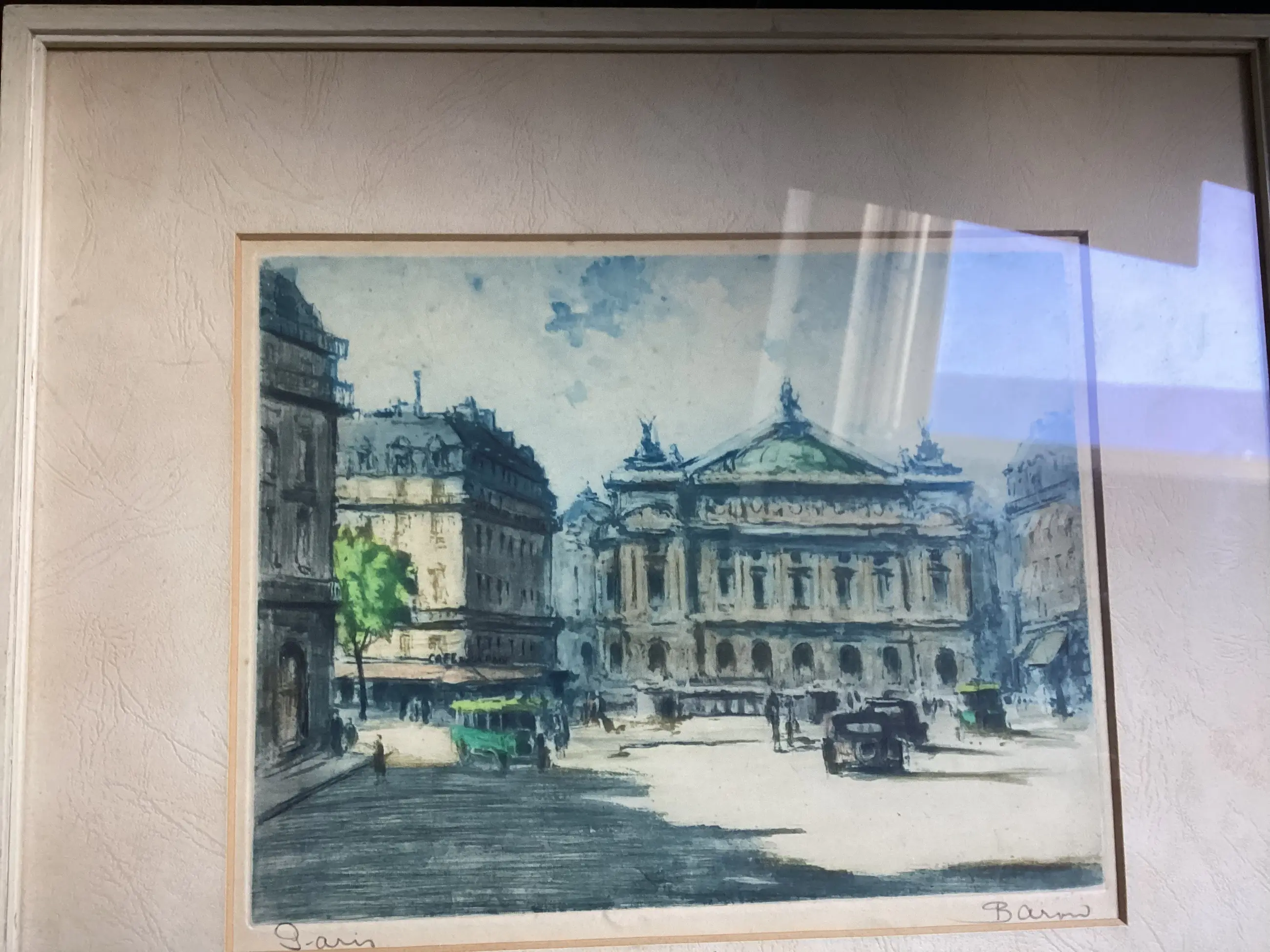 Ruim 100-jarige ets/aquatint van Marcel Julien Baron: Paris. Potlood gesigneerd r.o. Formaat incl witte houten lijst 35 x 31 cm.