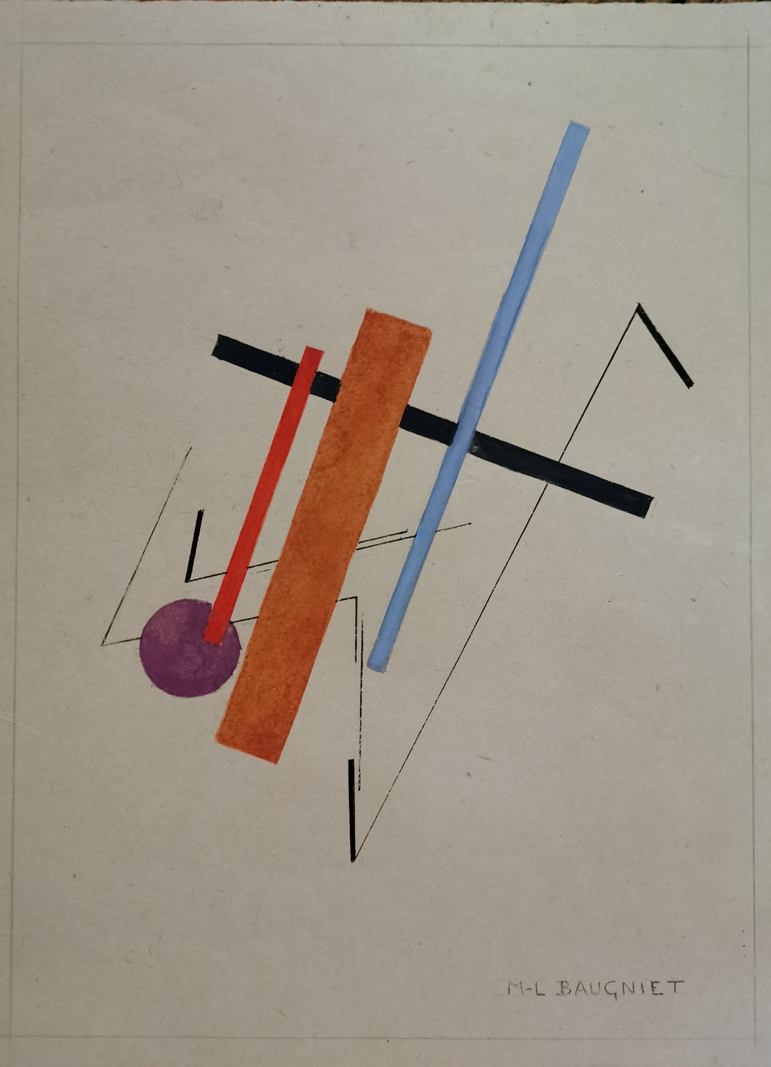 Oude abstracte compositie uit aquarel op papier in Avant Garde/Constructivistische stijl. Gesigneerd rechtsonder: M L BAUGNIET.
