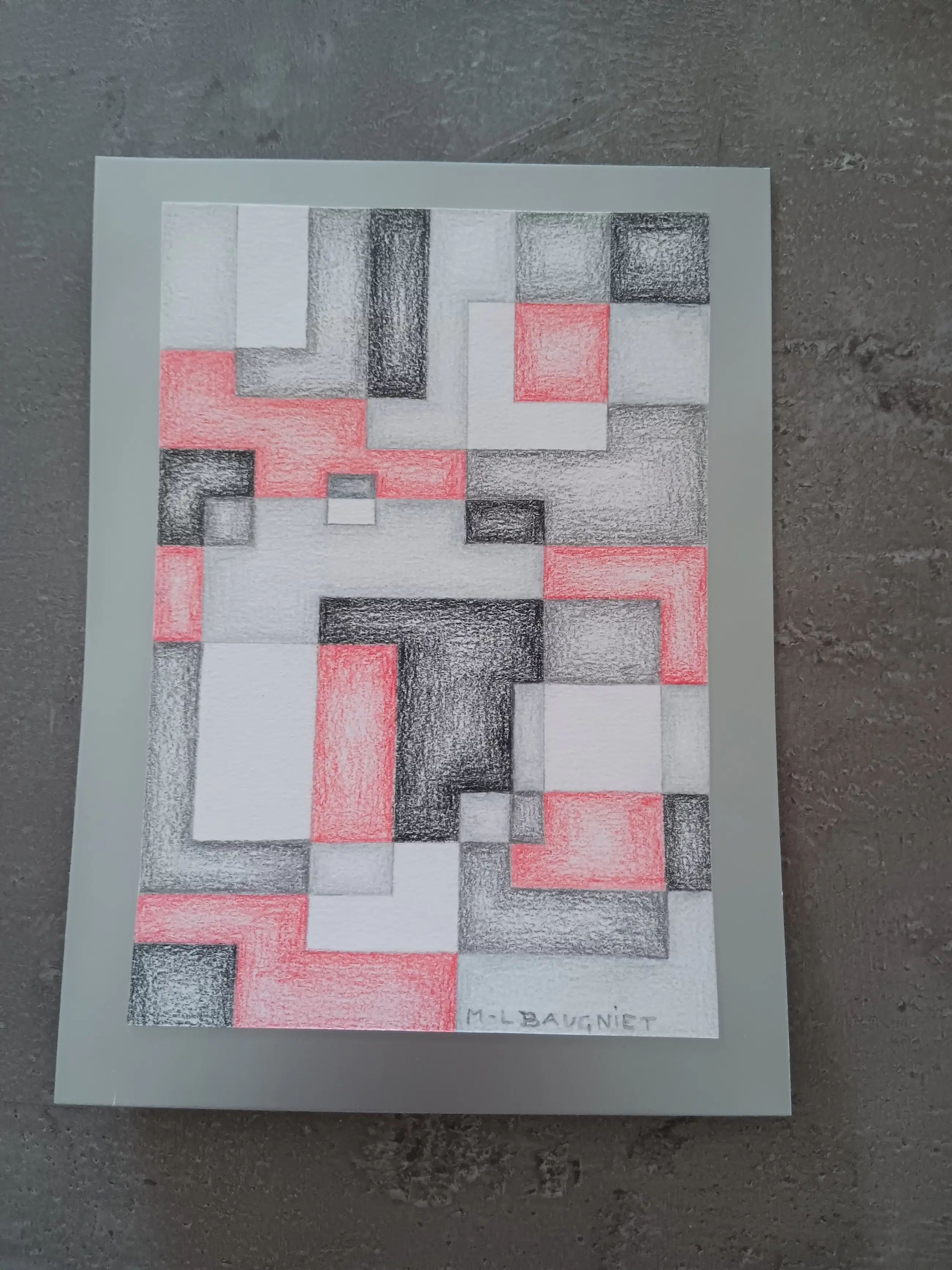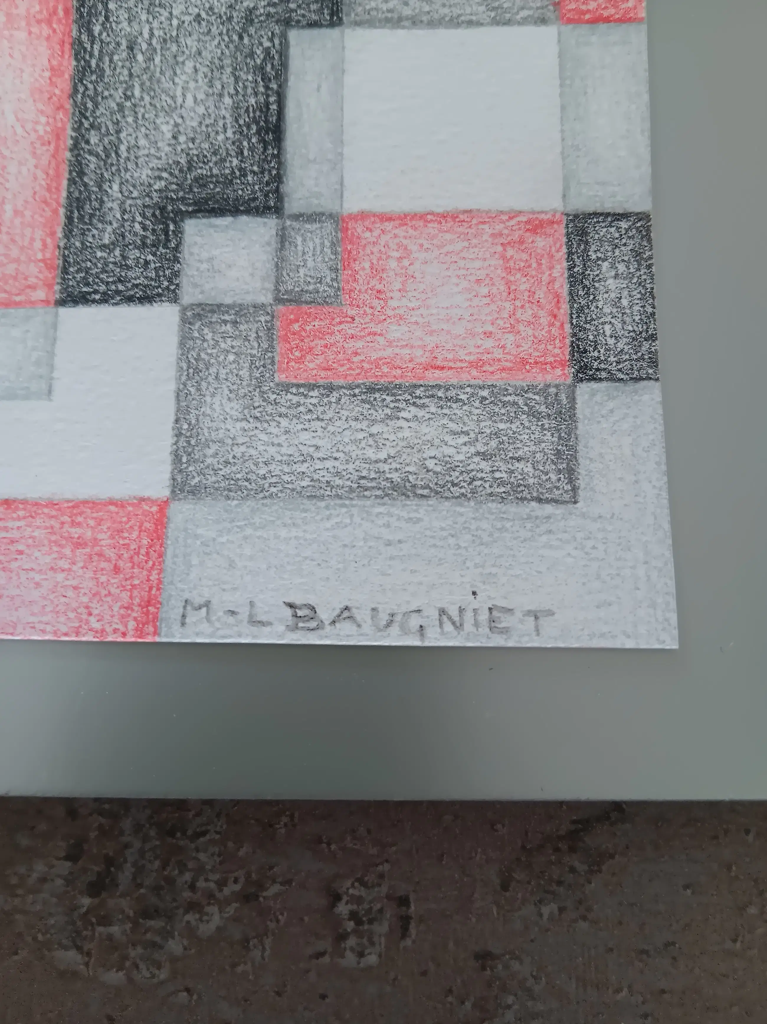Deze compositie combineert overlappende rechthoeken en kubistische vlakken in zwart, grijs en rood, opgebouwd met zachte arceringen en subtiele licht-donkergradaties. De techniek en stijl sluiten aan bij Baugniet’s late constructivistische periode (circa 1965–1980), waarin hij vaak werkte met potlood en kleurpotlood voor zijn voorbereidende studies.