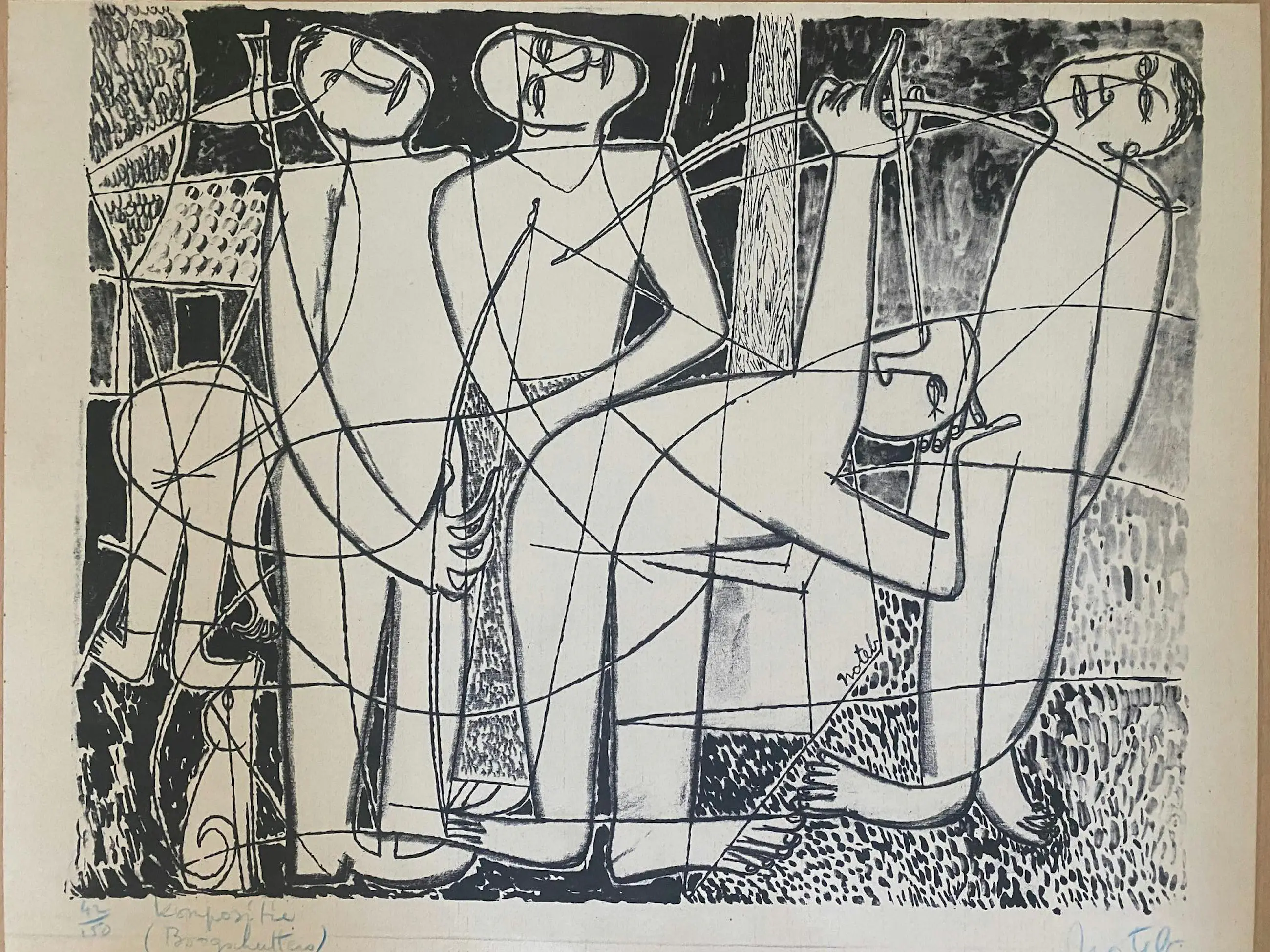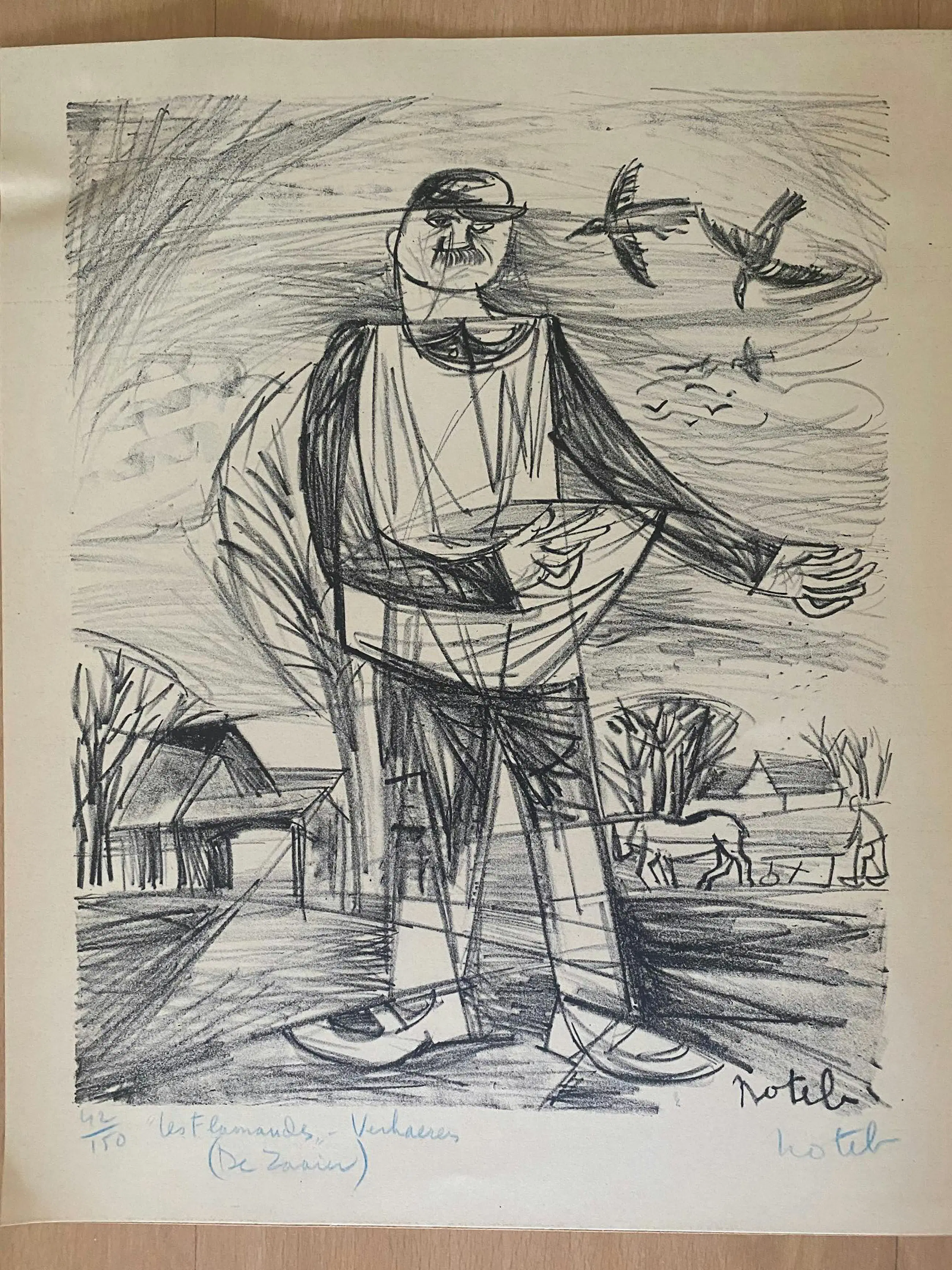 Verzameling van 8 zwart-wit tekeningen, deel uitmakend van een map op 150 exemplaren (nr 42/150). In juni 1956 geschonken door de kunstenaar aan Maurits Duyck, toenmalig schepen van cultuur van de stad Kortrijk (zie laatste foto). Zie ook https://www.artprice.com/artist/44540/marcel-notebaert?cl=en# https://rkd.nl/artists/93349 https://nl.m.wikipedia.org/wiki/Marcel_Notebaert