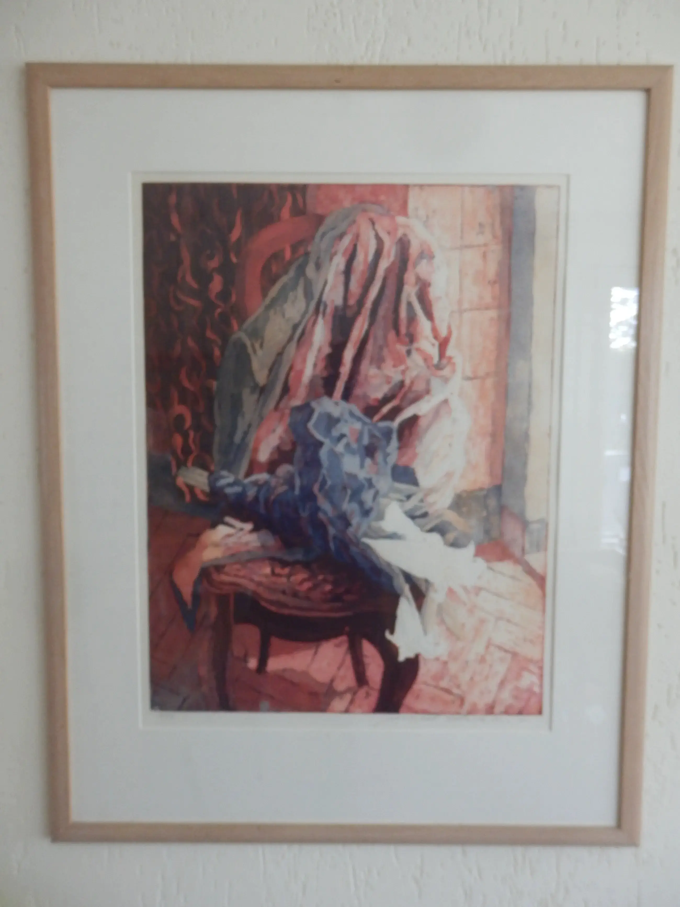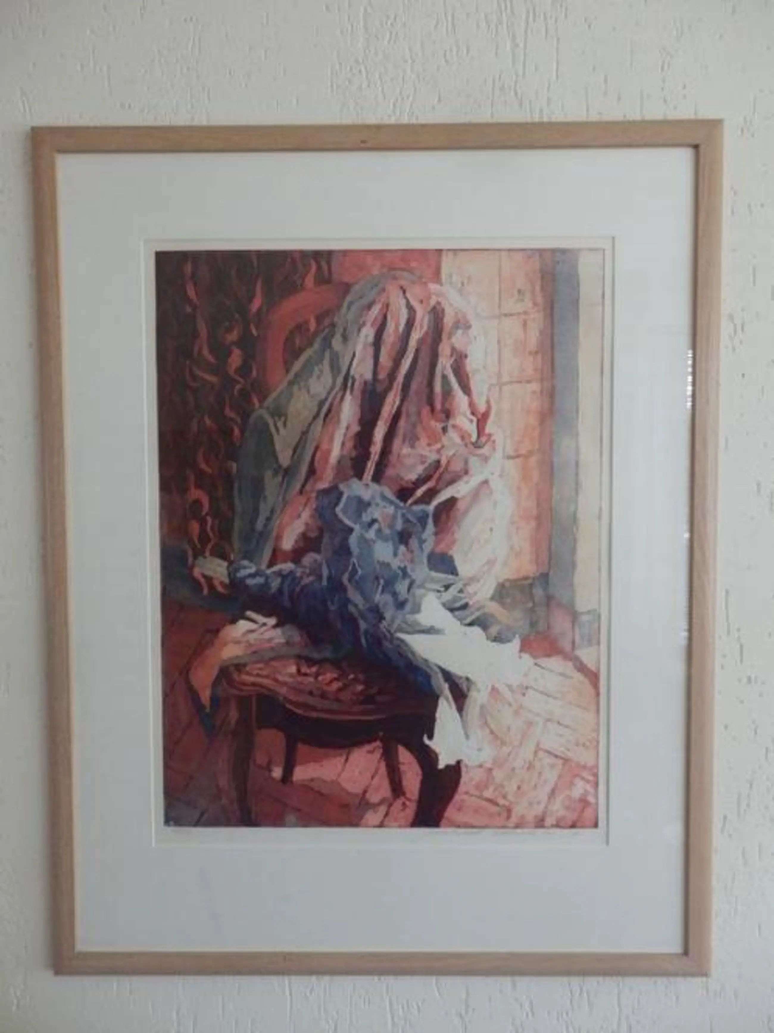 Kleurets van Kleding op Stoel uit 1991. Lijstmaat 73x93. Uitgebracht in een oplage van 50, dit is nr. 13. Zuurvrij ingelijst in een exclusieve Barth-wissellijst. Met potlood gesigneerd, gedateerd en genummerd. Zeer mooie staat.