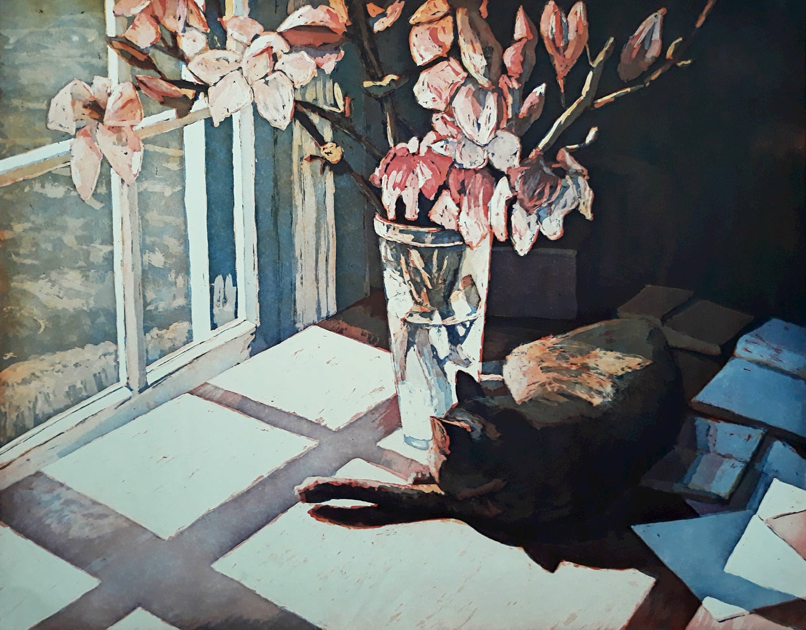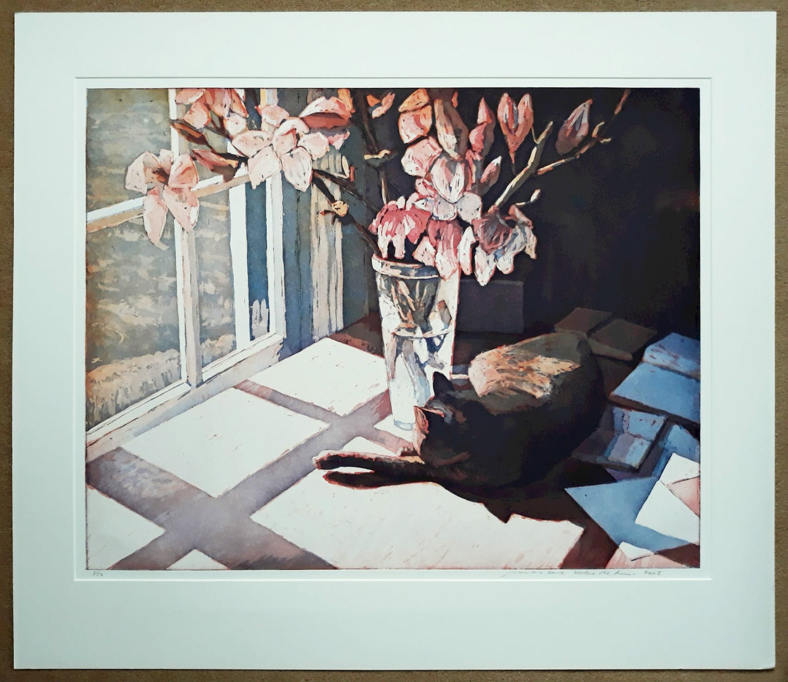 Zeer grote, sfeervolle ets van Marcel Schellekens. Dat licht mensen, je zou toch zelf uren in die vensterbank willen liggen.